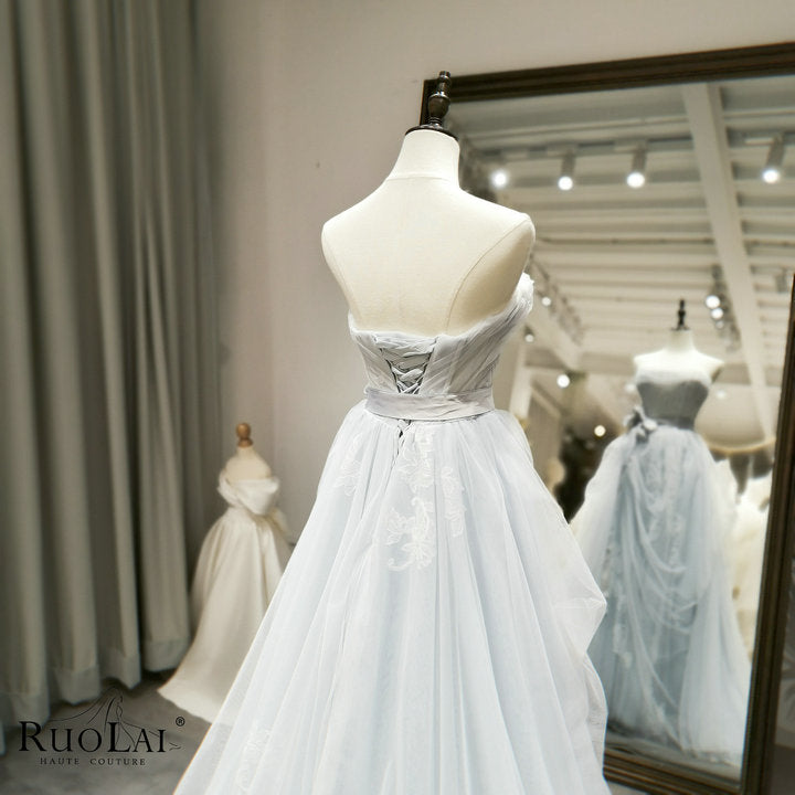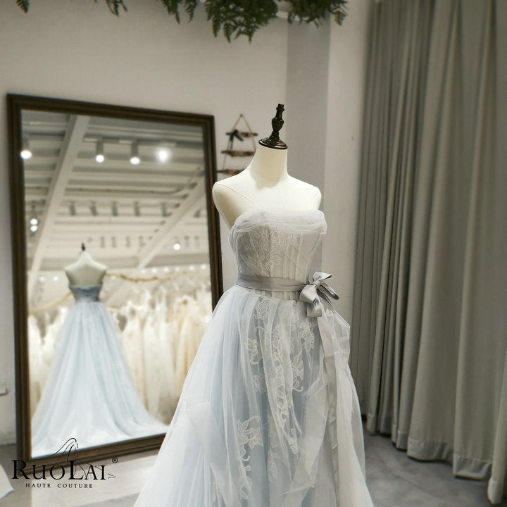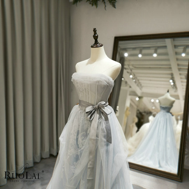 This elegant light blue lace evening gown features delicate lace details for a refined and elegant look. A bow belt at the waist adds a touch of elegance, perfect for formal occasions. Designed to highlight the curves of the skirt, this gown perfectly blends classic elegance with modern glamour, making it the perfect choice for evening events where style and grace are paramount.