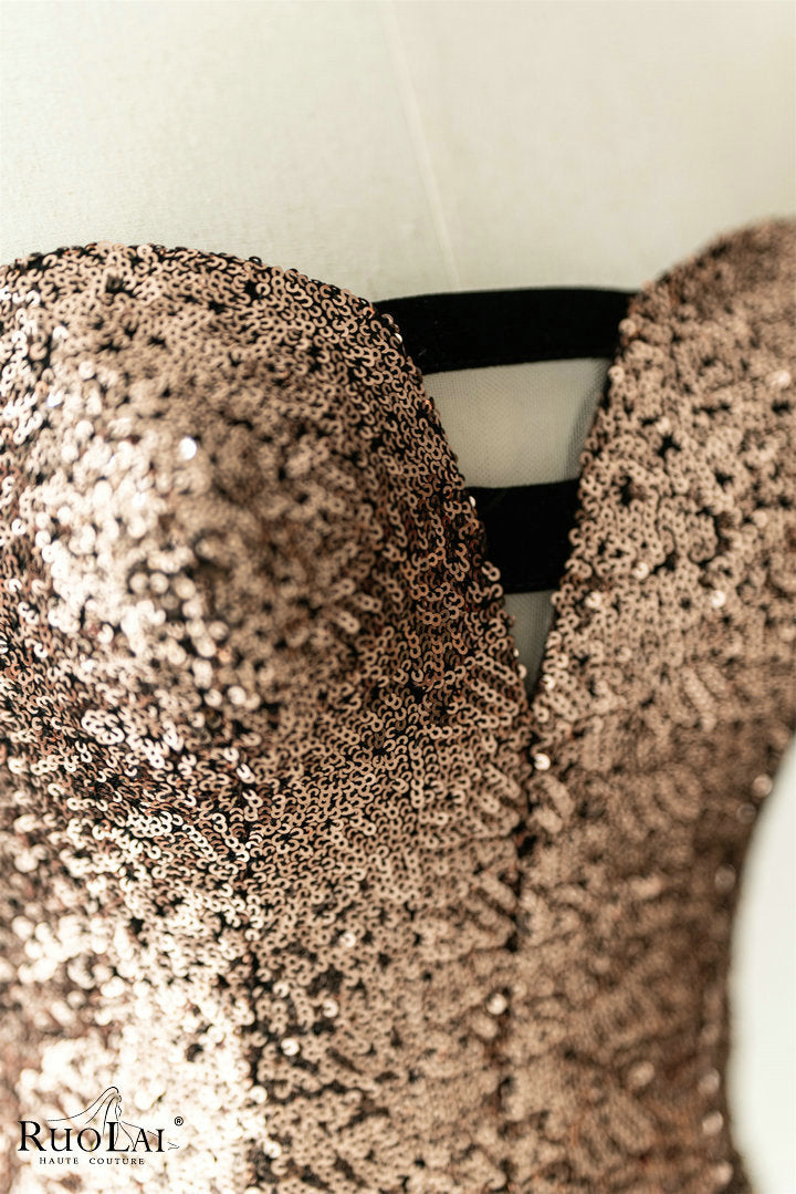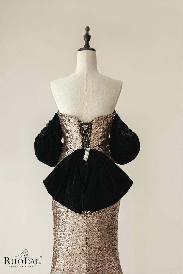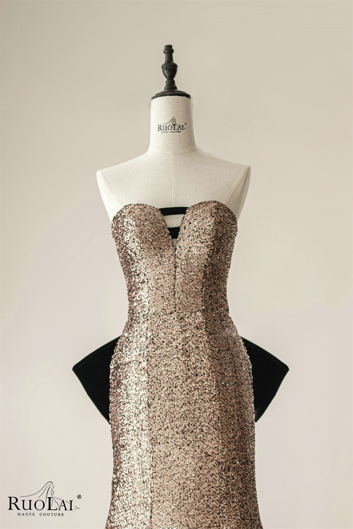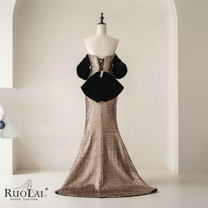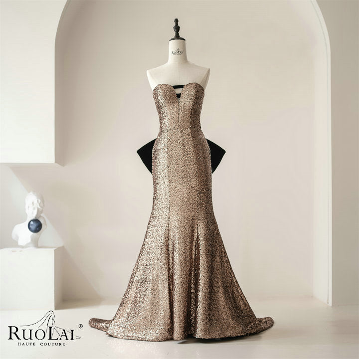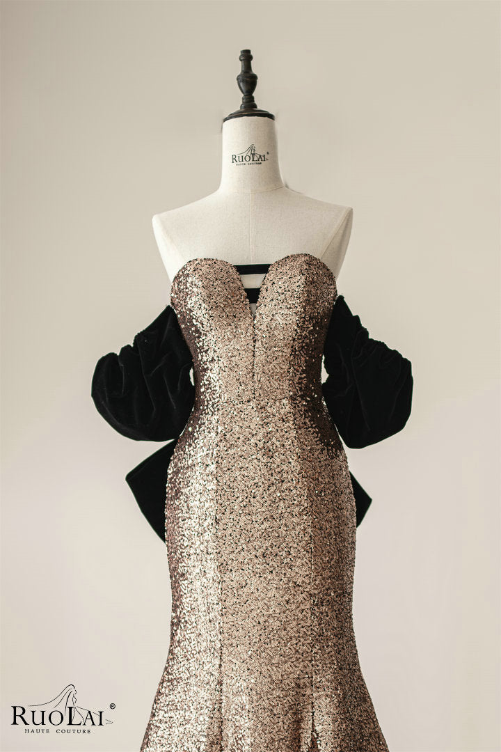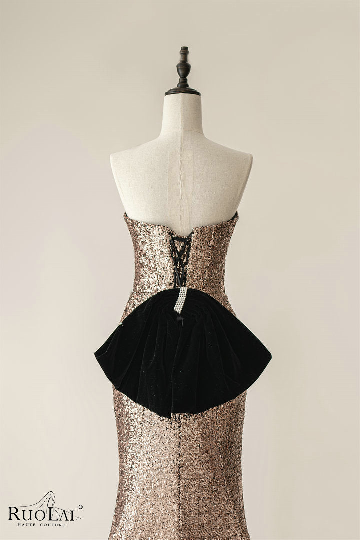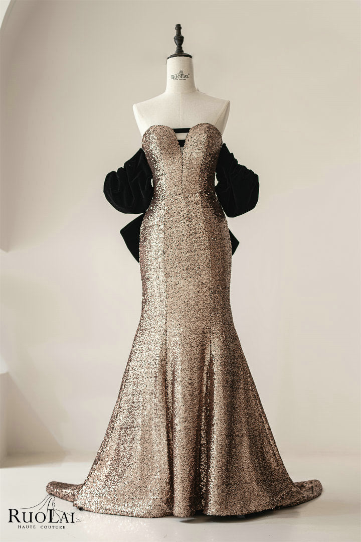 Gold Sweetheart Neck with Black Bow Mermaid Sexy Party Dress Pearls Strapless Beading Gown Evening Dress