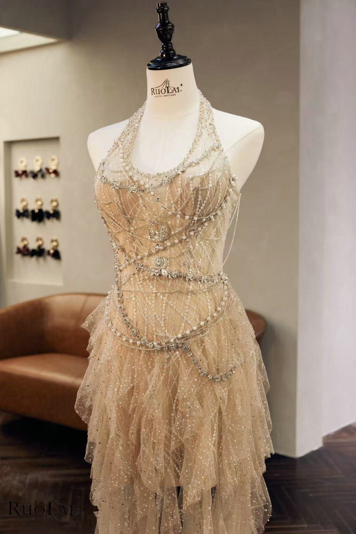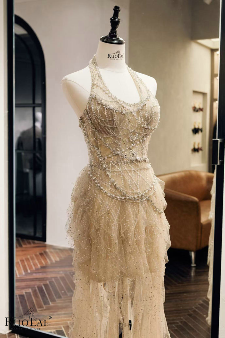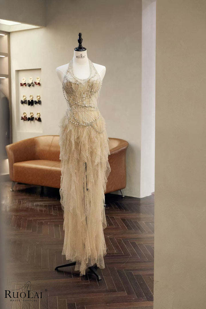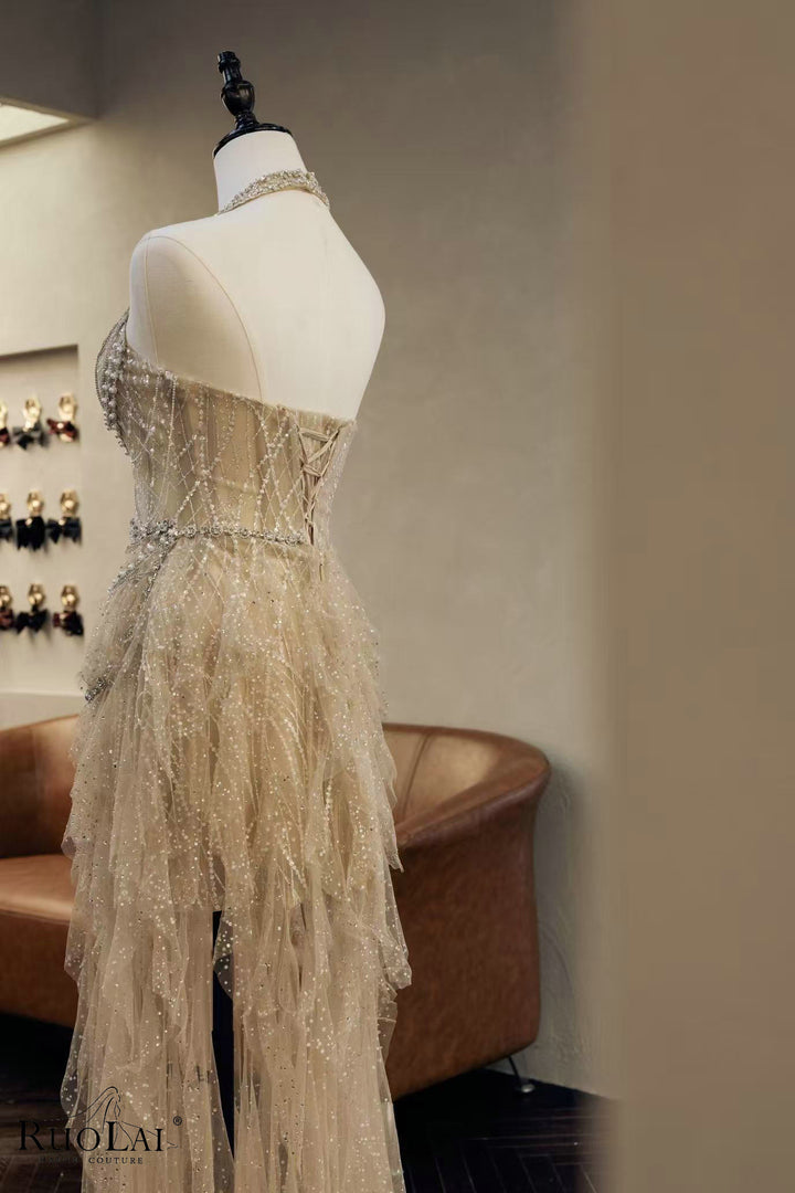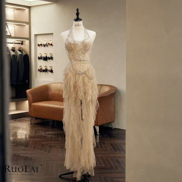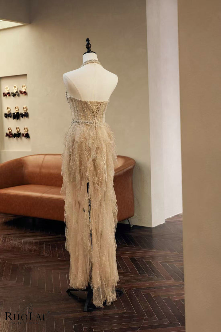 New Design V-Neck Spaghetti Strap Feathers Beading Mermaid Dress for Women Party Halter Neck Sequins Tulle Irregular Prom Dress