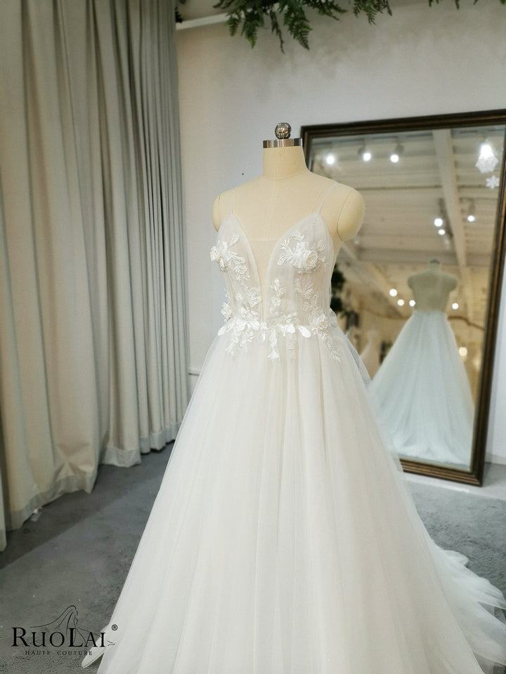Simple Spaghetti Strap Lace Appliques V Neck Bridal Dress