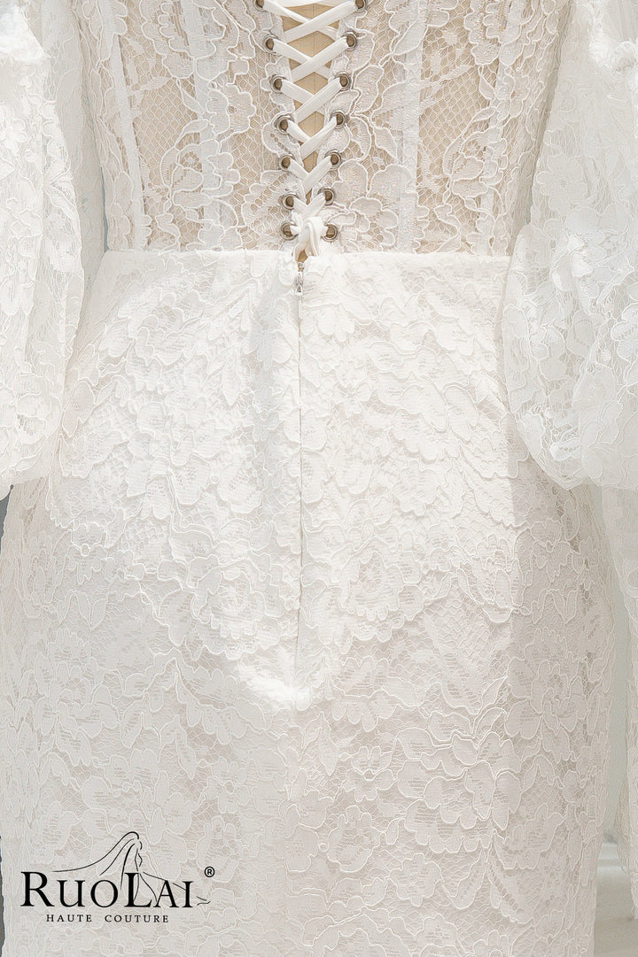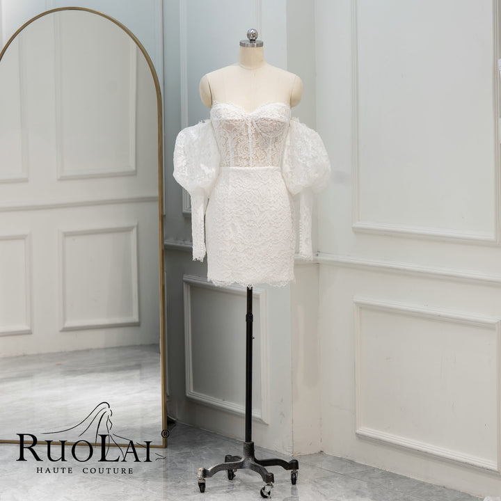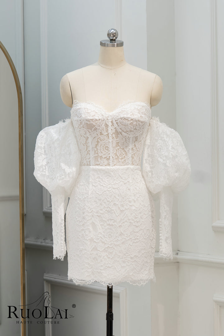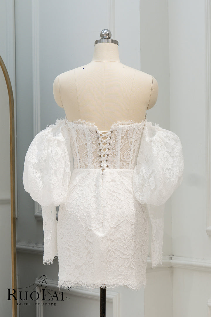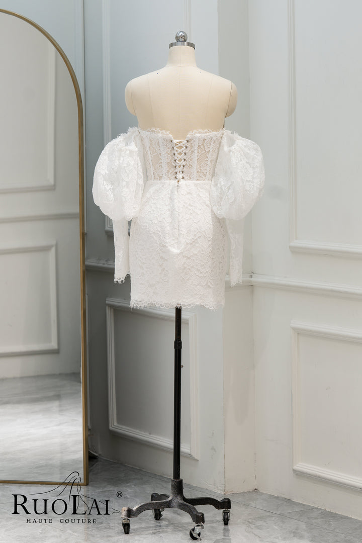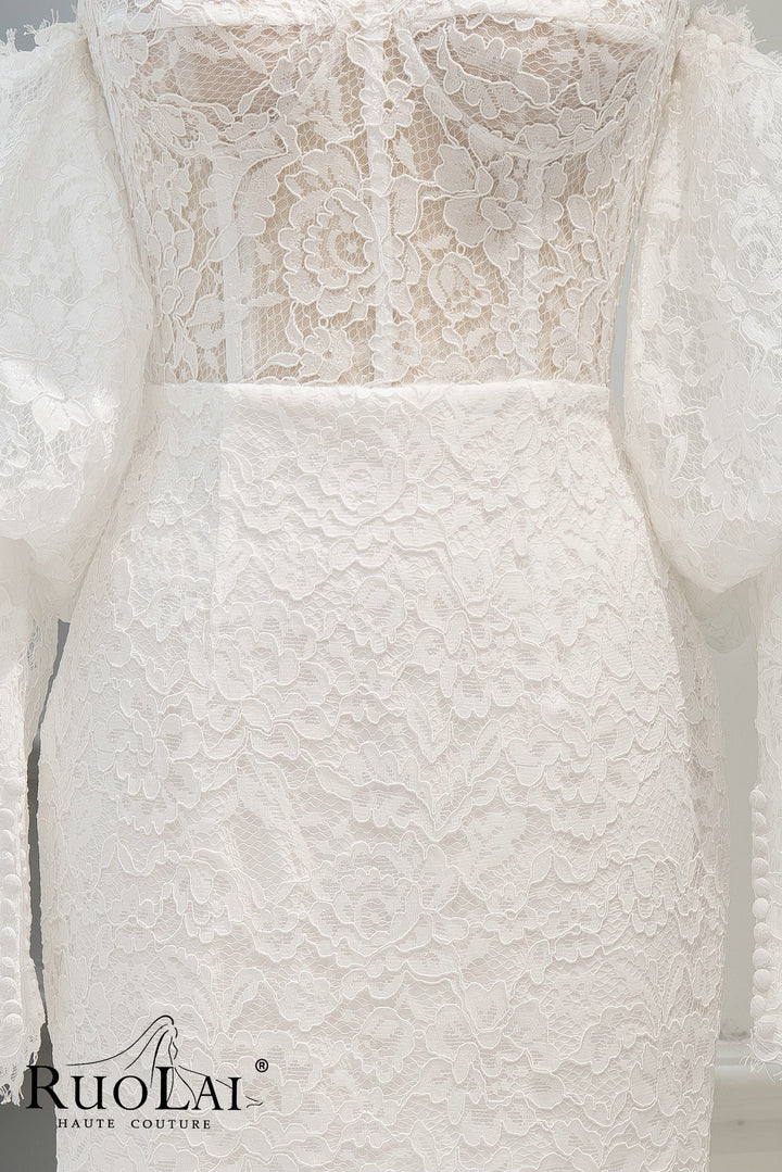 Unique Off The Shoulder Sweetheart Neckline Bridal Dresses Mermaid Ivory Mini Length Laced Wedding Dress Long Lantern Sleeve
