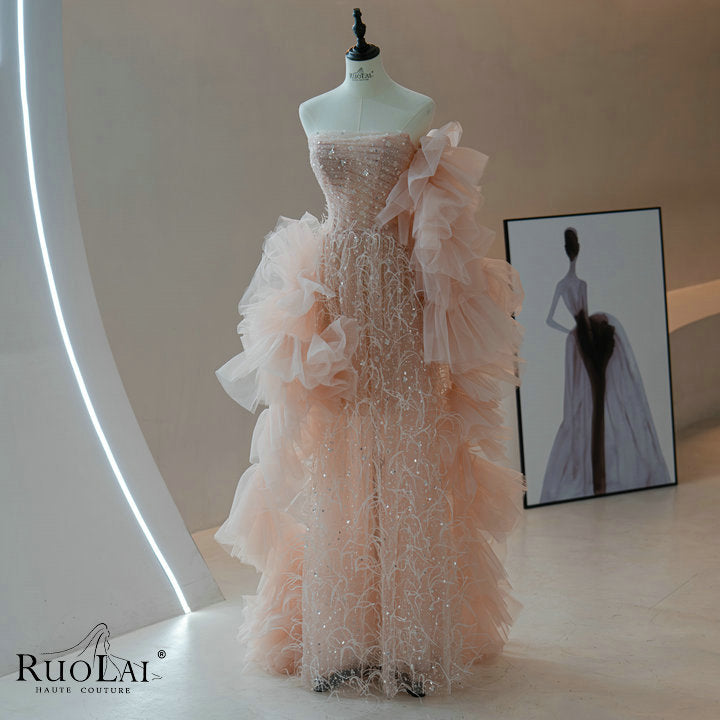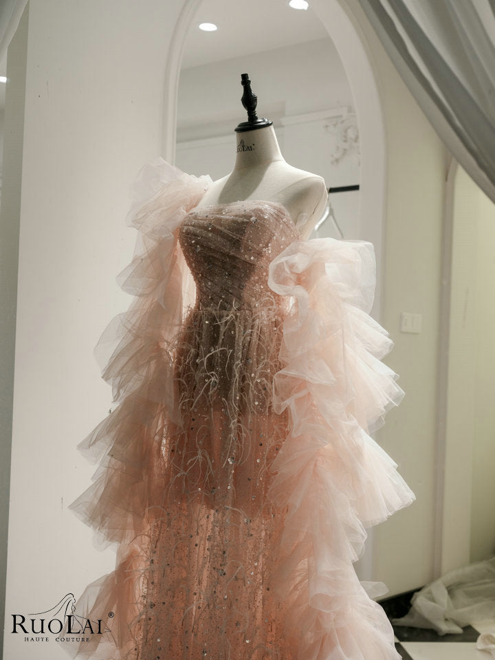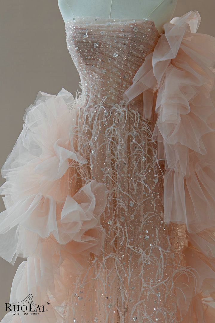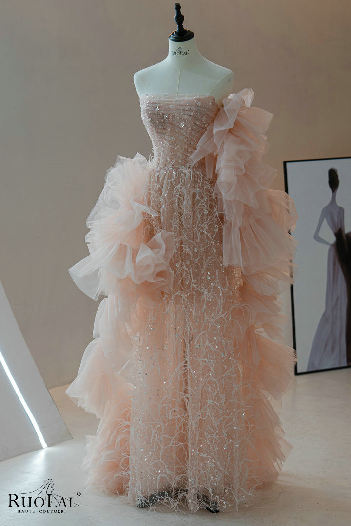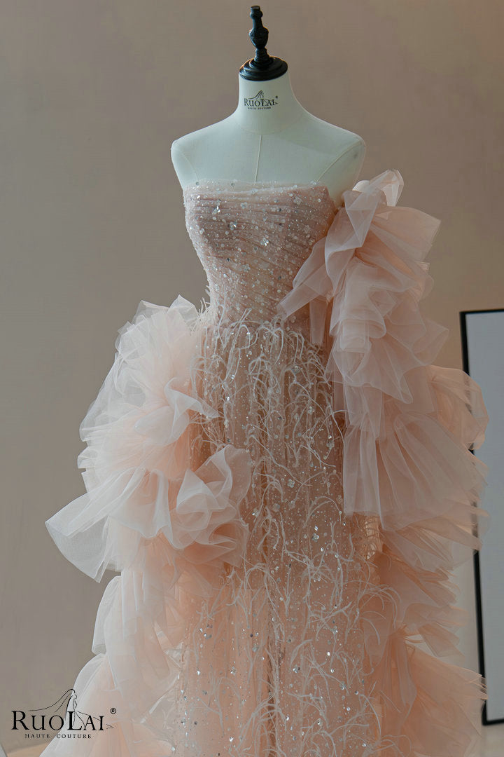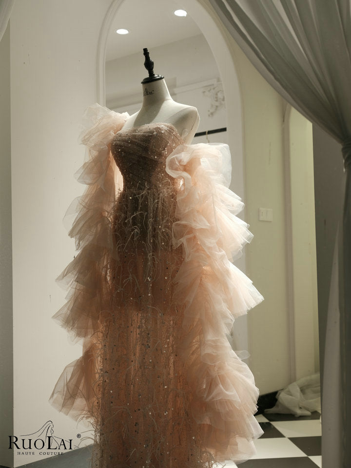 Luxury Boat Neck Sleeveless Ruched Pleated Ruffled Tulle Ostrich Feather Women Party Sequin Evening Gown Dress