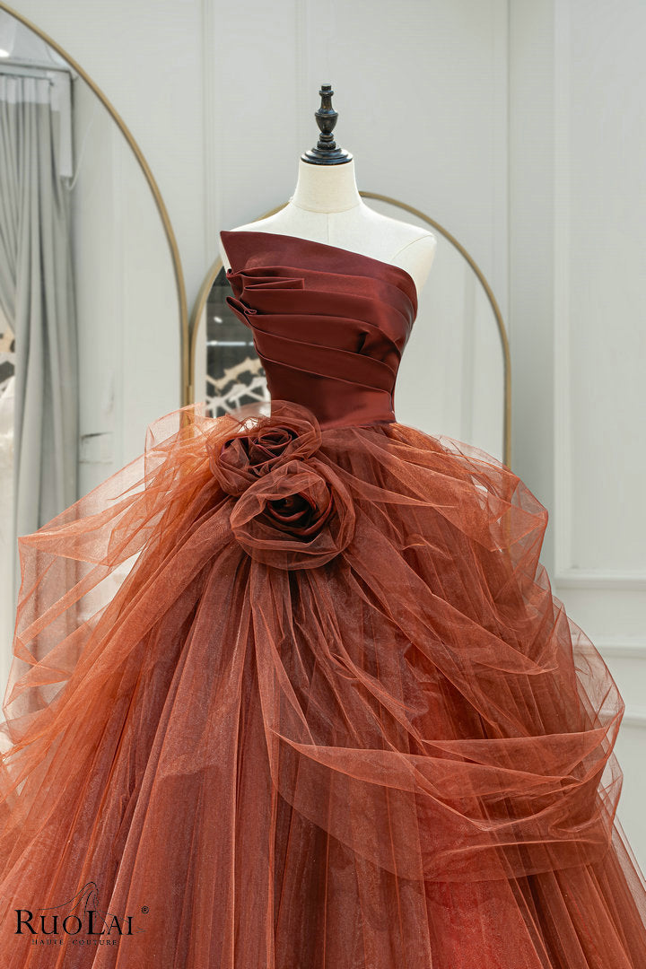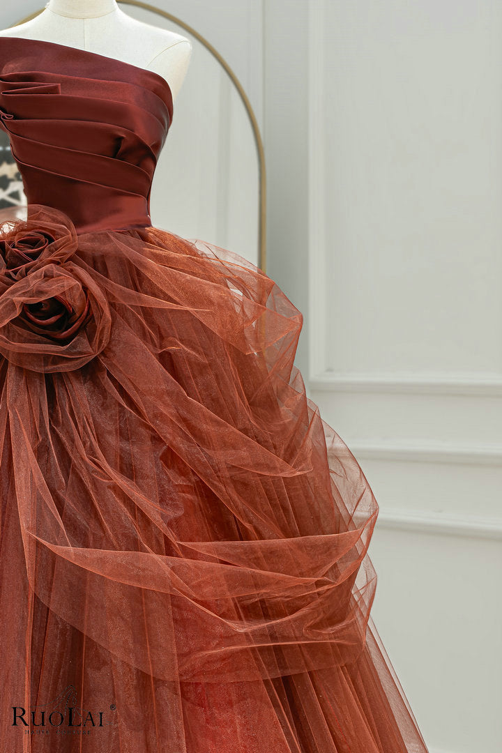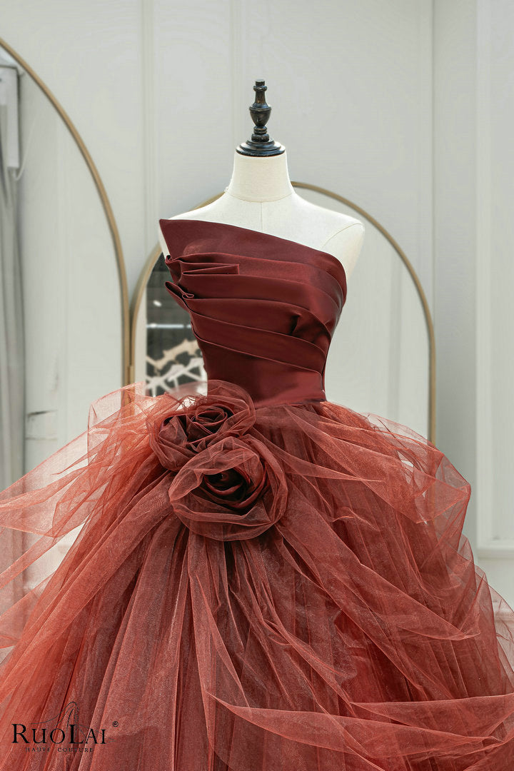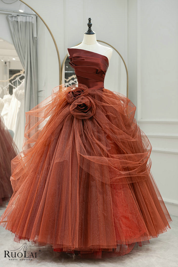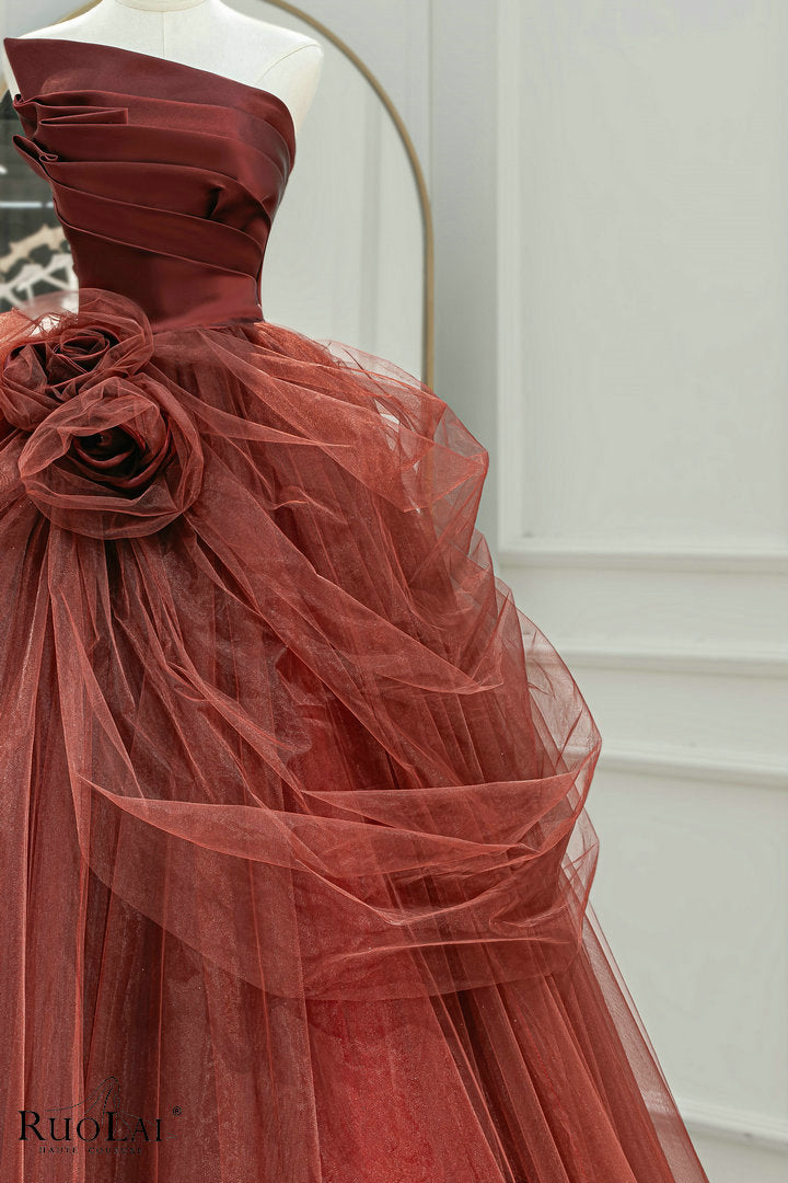 LWC6875 Red Tulle Strapless With Flower Ball Evening Gown