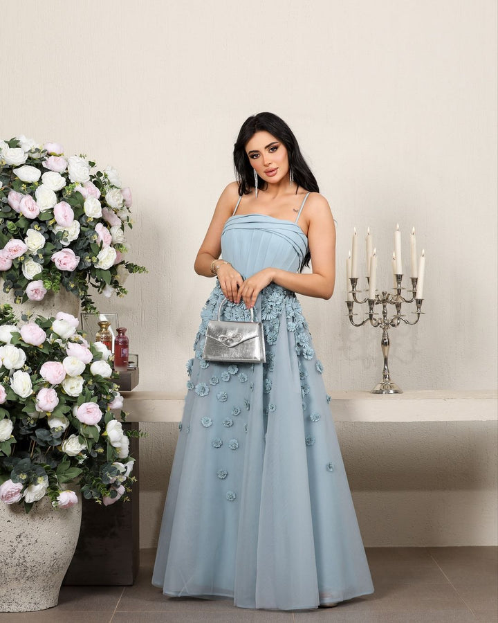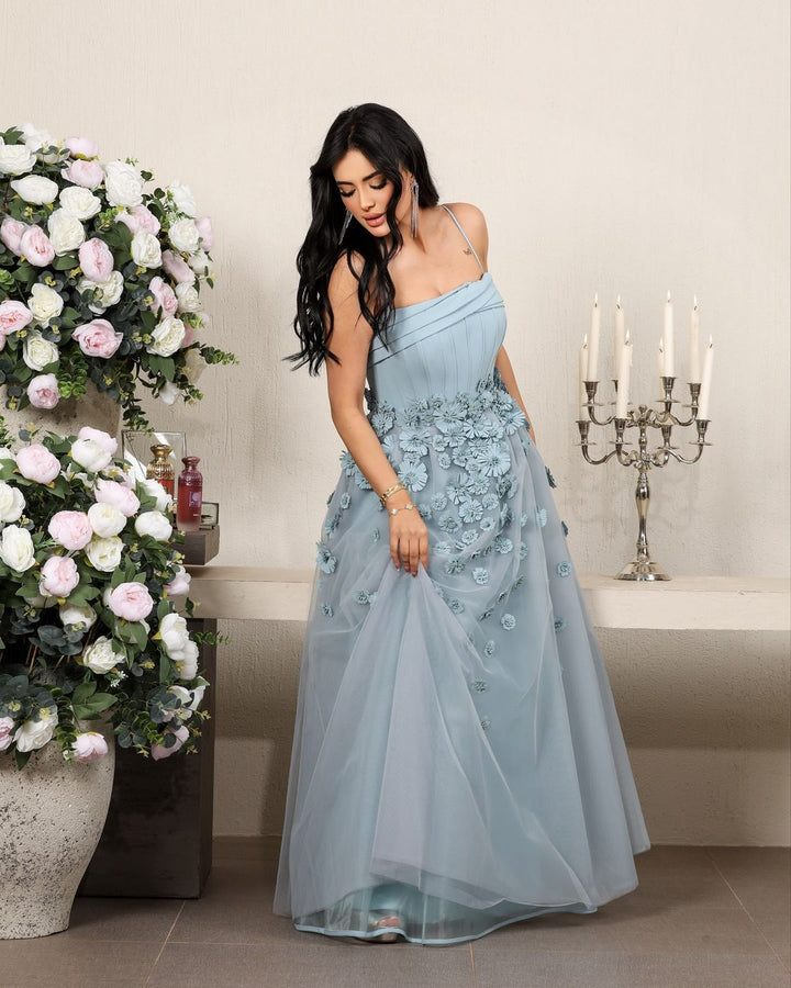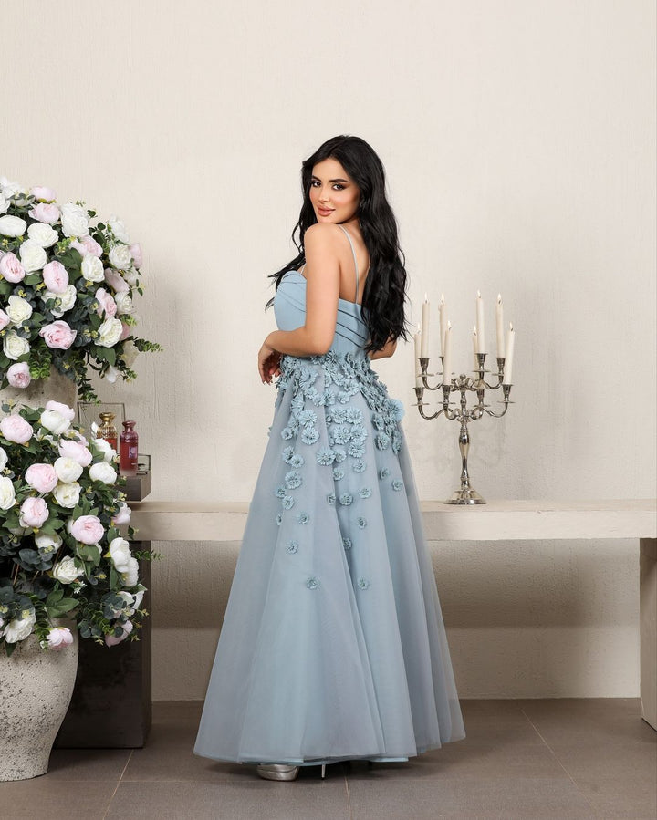 Blue Sky Spaghetti Straps Prom Dress Women's Tulle Satin 3D Flower Draped a Line Women's Formal Evening Dress