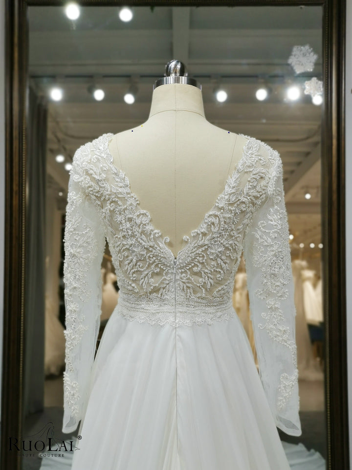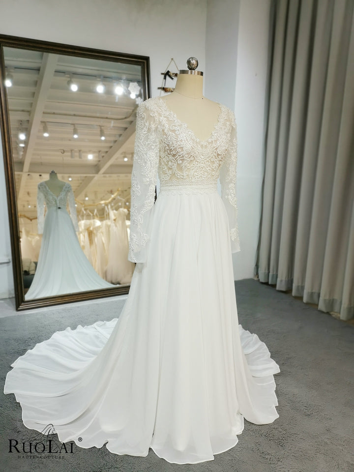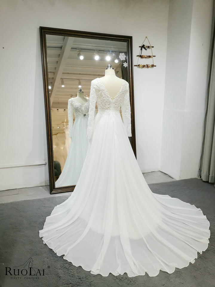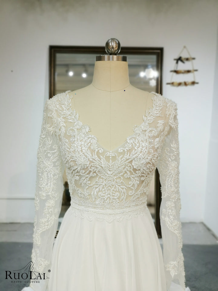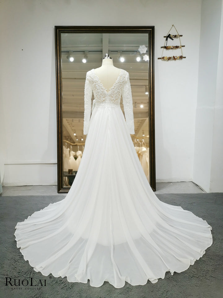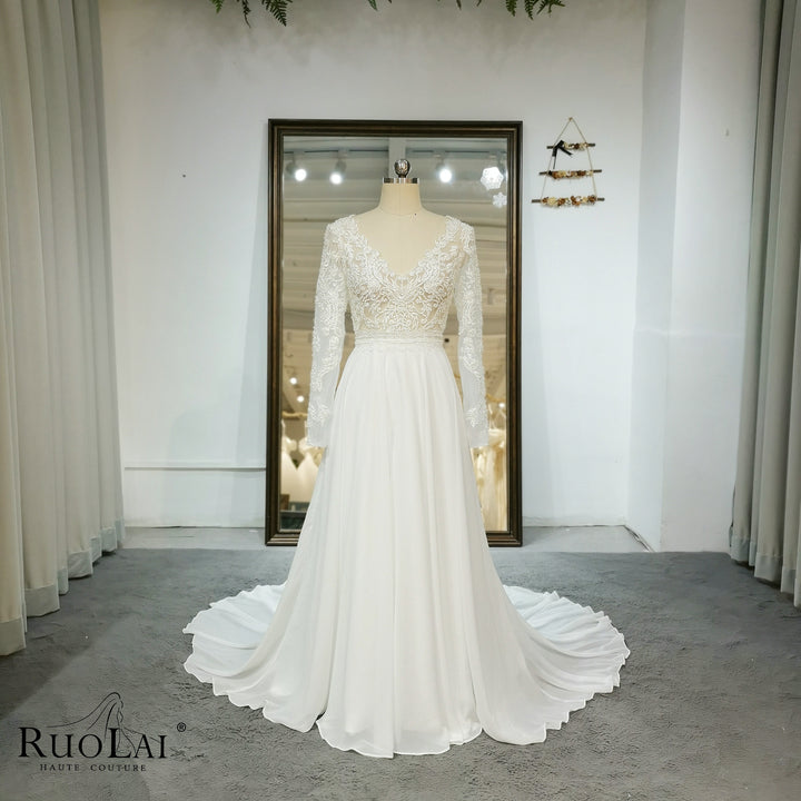 Customized Bohemian Beading A Line Chiffon Wedding Dresses V Neck Elegant Long Sleeve Lace Applique Backless For Women Bridal Gown