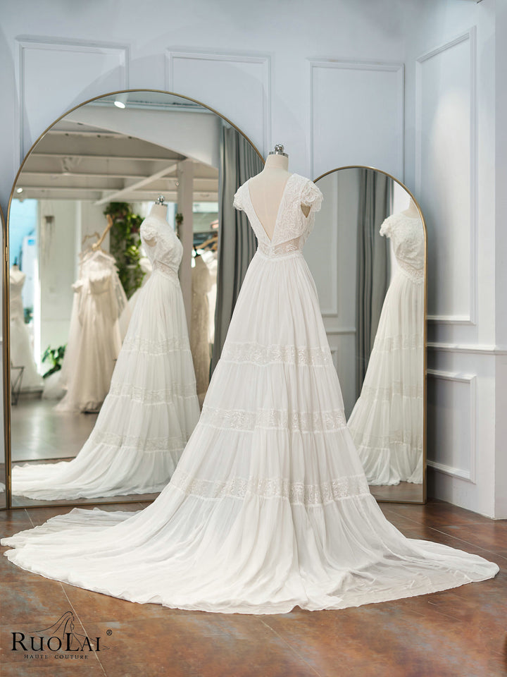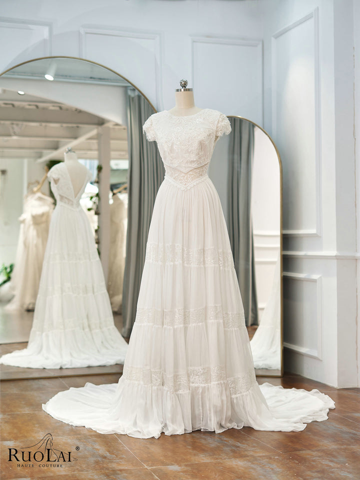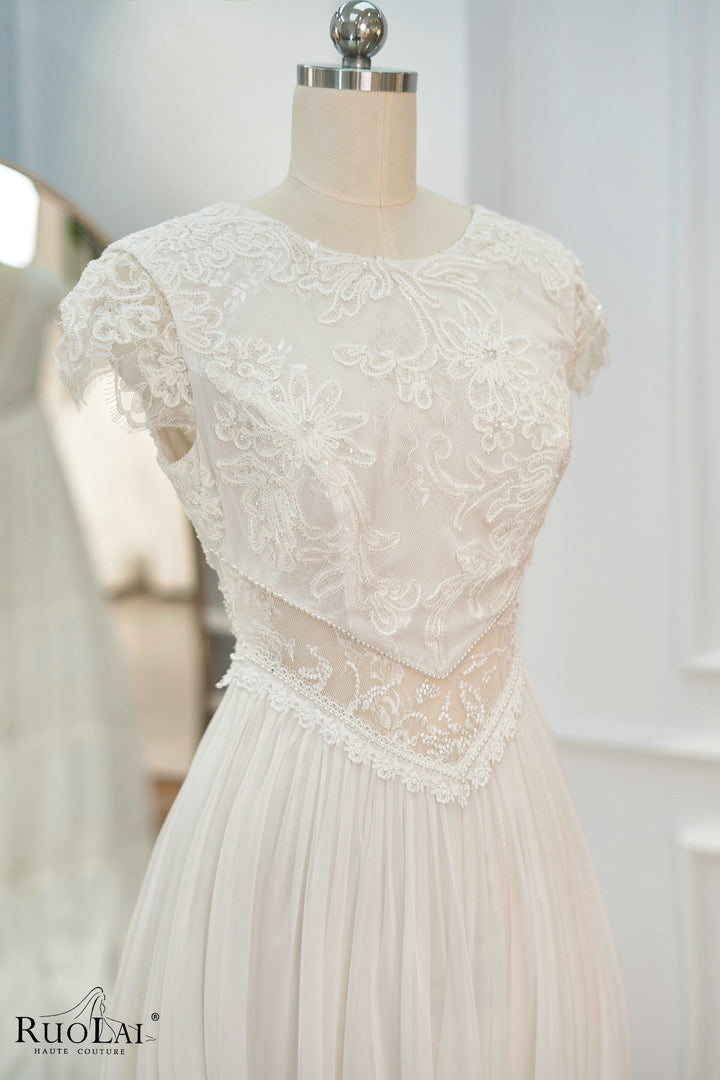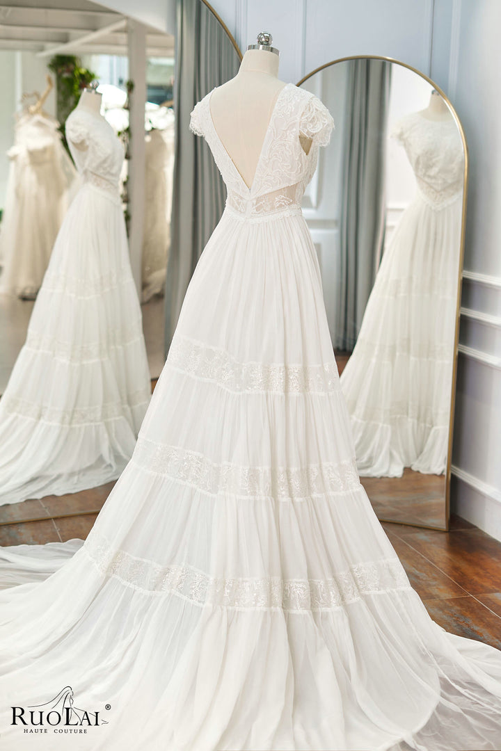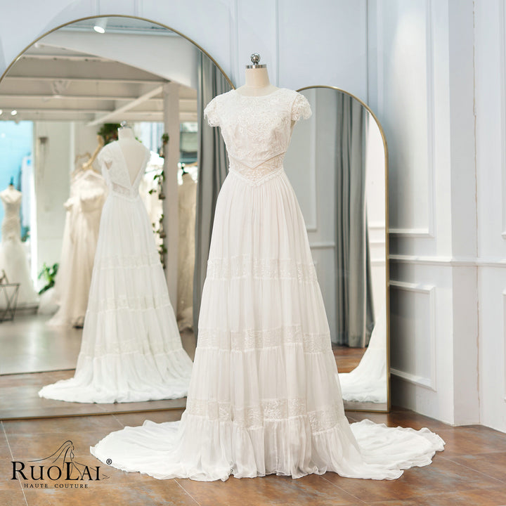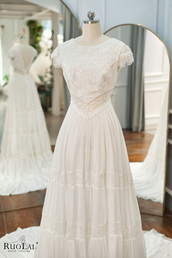 Bohemian O Neck Cap Sleeve Lace Wedding Dress
