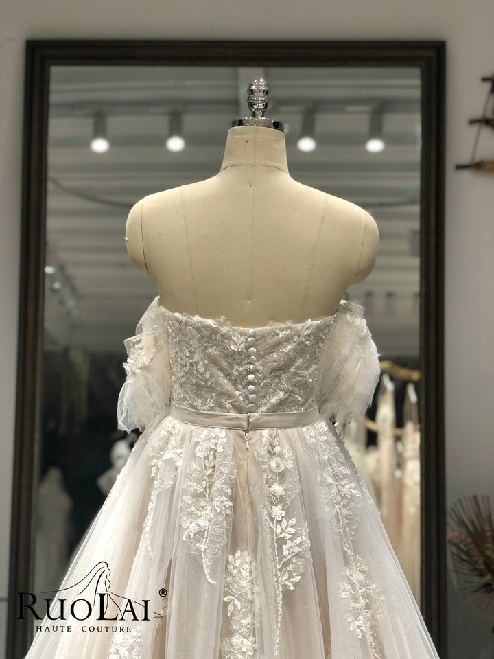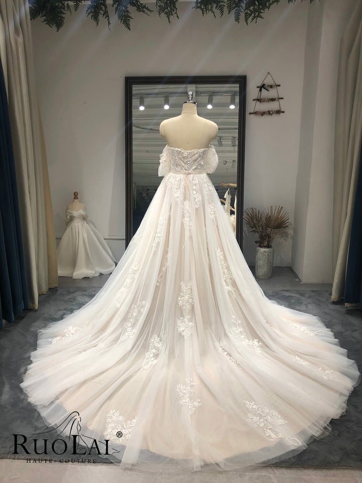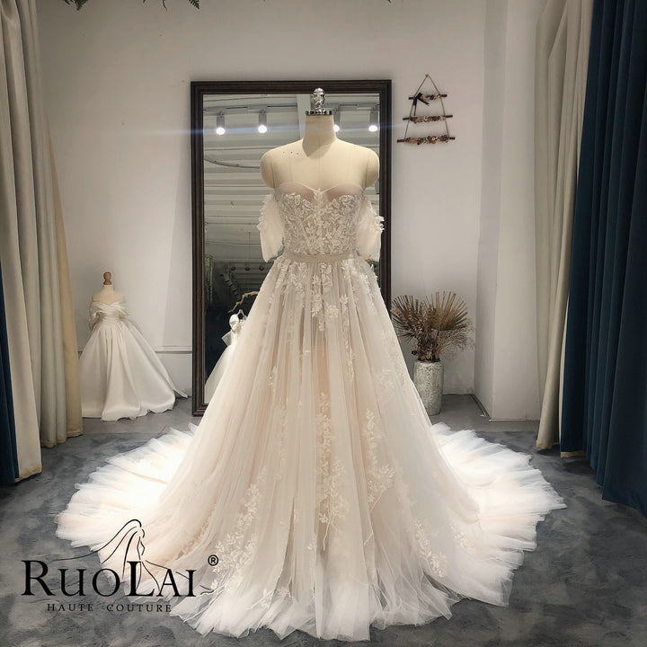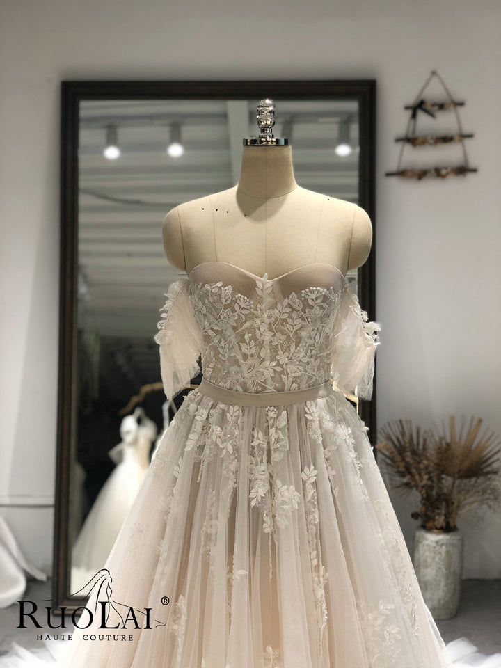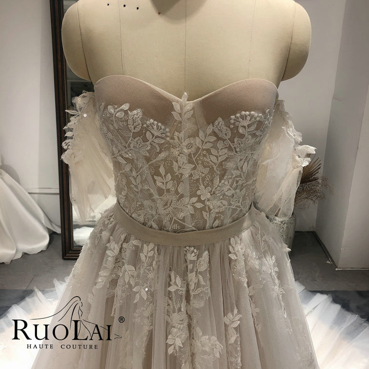 Elegant Off The Shoulder Sweetheart Neckline A-line Boho Wedding Dresses for Women Sweetheart Lace Appliques Tulle Bride Wedding Gown
