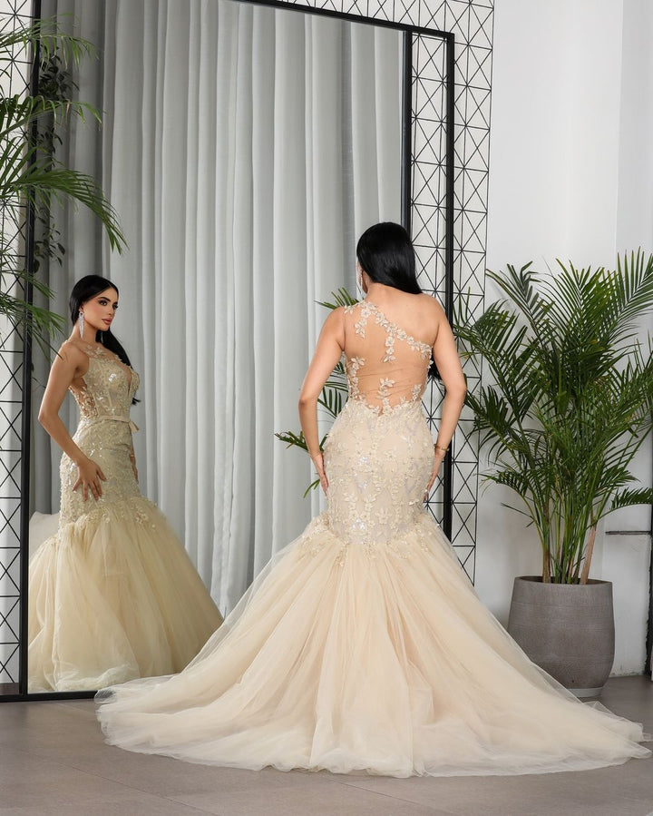 Champagne One Shoulder Tulle Mermaid Party Gown for Bride Lace Appliques with Sashes Dresses Party Gowns