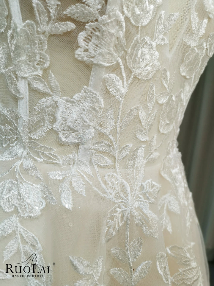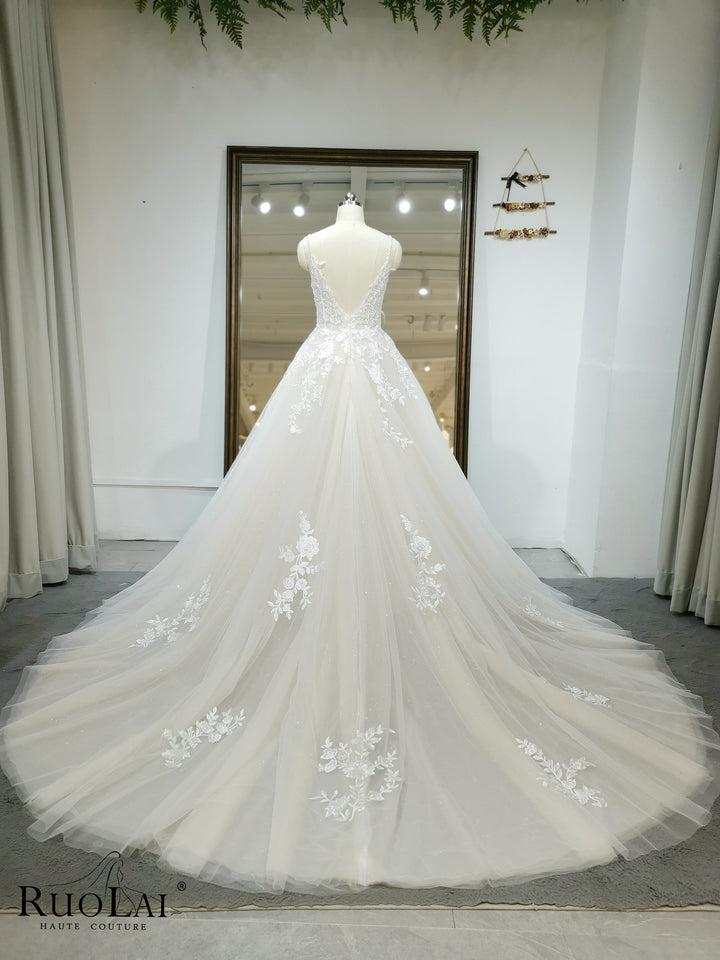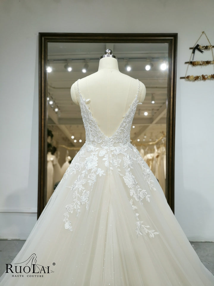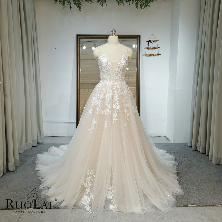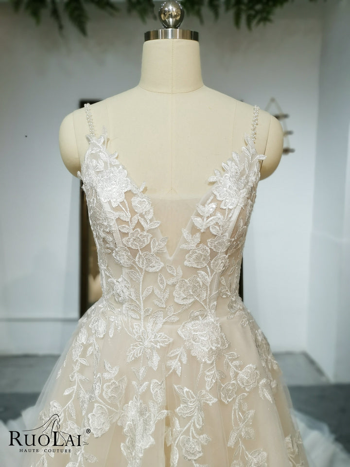 Spaghetti Straps V-Neckline Tulle Wedding Dresses Perals Lace A-line Champagne Color Bridal Gowns for Women Zipper