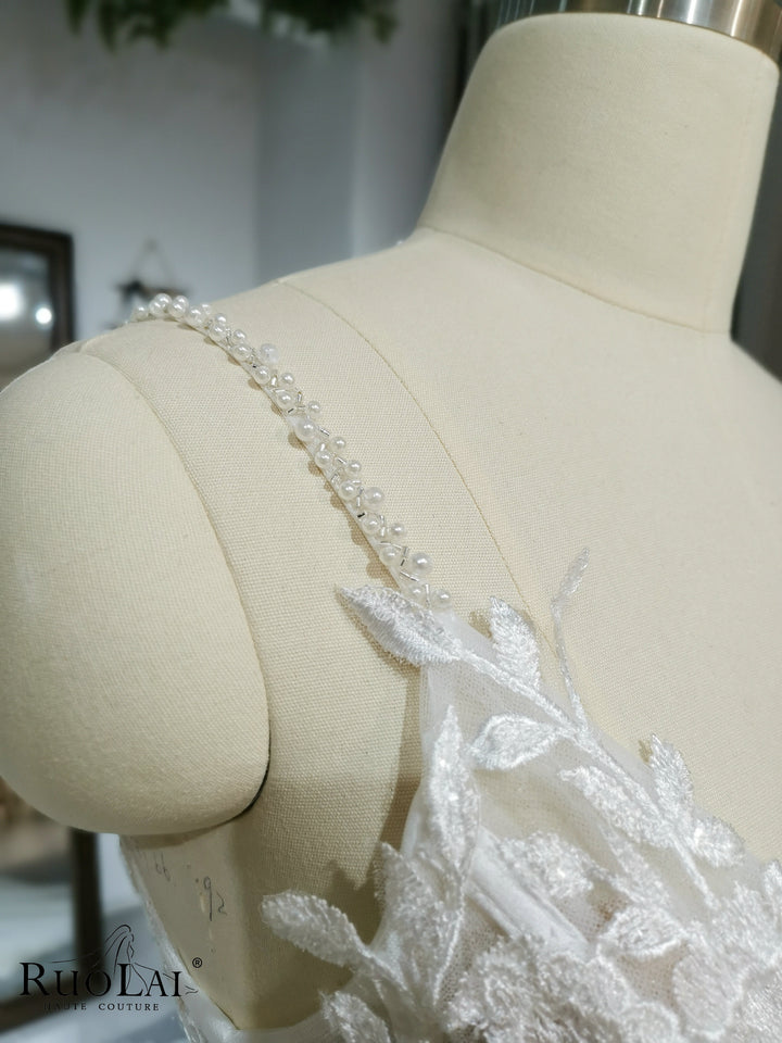 Champagne Spaghetti Straps with Pearls Lace Wedding Dresses