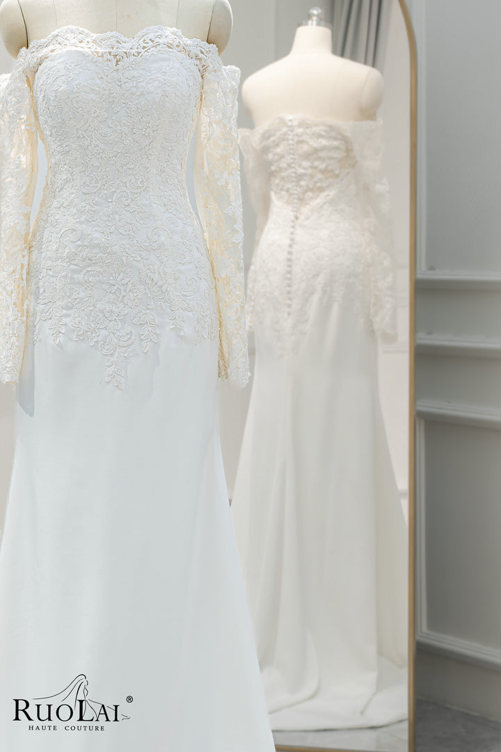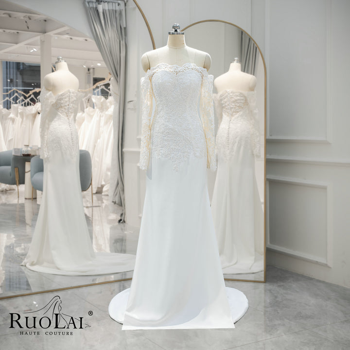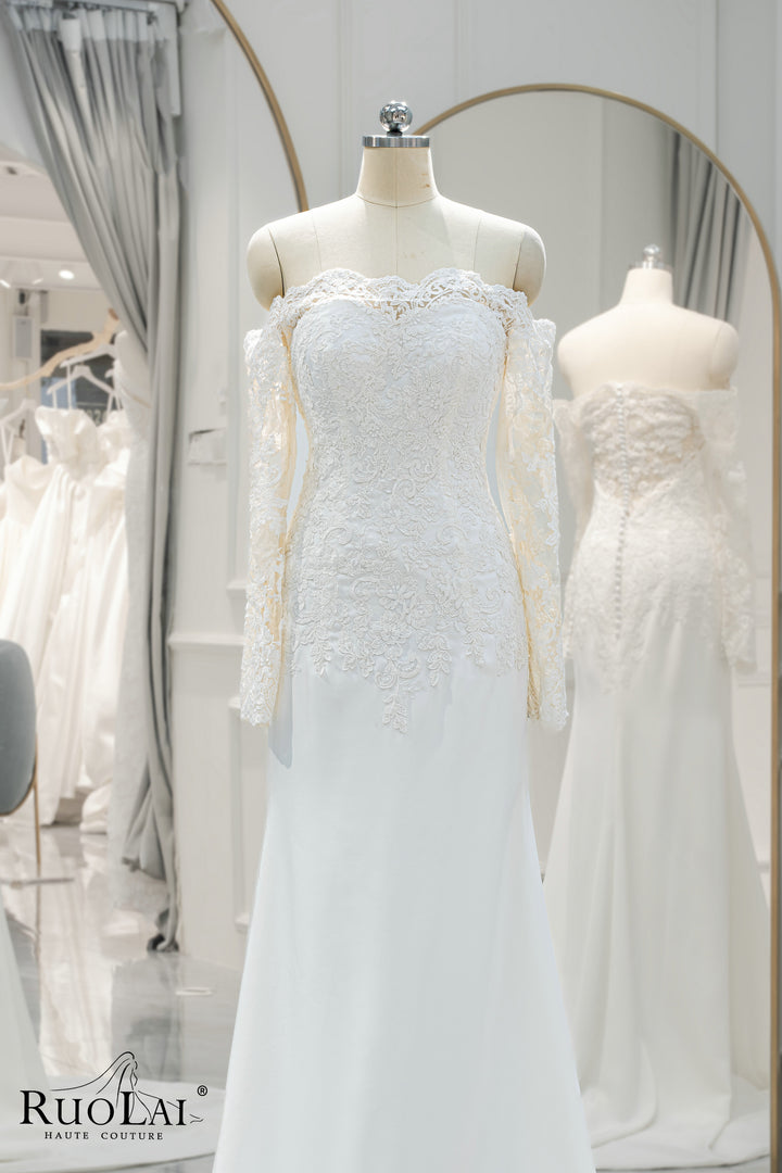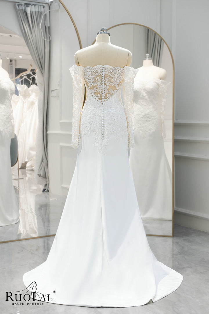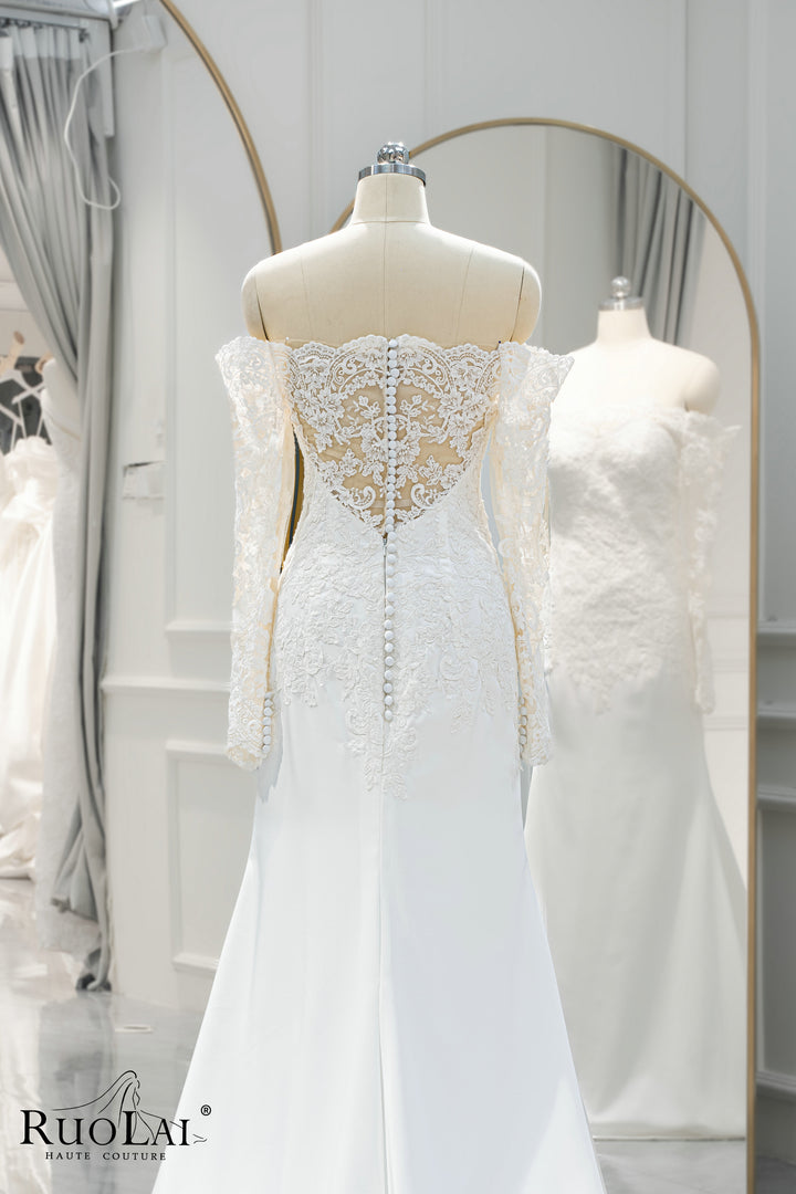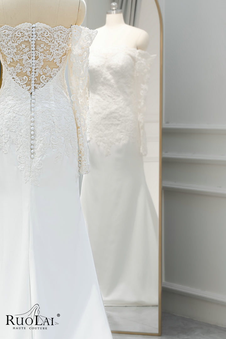 Classic Off the Shoulder Strapless Lace Mermaid Wedding Dress Long Sleeves Buttons Back Satin Sweep Train Bride Gowns