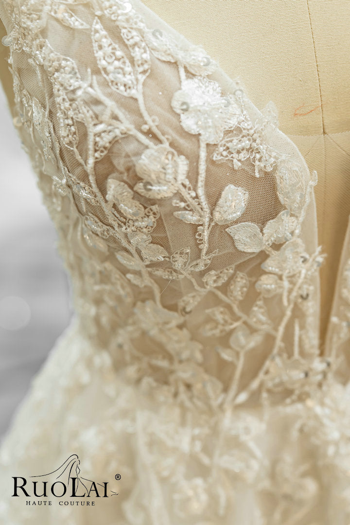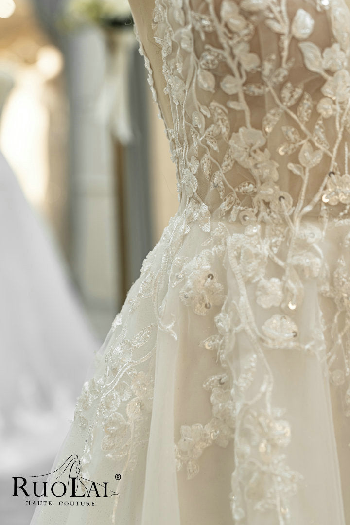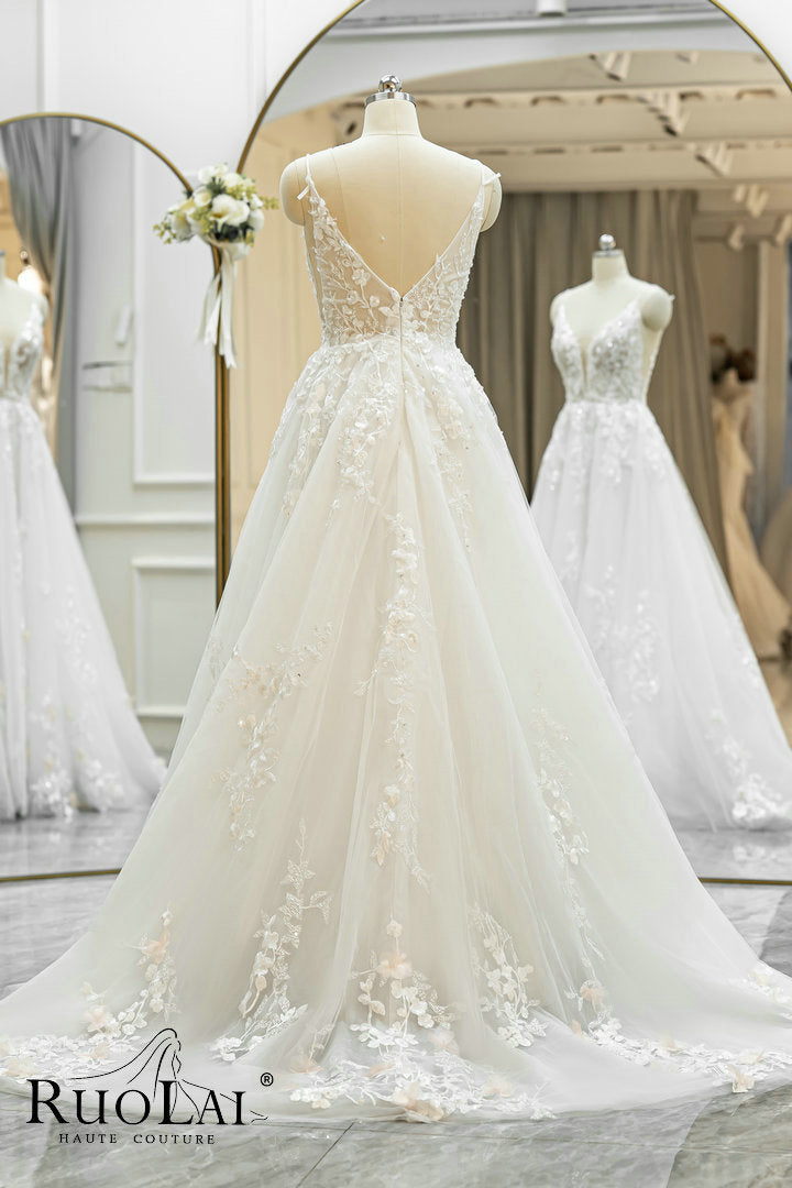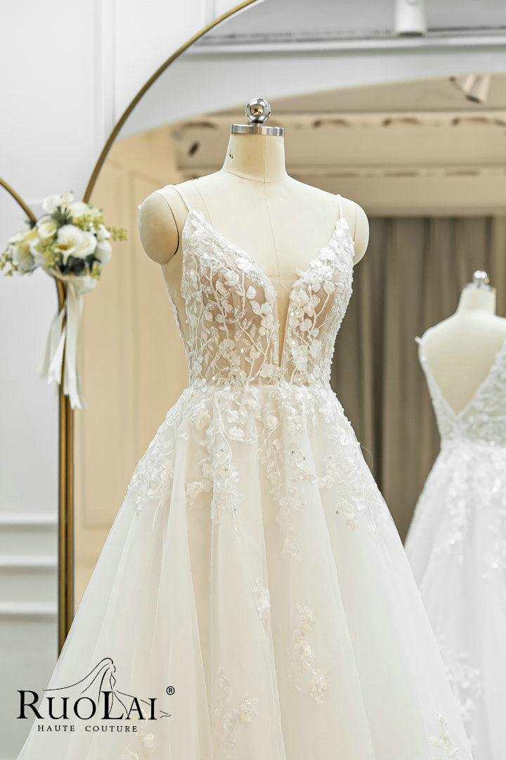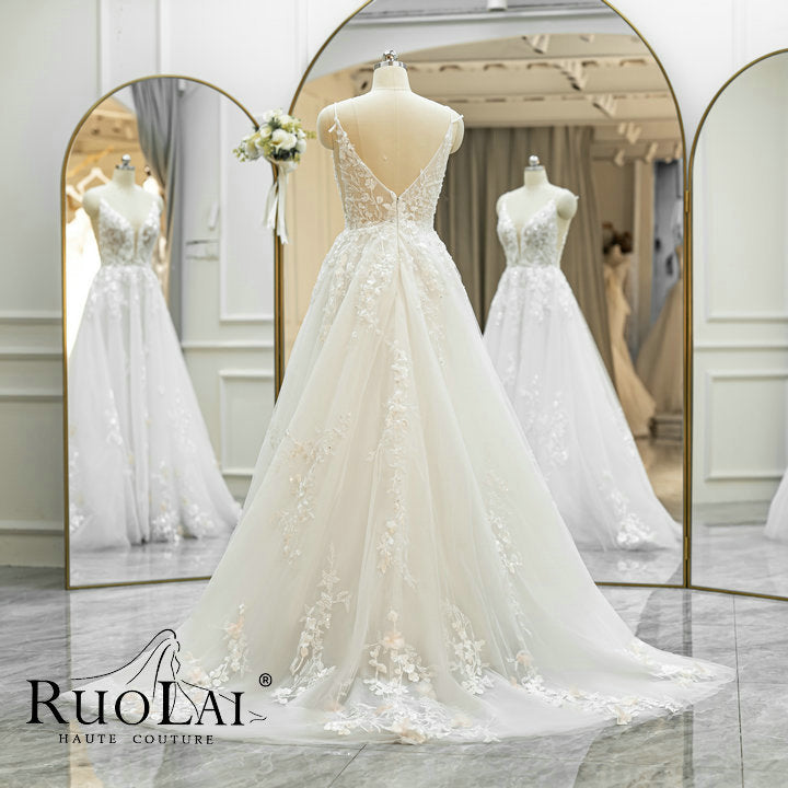 Classic Spaghetti Straps Sleeveless Appliqus Lace Wedding Dresses For Women Zipper Lace A-Line V-neck Wedding Gowns