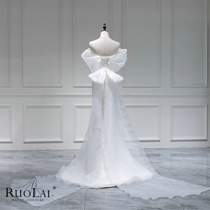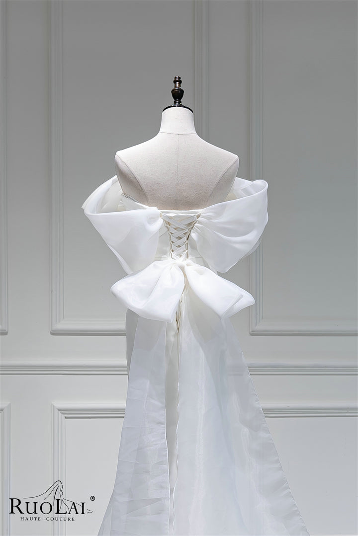 Classic Strapless Satin Wedding Gown For Bride A-line Off The Shoulder Zipper Bow Back Sleeveless Bridal Gown