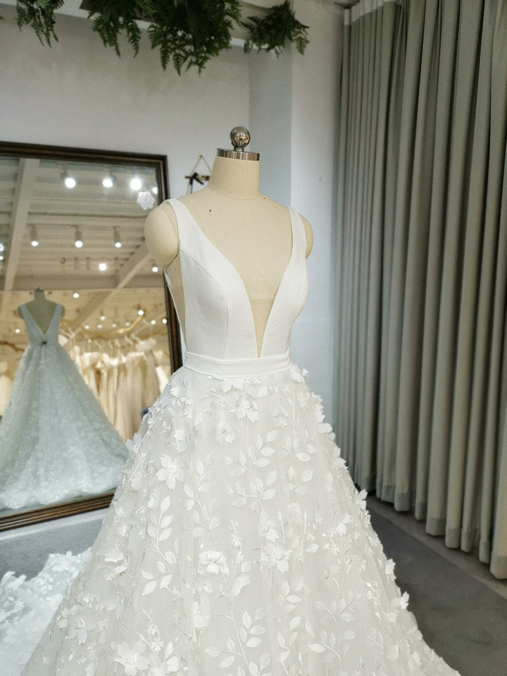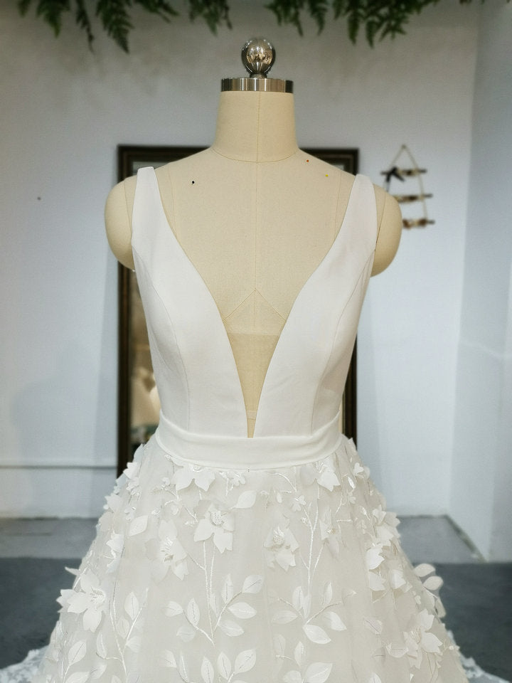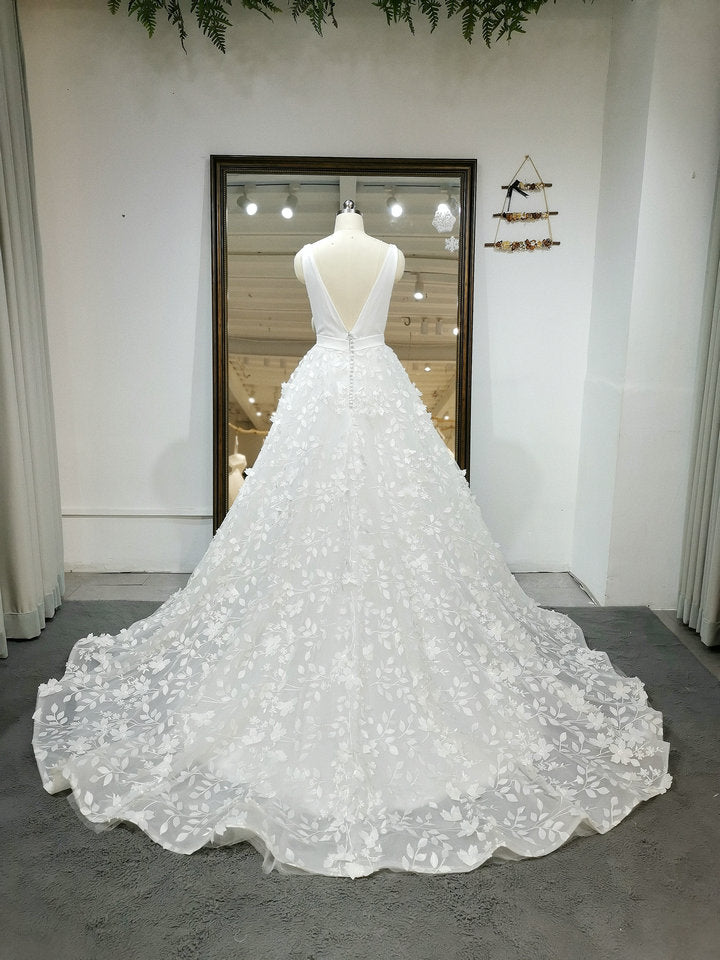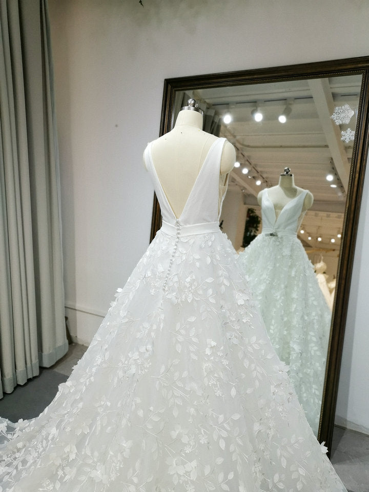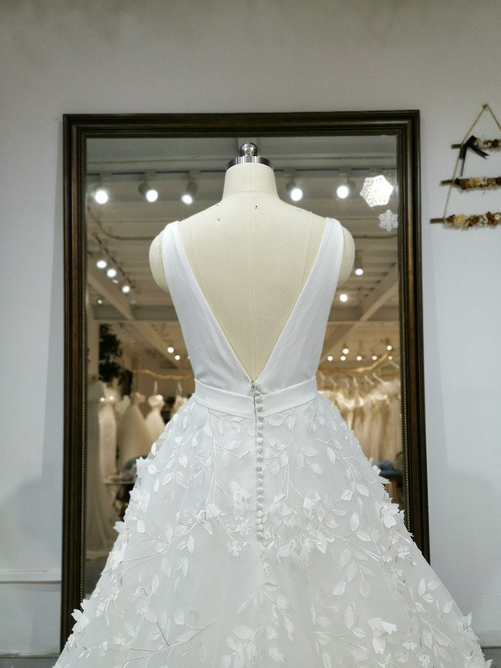 Deep V Neck Sleeveless 3D Flowers Lace Bridal Gowns