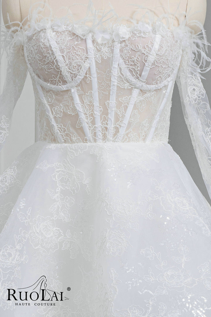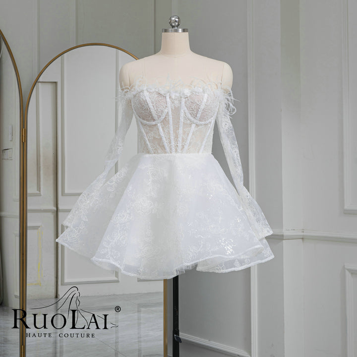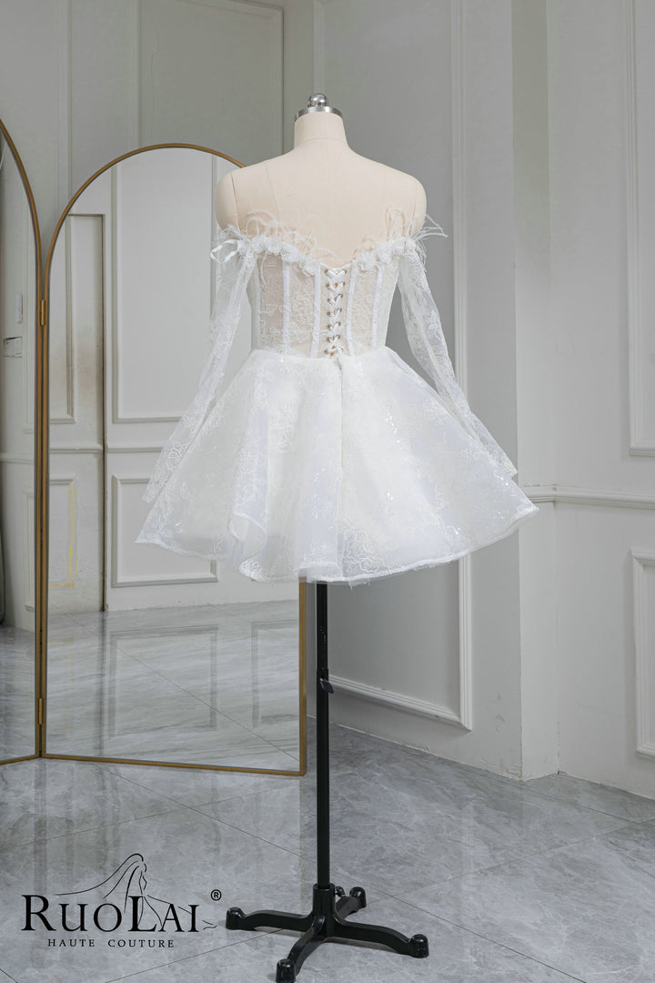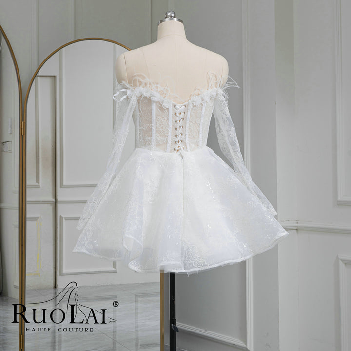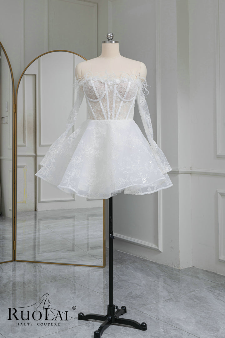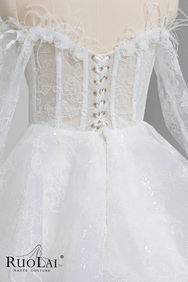 Eleagnt Off-the-shoulder Long Sleeve Full Lace Sweetheart Neckline for Bride A-line with Feather and Appliqued Bridal Dress Short