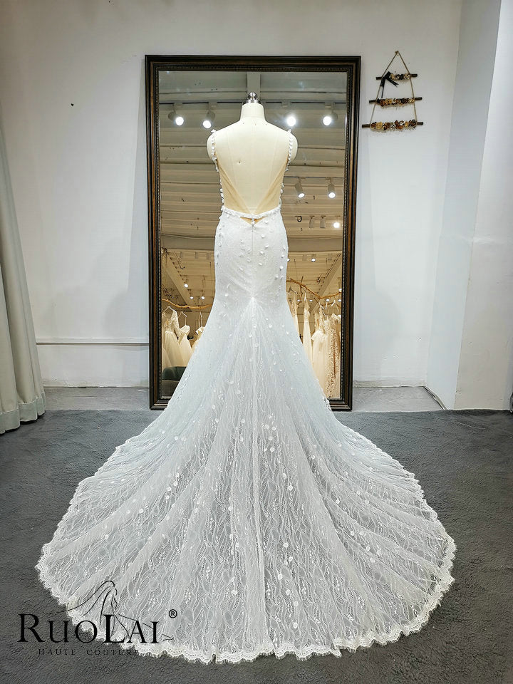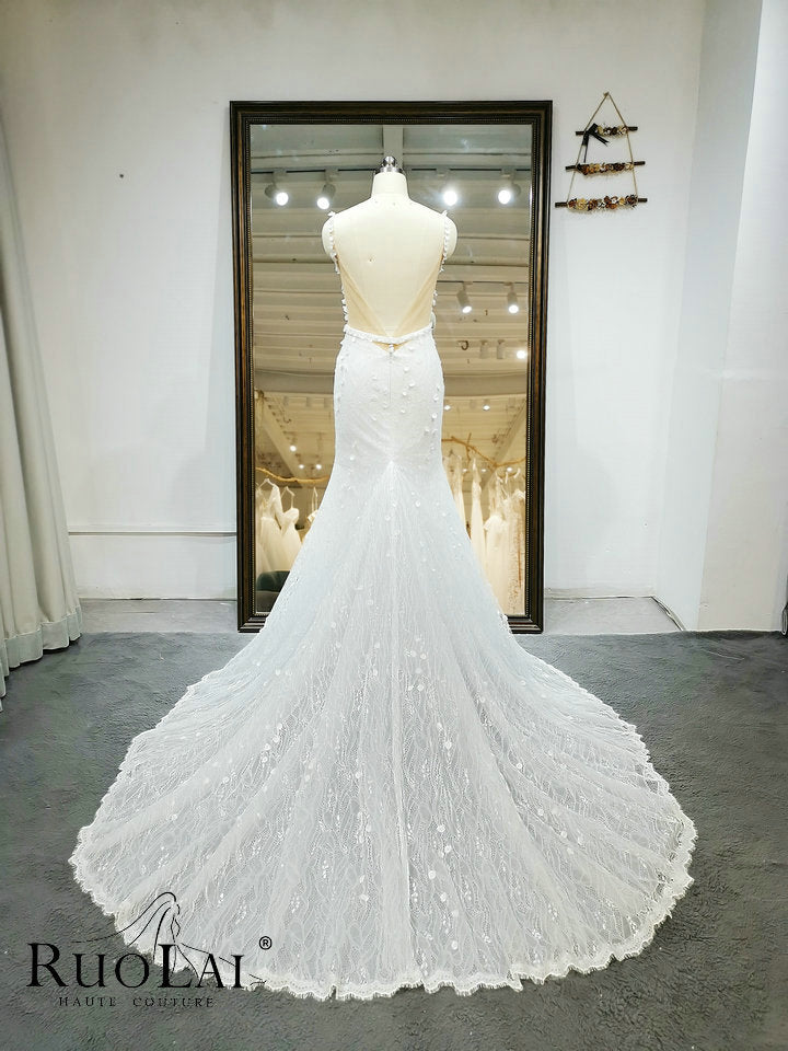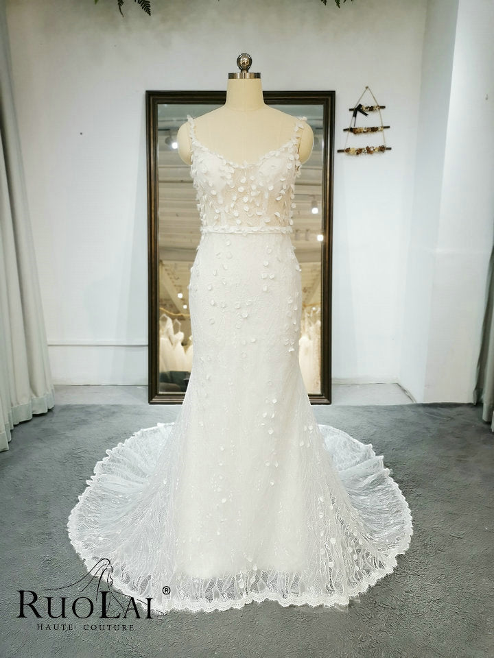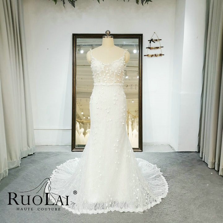 Elegant Spaghetti Strap Sweetheart Lace Appliques Wedding Dresses Mermaid Court Train Design Ivory Sexy Back Bridal Gowns for Women