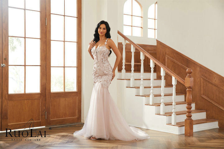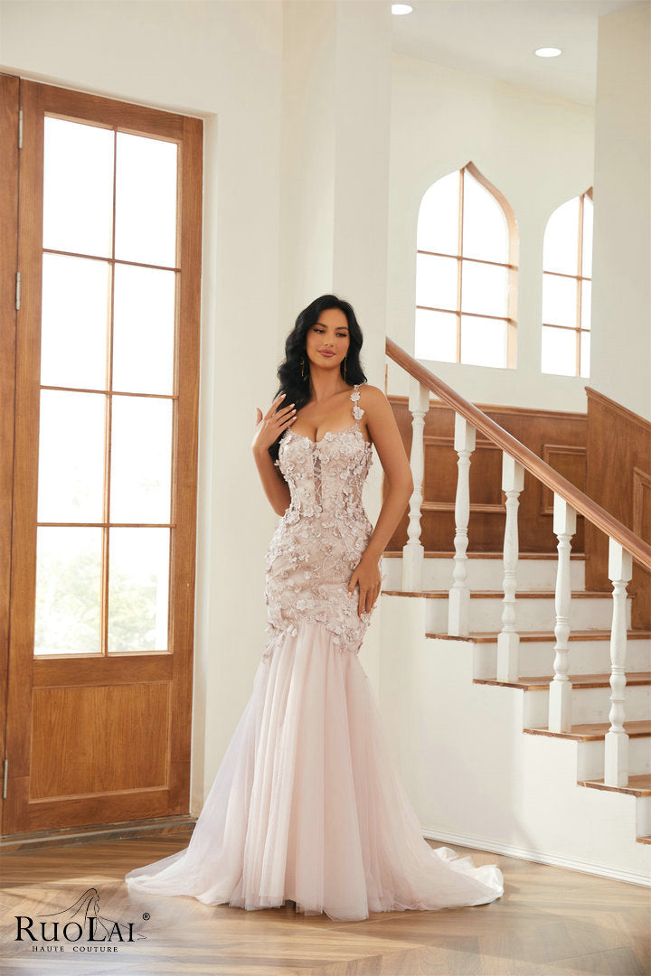Elegant Appliques Lace Mermaid 3D Flowers Spaghetti Straps Formal Women Evening Dresses Light Pink Sweetheart Neck Long Flowers Party Evening Gowns for Women
