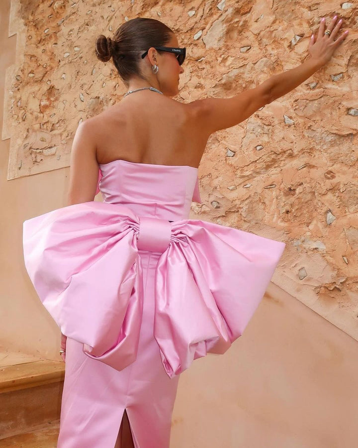 Pink Strapless Black Sashes Evening Dresses Saudi Arabia Off Shoulder Big Bow with Back Slit Evening Dresses