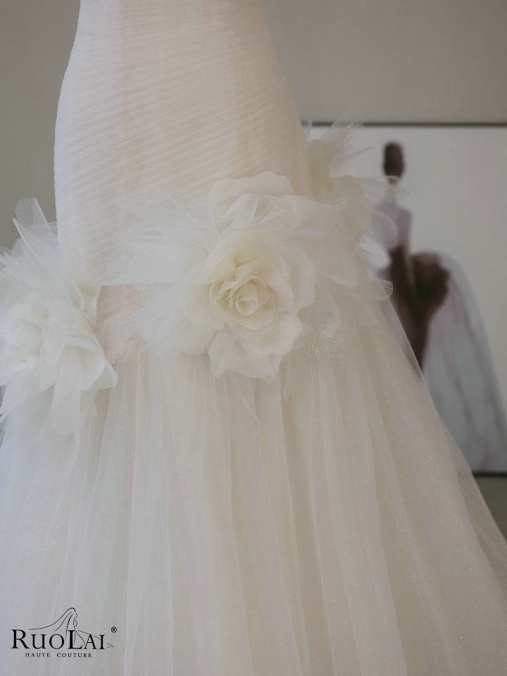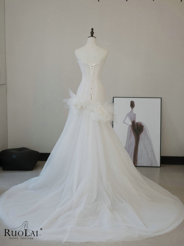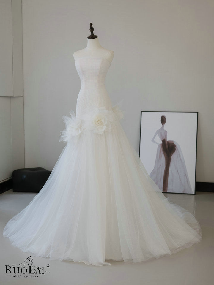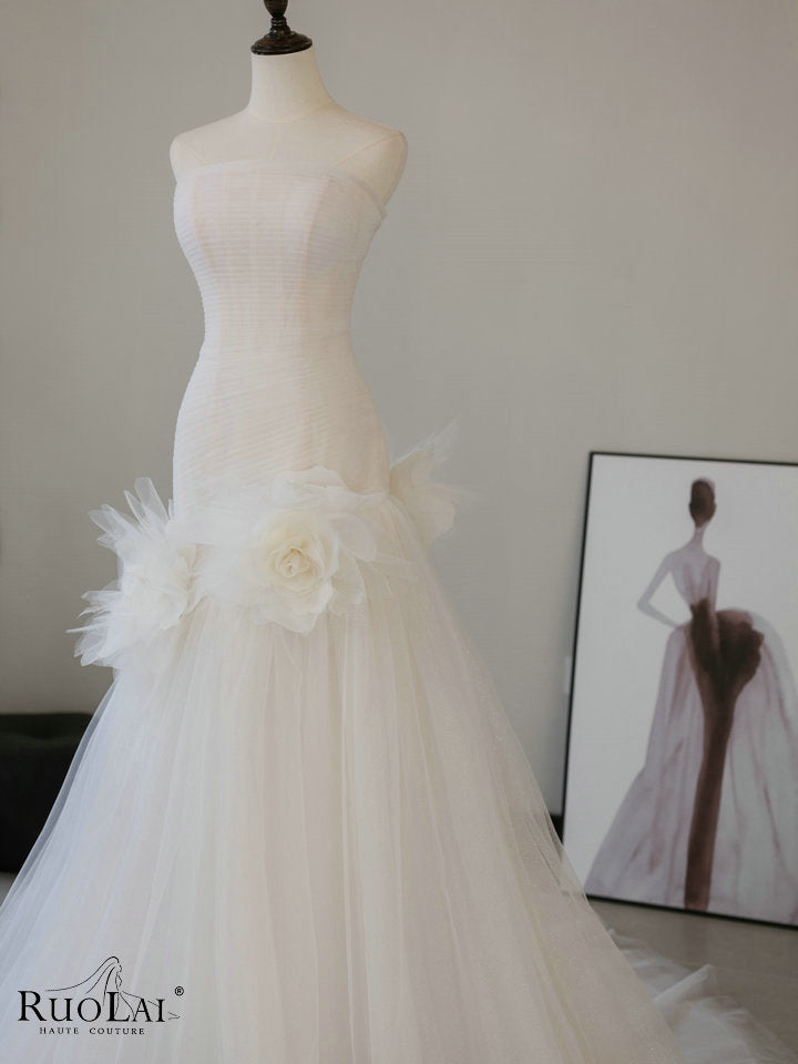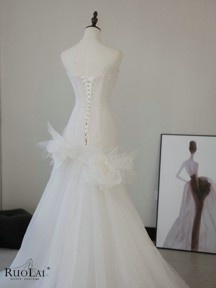 3d Flowers Mermaid Sleeveless Ruched Bridal Gowns for Women Bride Off The Shoulder Strapless Tulle Wedding Dress