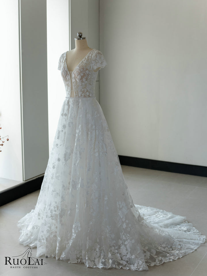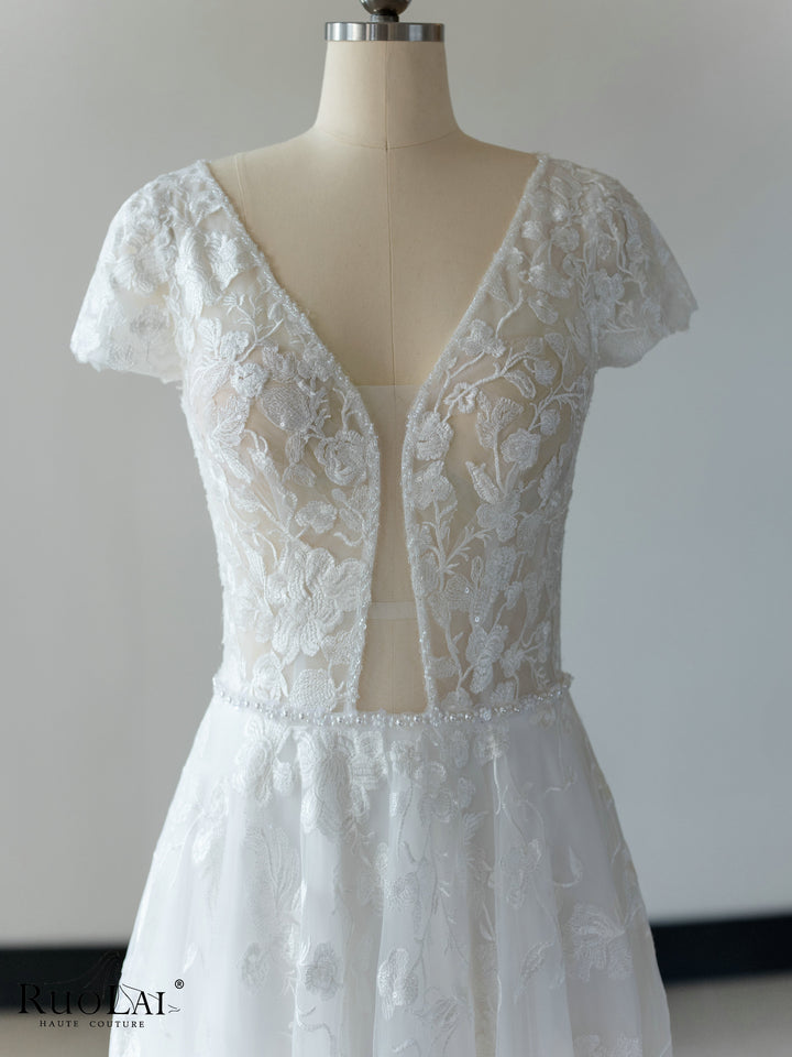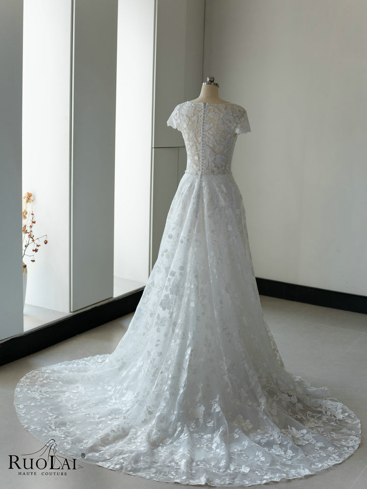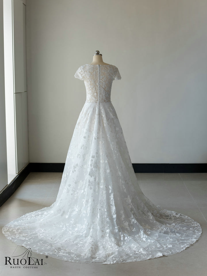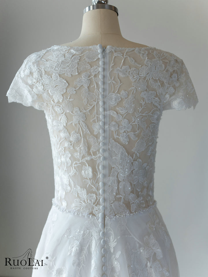 QW02100 Beading Sequin Short Sleeve Lace A Line Chapel Train Wedding Gown