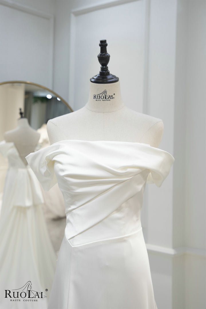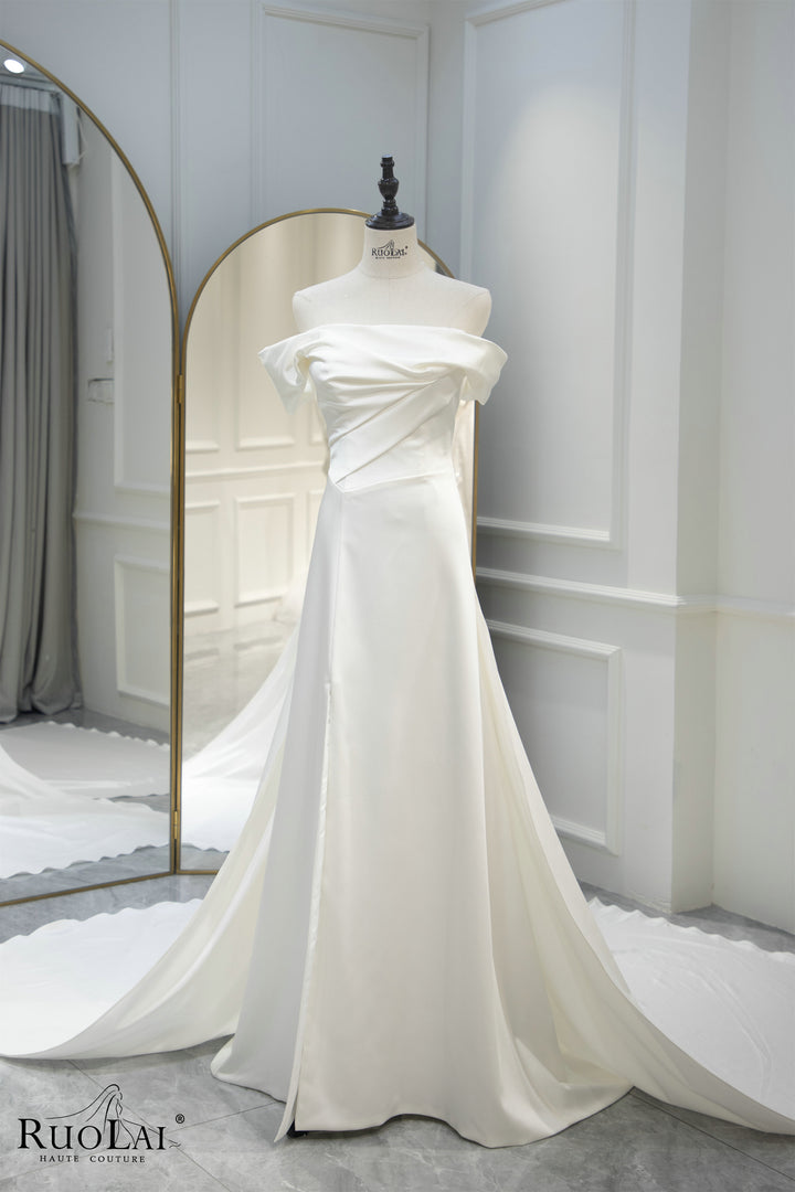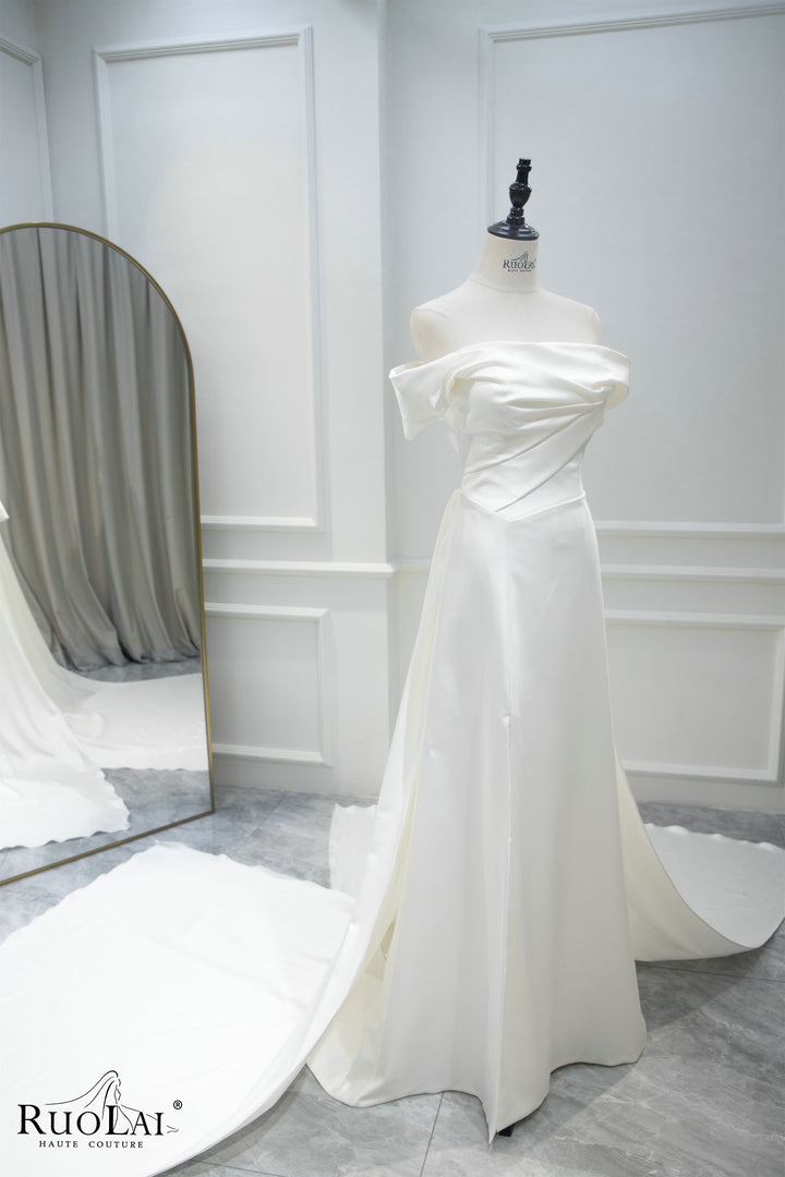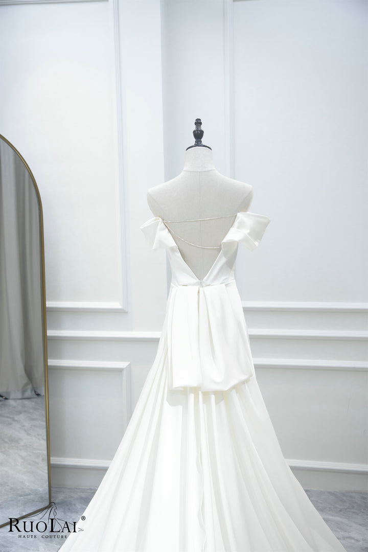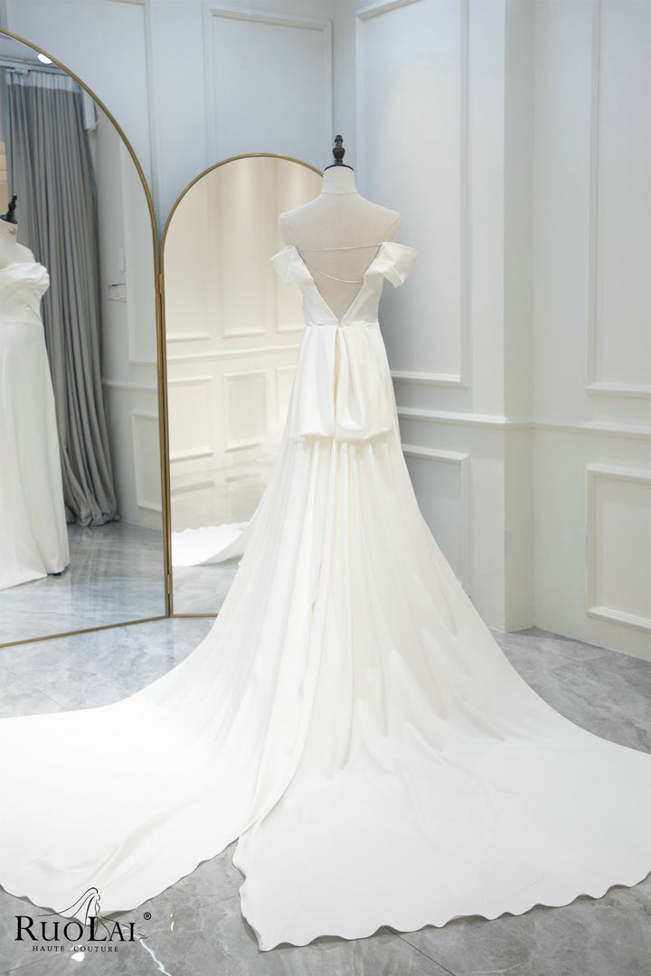 Beho Mermaid Korea Short Sleeves Chapel Train Ivory Wedding Dress Customized Satin Off Shoulder Backless Bride Dress Satin Wedding Gown Bridal