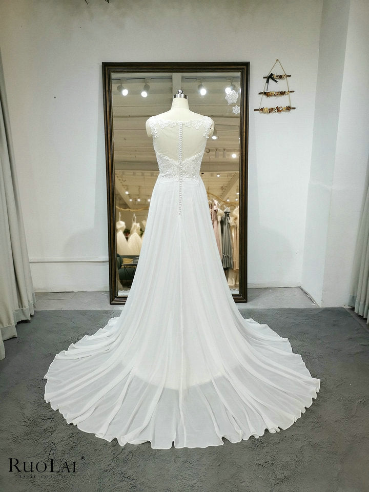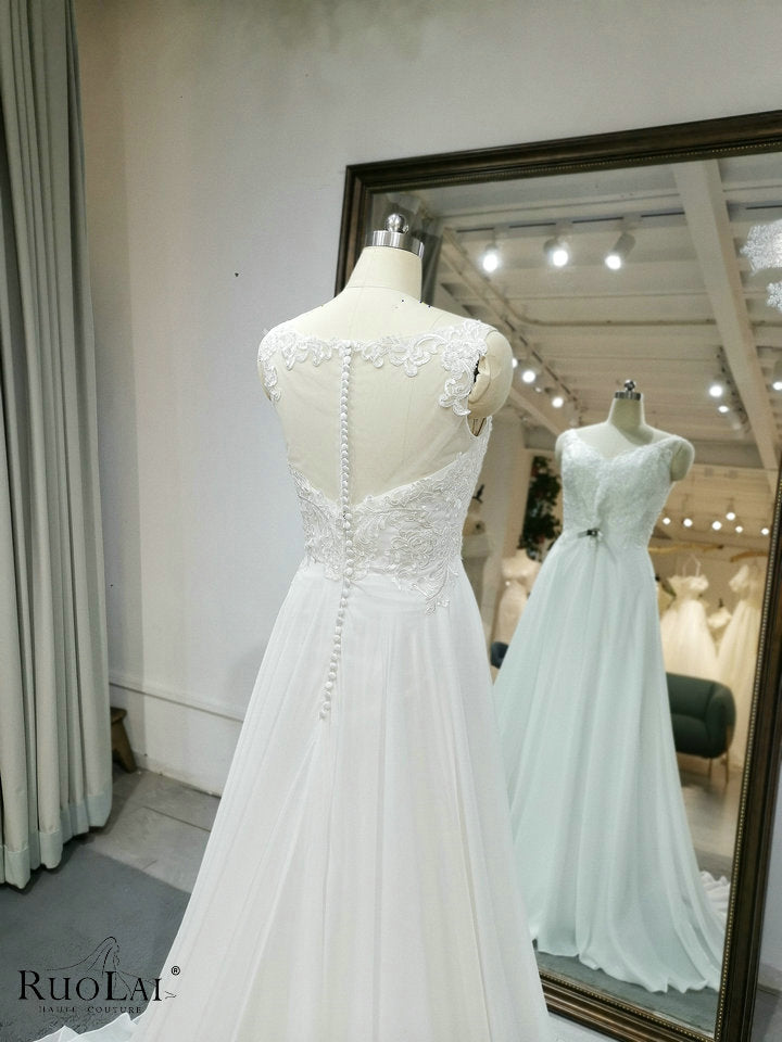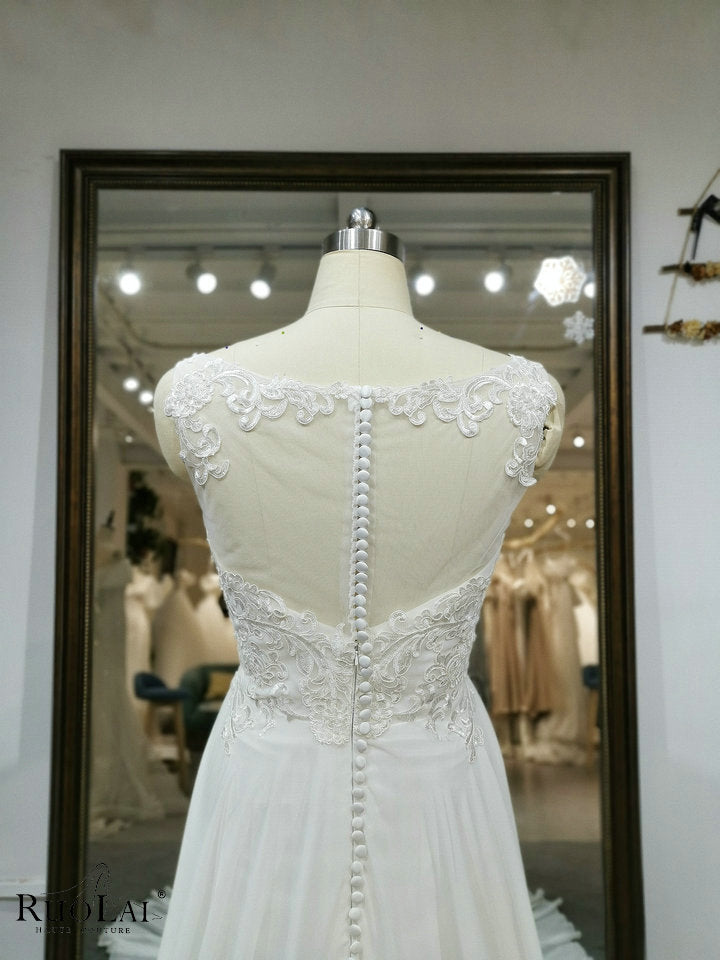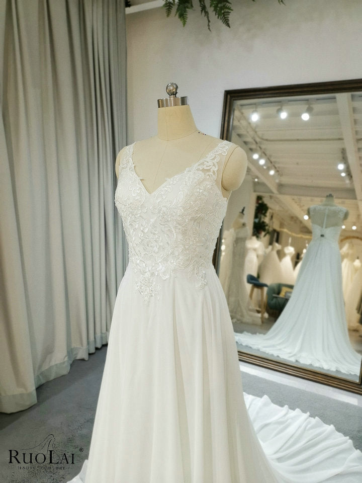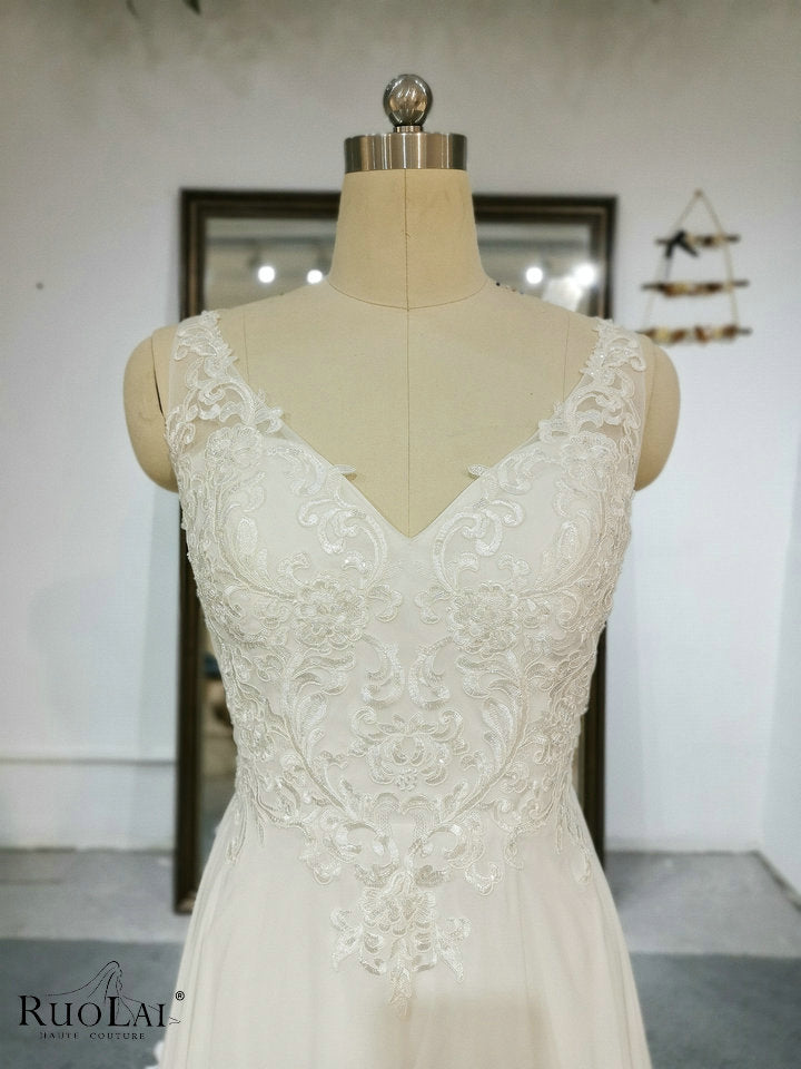 QW01327 Boho Lace V Neckline Vintage Chiffon Bridal Gowns