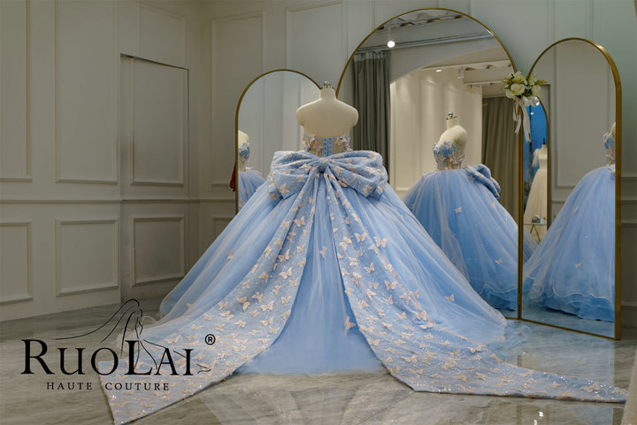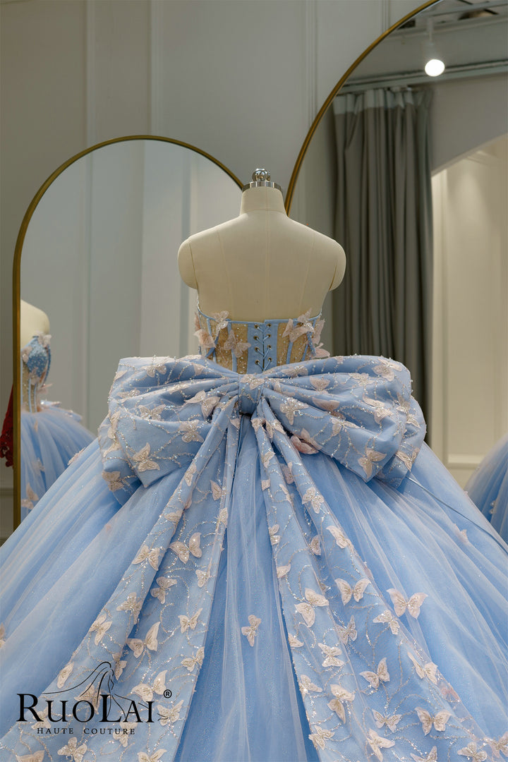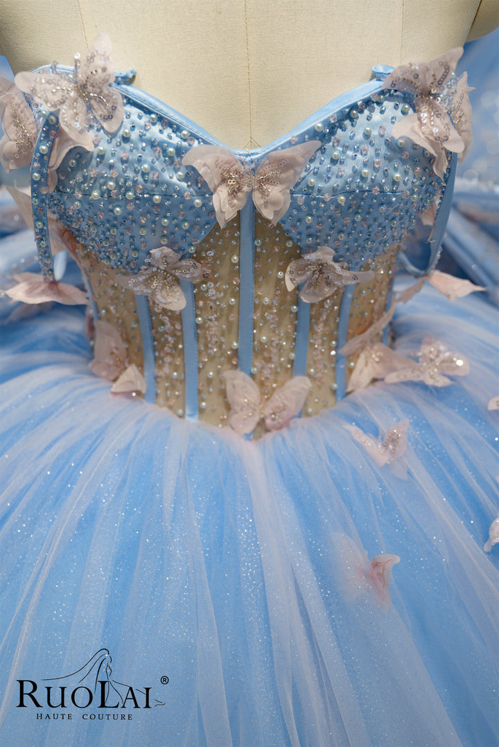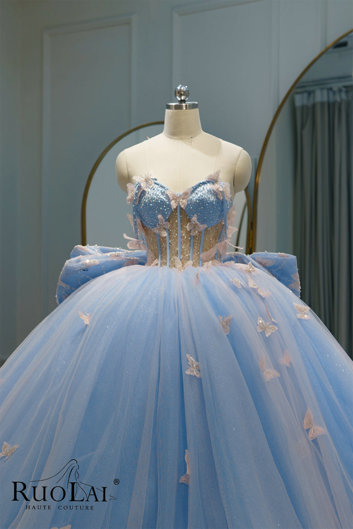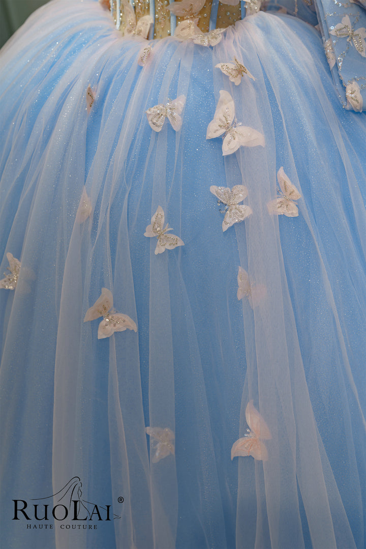 Light Blue Butterfly Quinceanera Dresses Cape Lace Applique Mexican Customised Prom Birthday Sweet 16 Dress Vestidos De