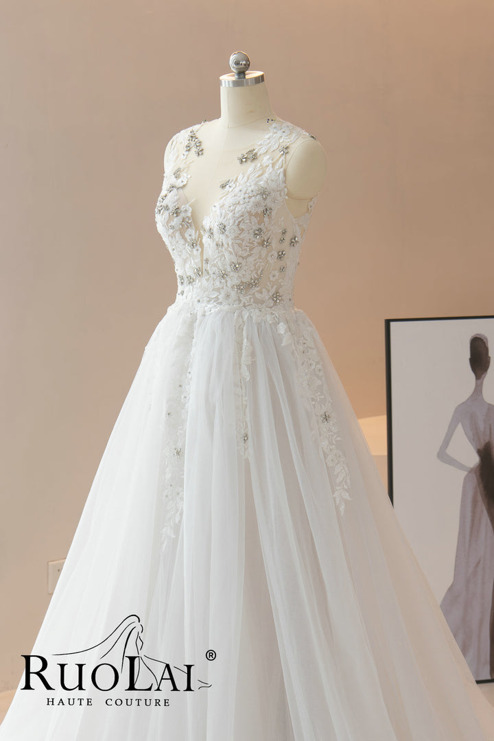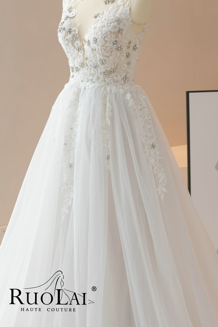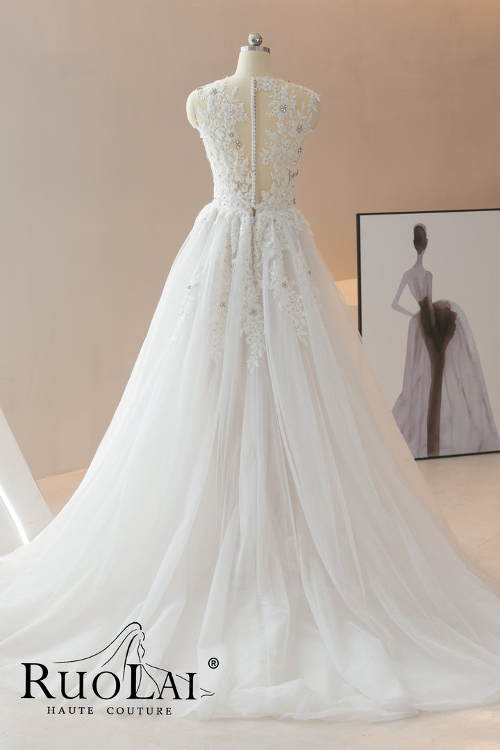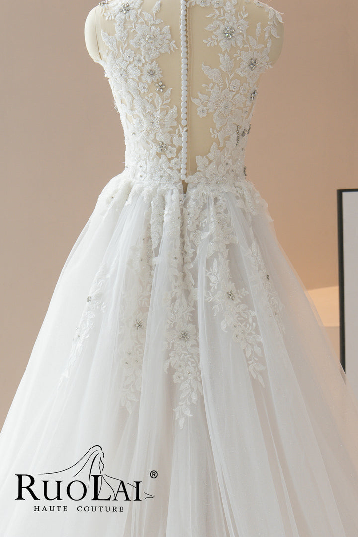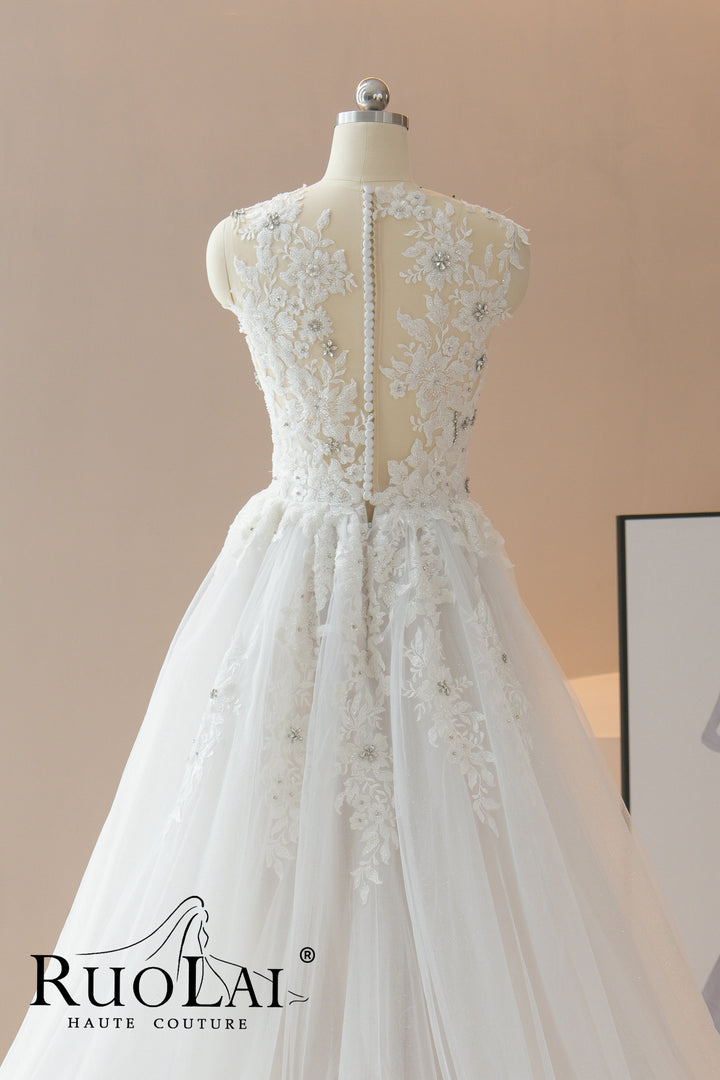 Chic O Neck Lace Appliques Beading A Line Tulle wedding Dress