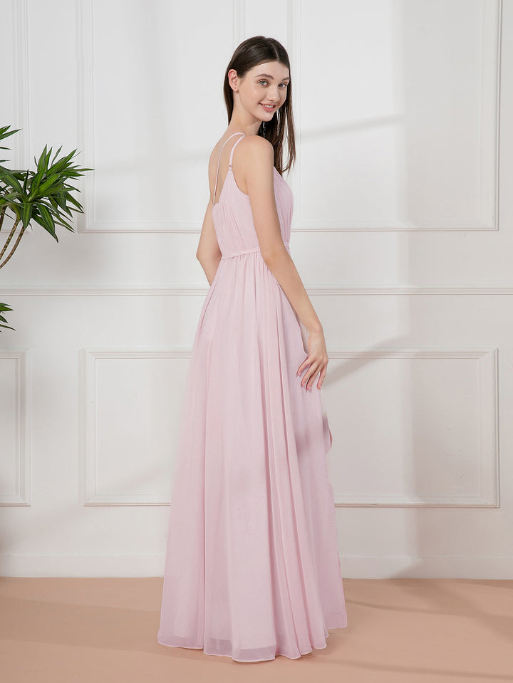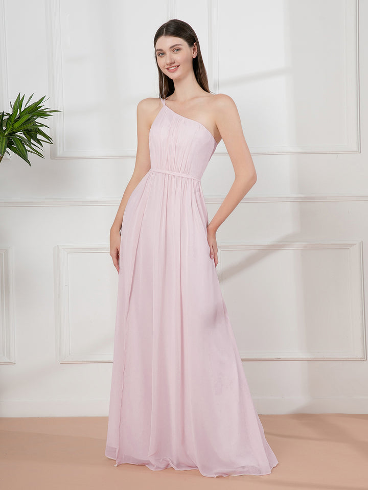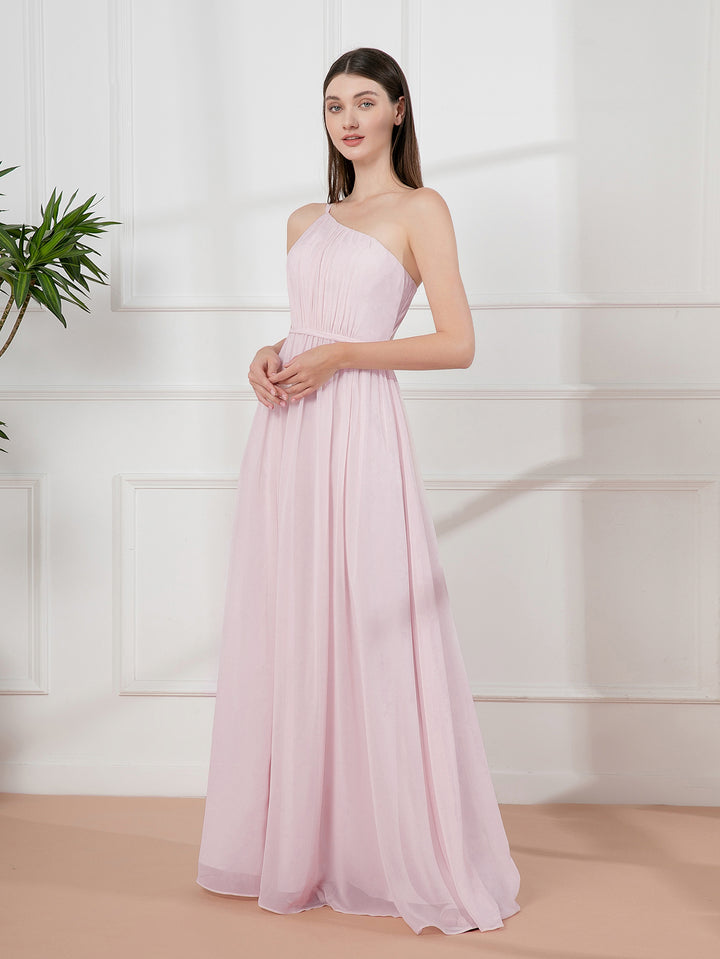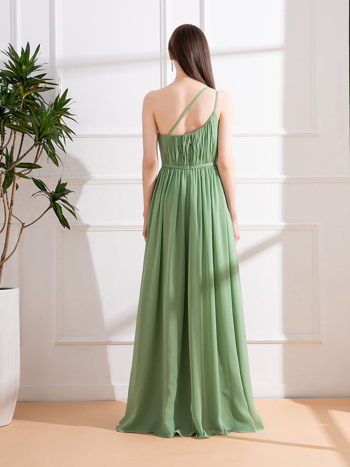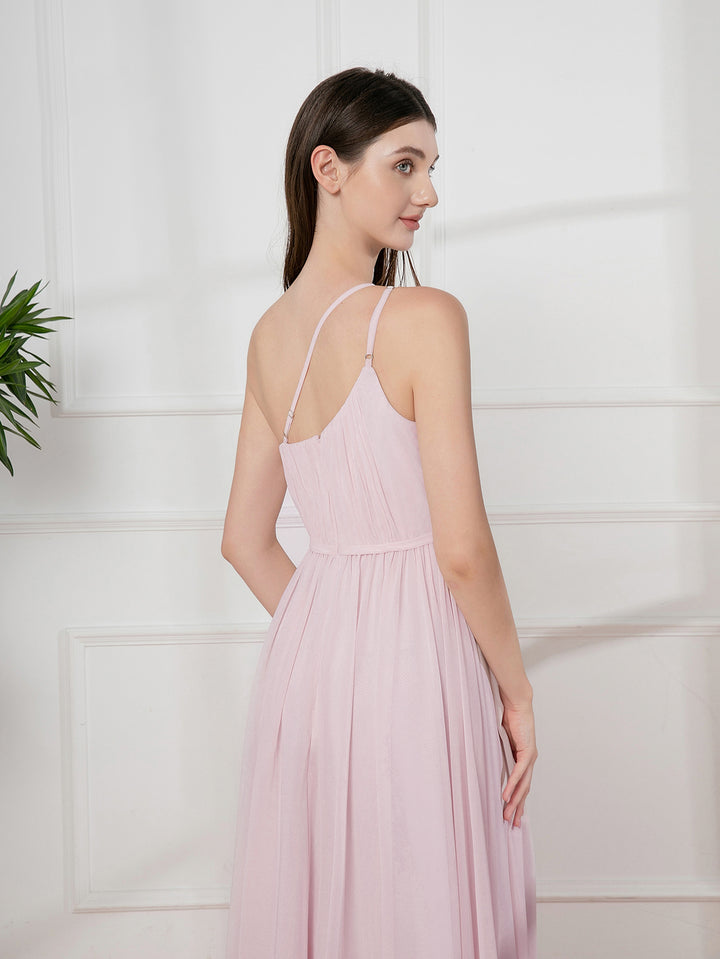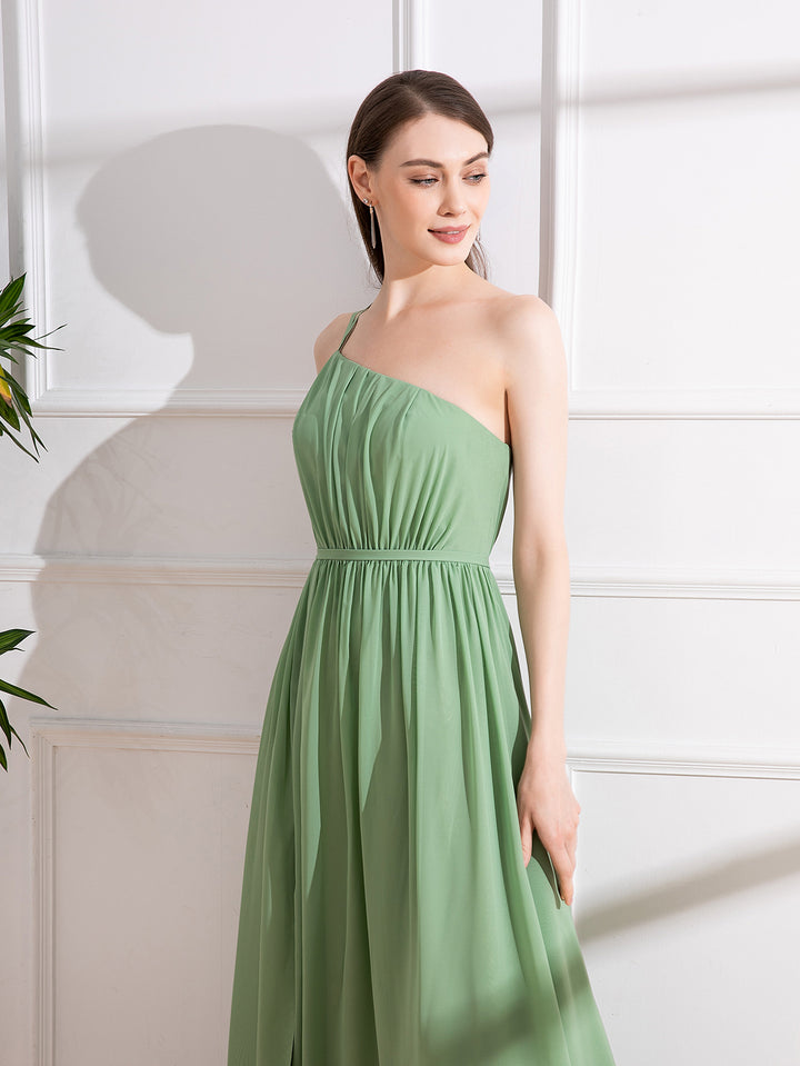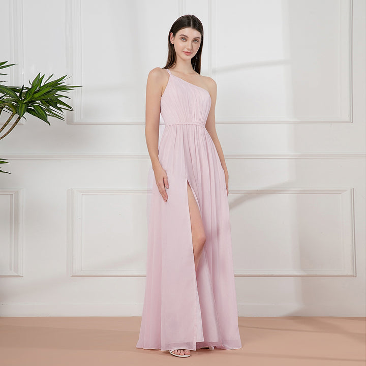 Chic One Shouder Spaghetti Strap Front Slit Chiffon Bridesmaid Dress