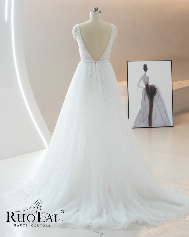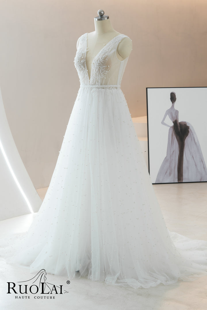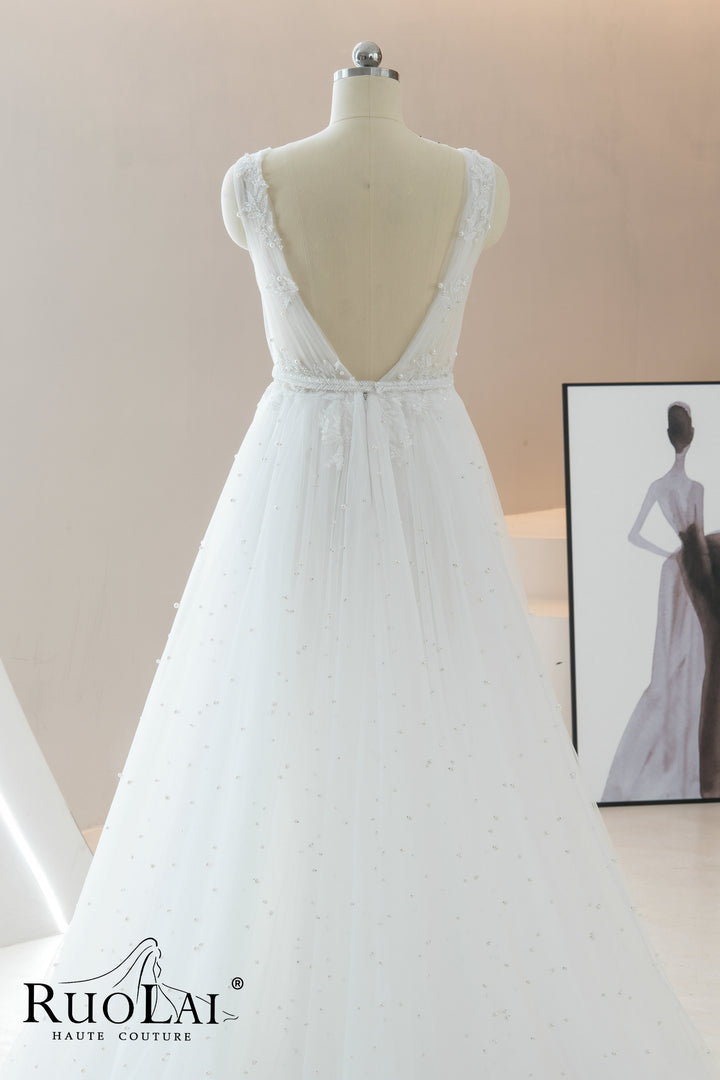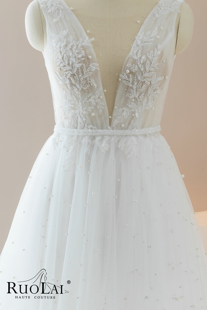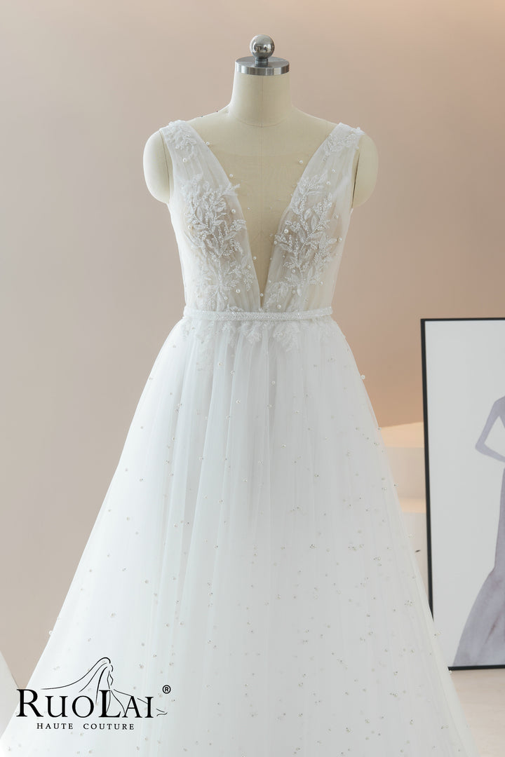 Unique Deep V-neckline Wedding Dresses A-line Beaded Pearls Lace with Sash Backless Tulle Fabric Bridal Dresses