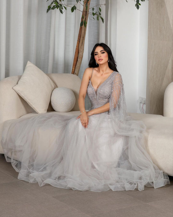 Elegant Asymmetry Sleeves Shiny Tulle Evening Dresses