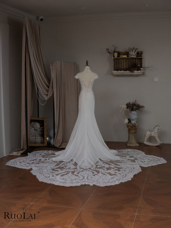 Elegant High Neck Cap Sleeve Lace Satin Mermaid Wedding Dresses Detachale Long Sleeve Watteau Train Bridal Dress.