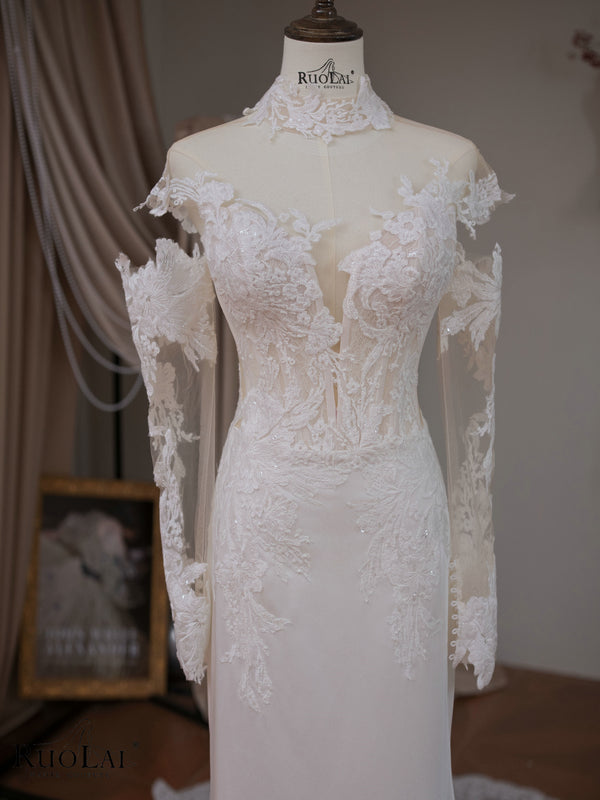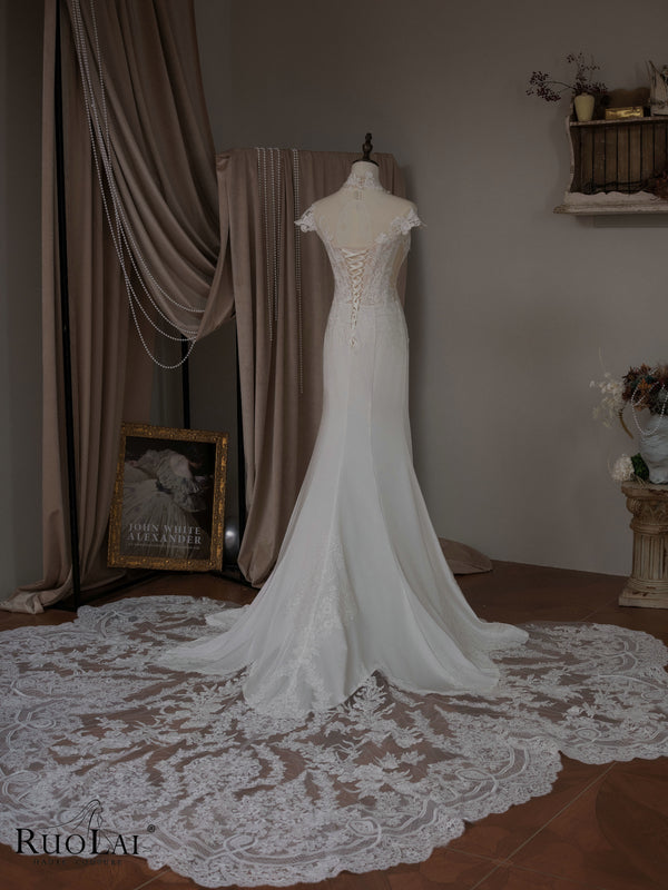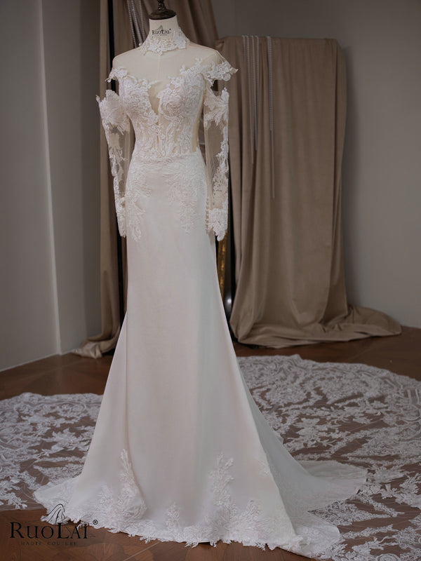 QD06506 Elegant High Neck Lace Satin Mermaid Wedding Dresses