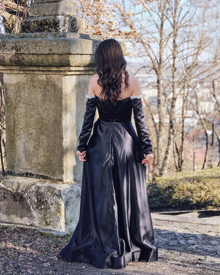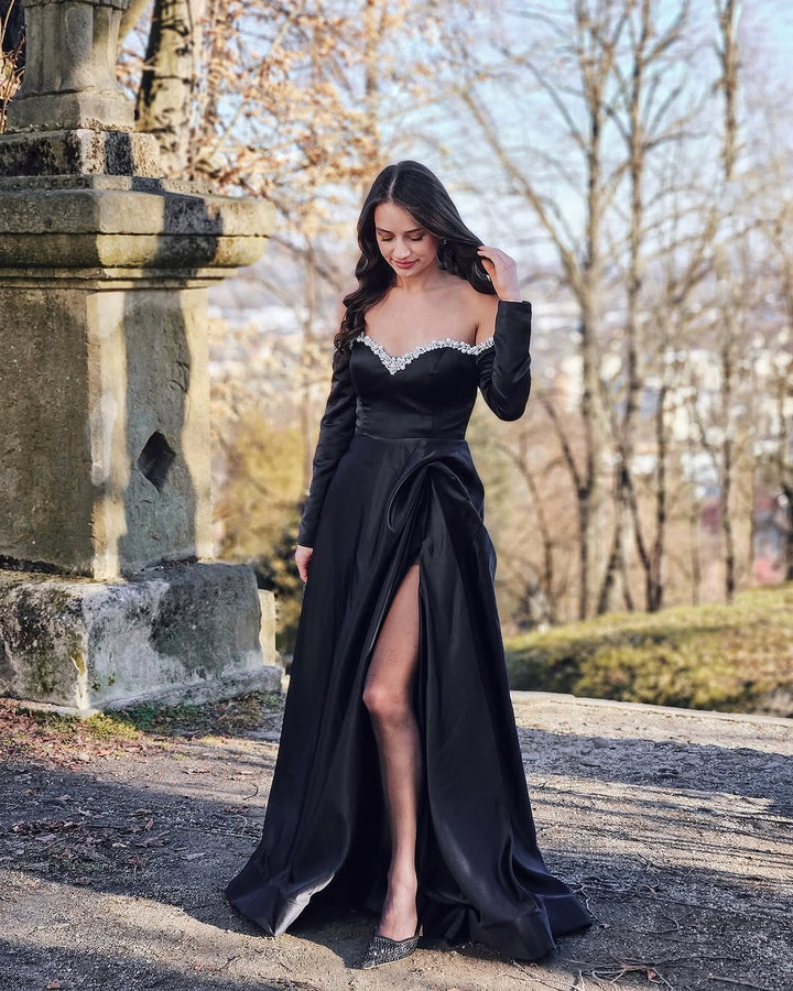 Custom Made Arabic Black Elegant Party Gowns Satin Long Sleeves Beaded Satin Luxury Prom Dresses