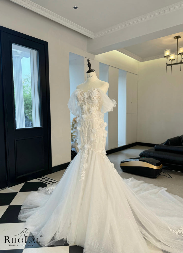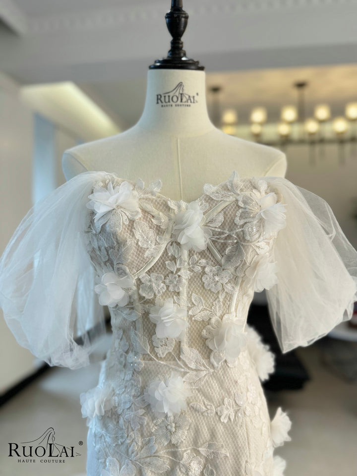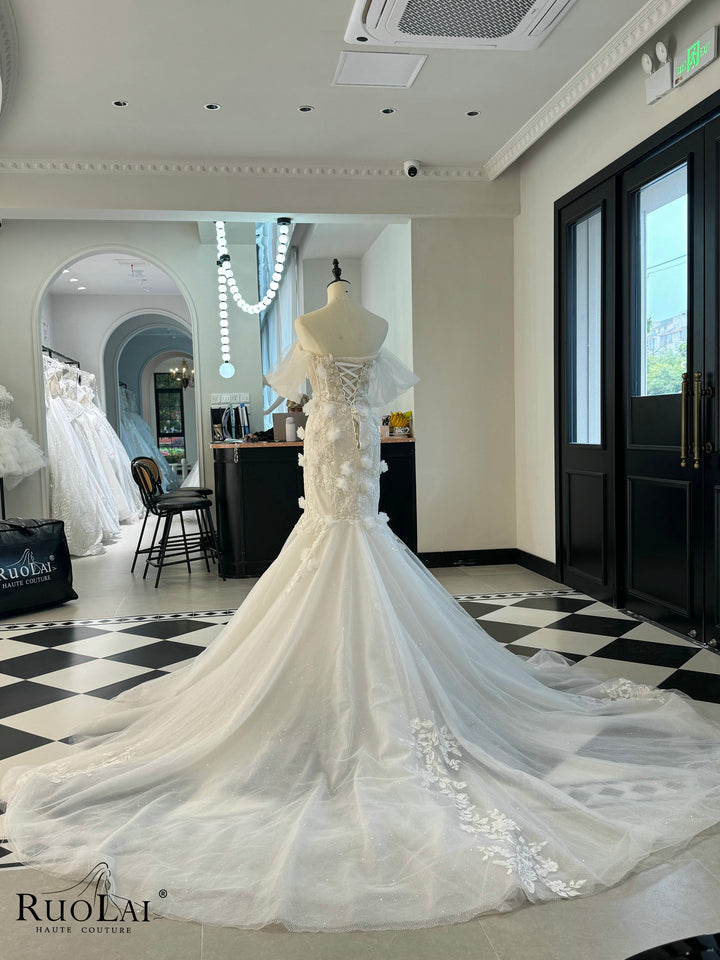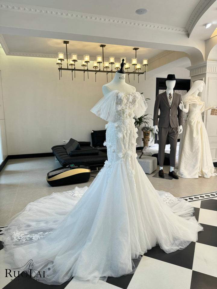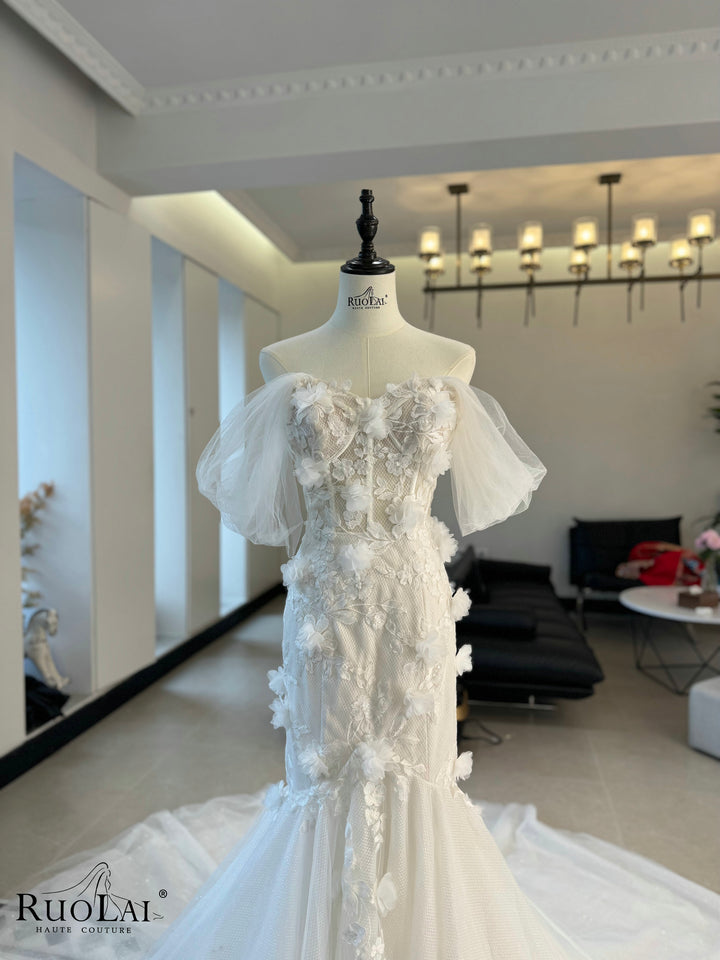 QW02082 Elegant Mermaid Off Shoulder 3d Appliques Bridal Lace Wedding Gown Dress
