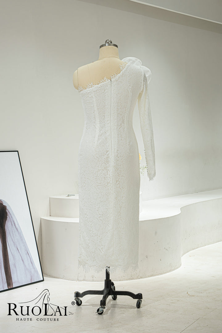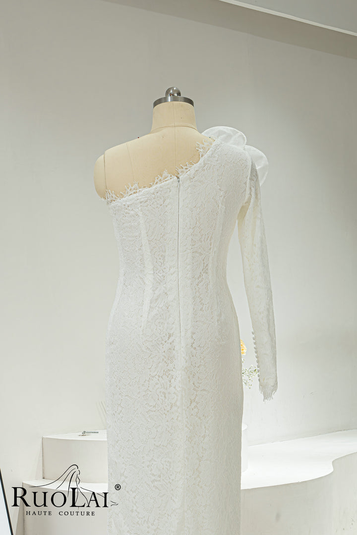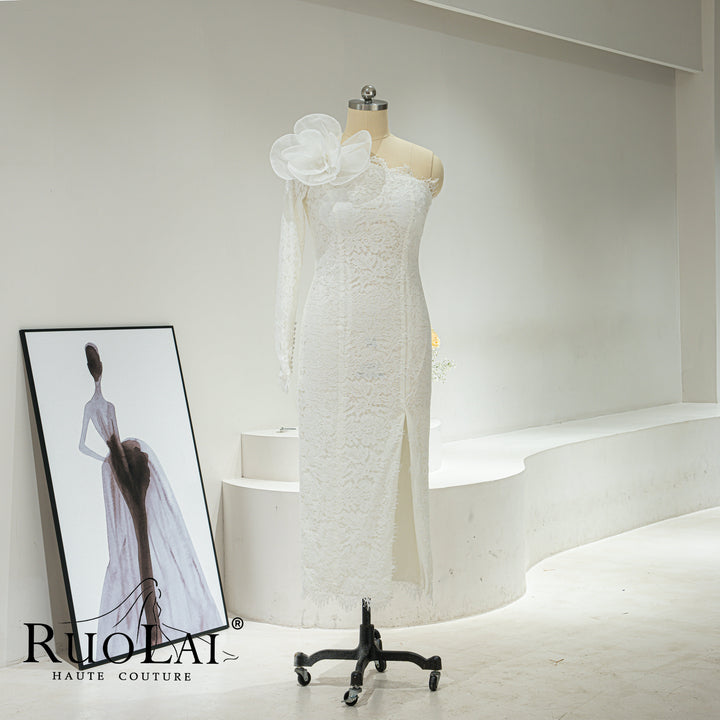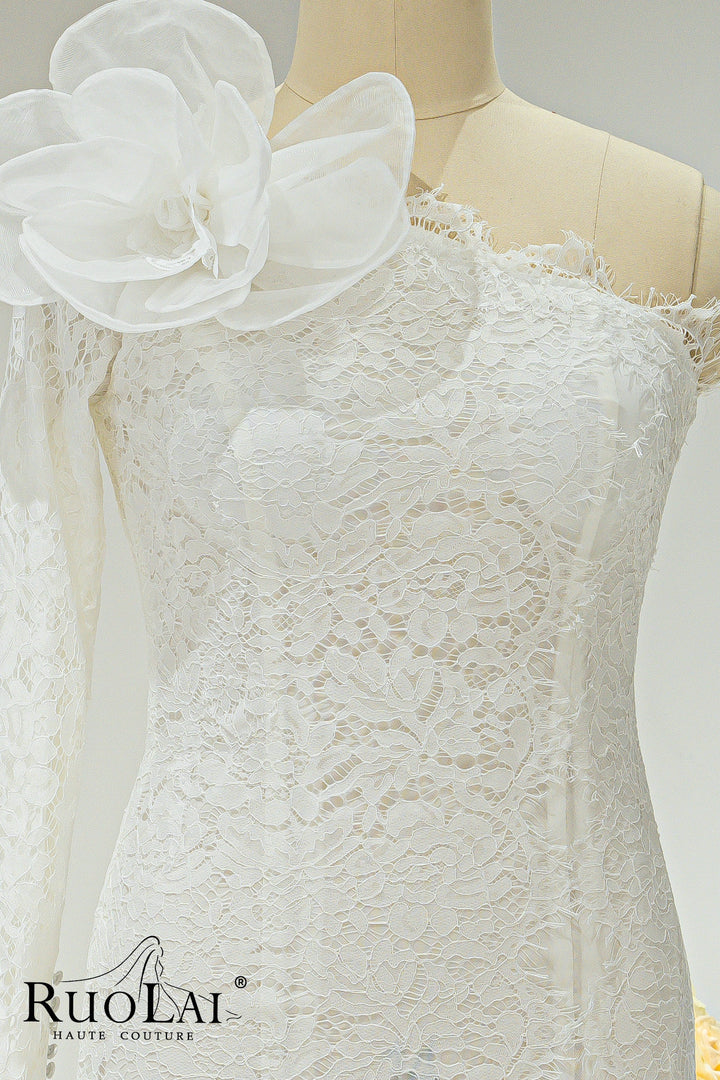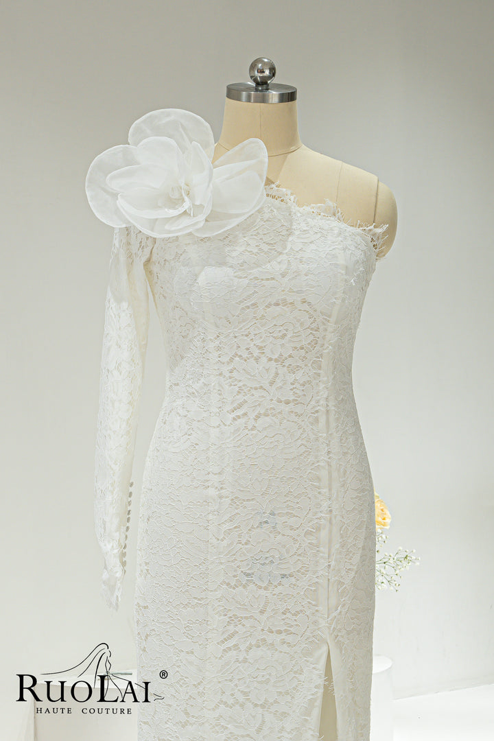 Elegant One-shoulder Asymmetric Sleeves for Women Bridal Dresses Ankle Length Laced with 3D Flower Side Slit Mermaid Wedding Dresses