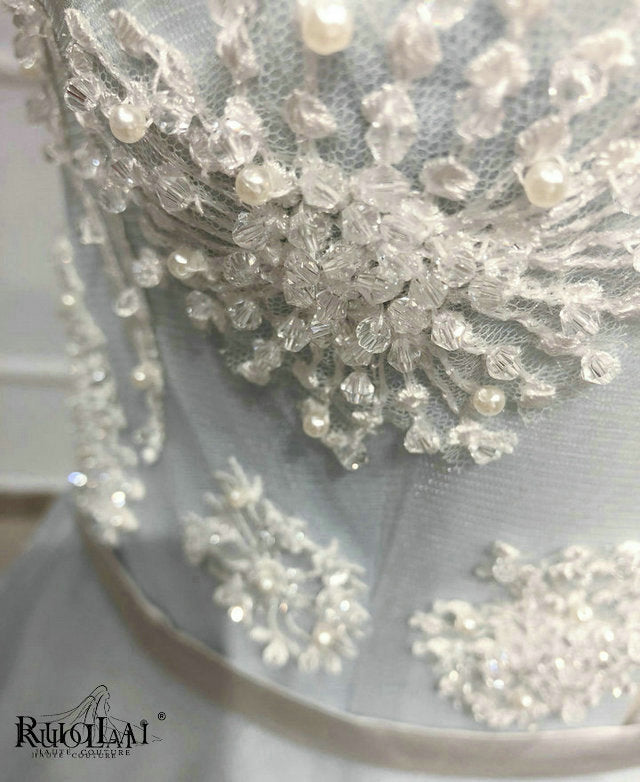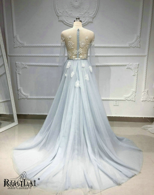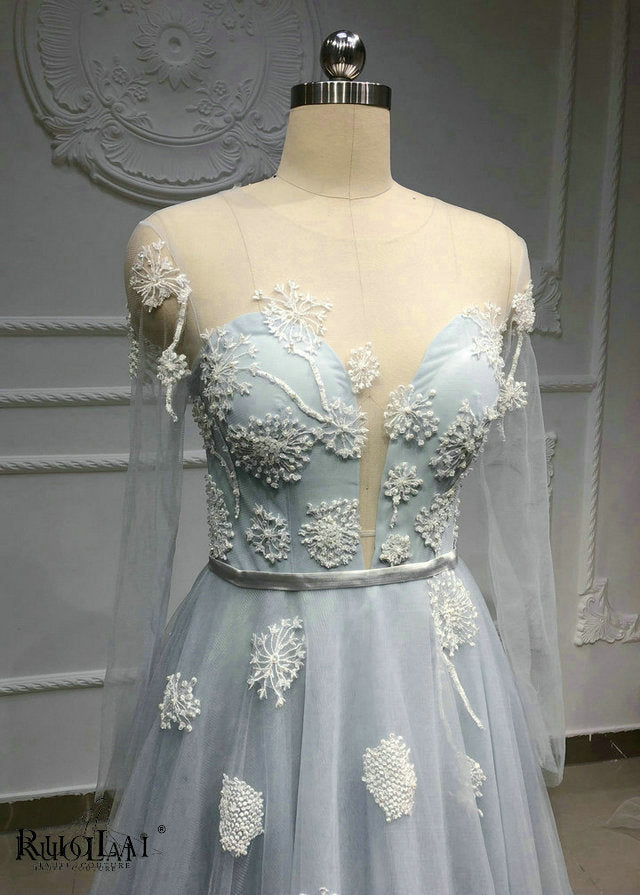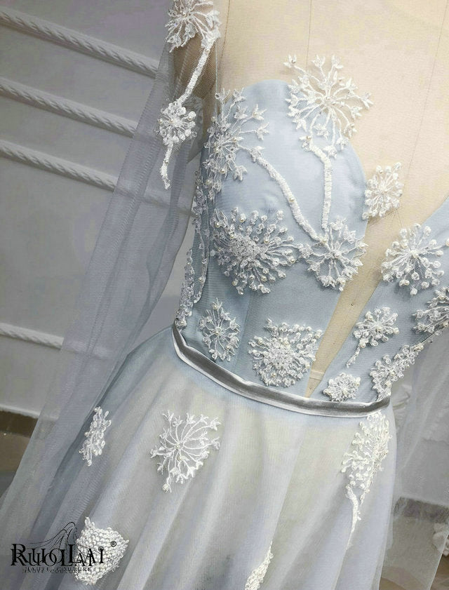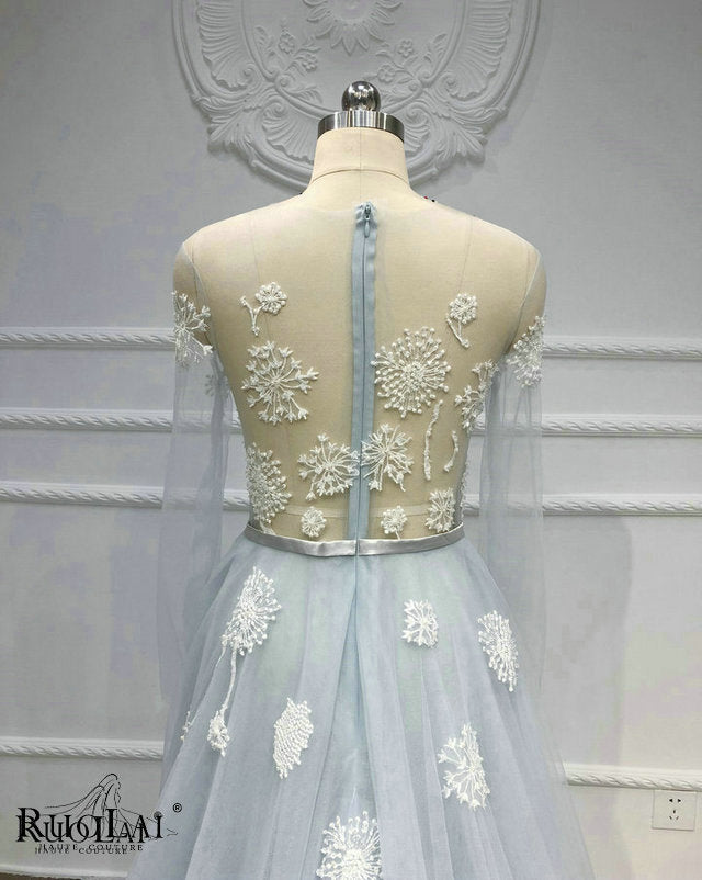 Elegant 3D Flowers Lace Tulle Scoop Neck with Cape Sleeves Light Blue Party Dresses Floor Length Evening Gown Dress