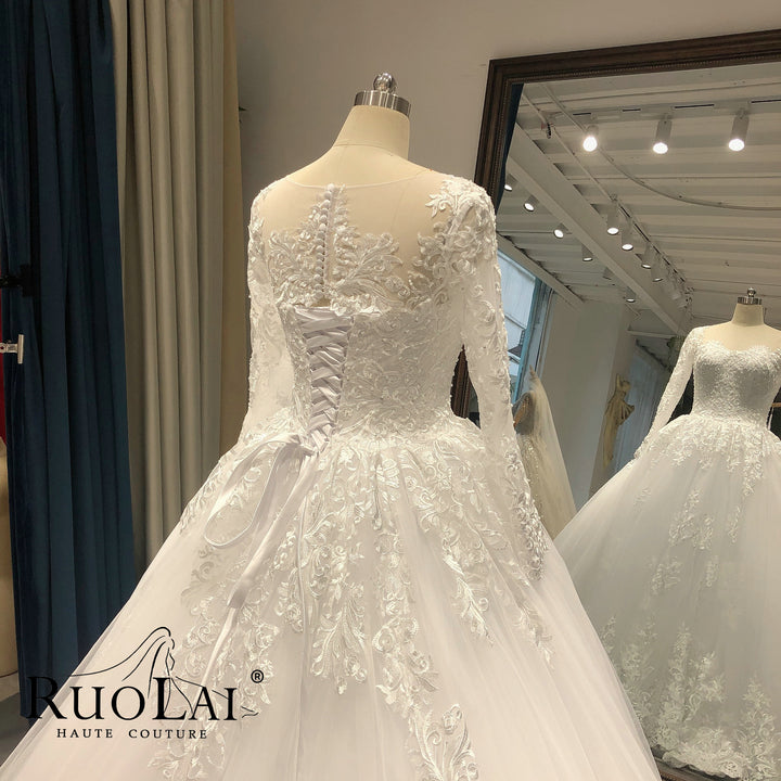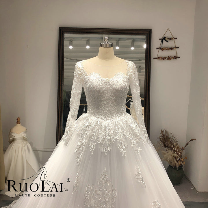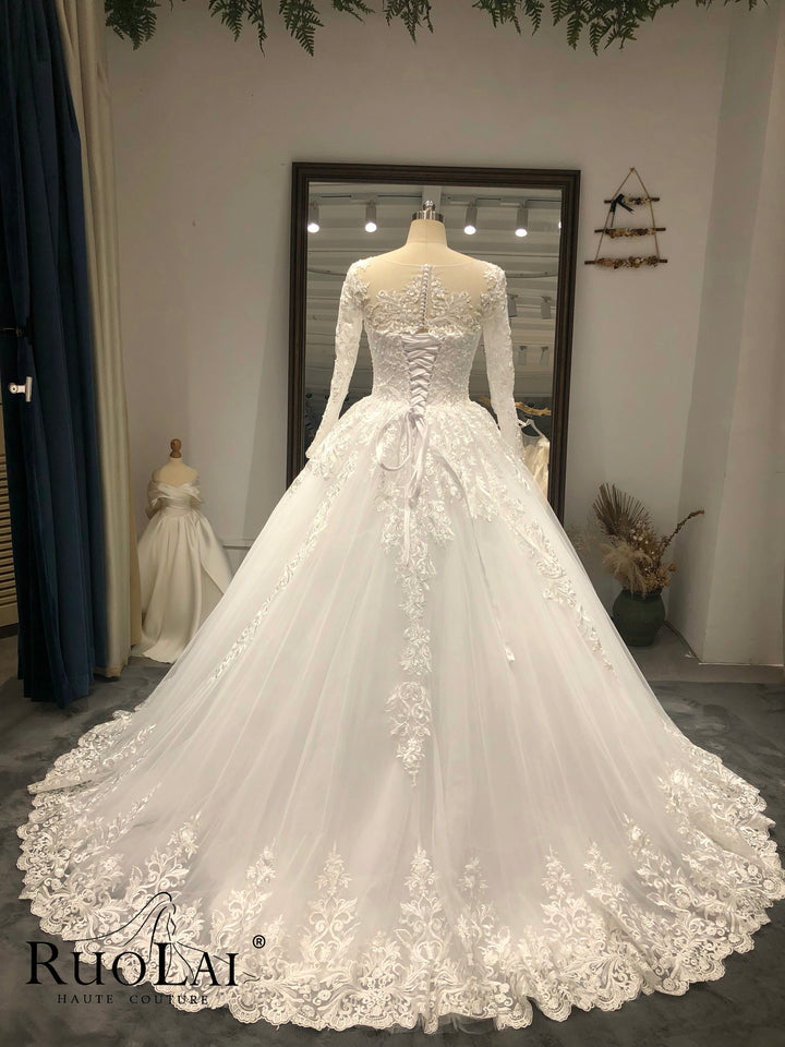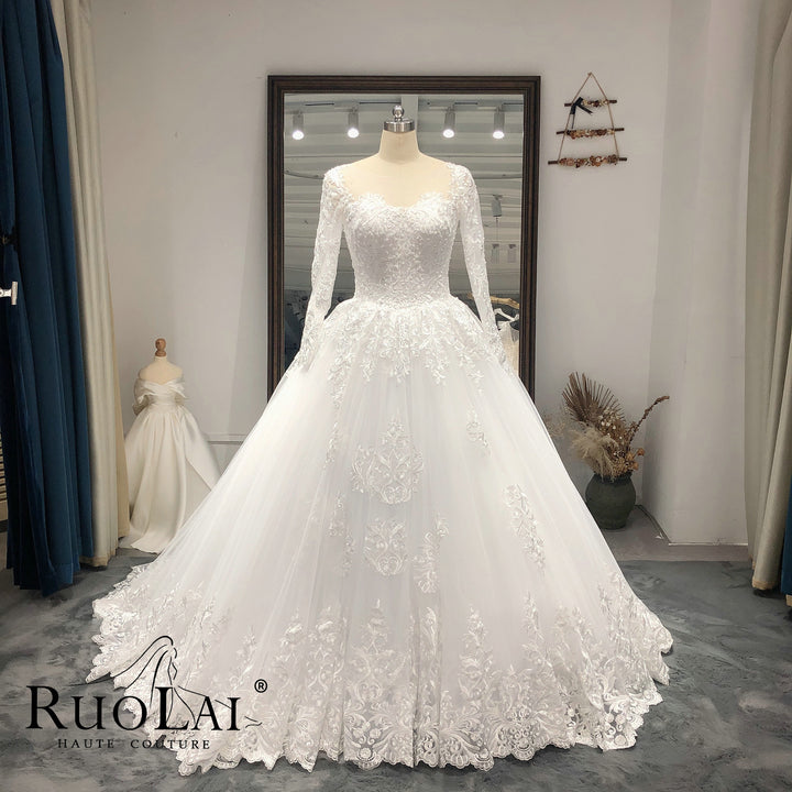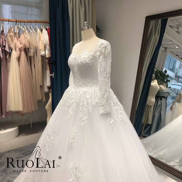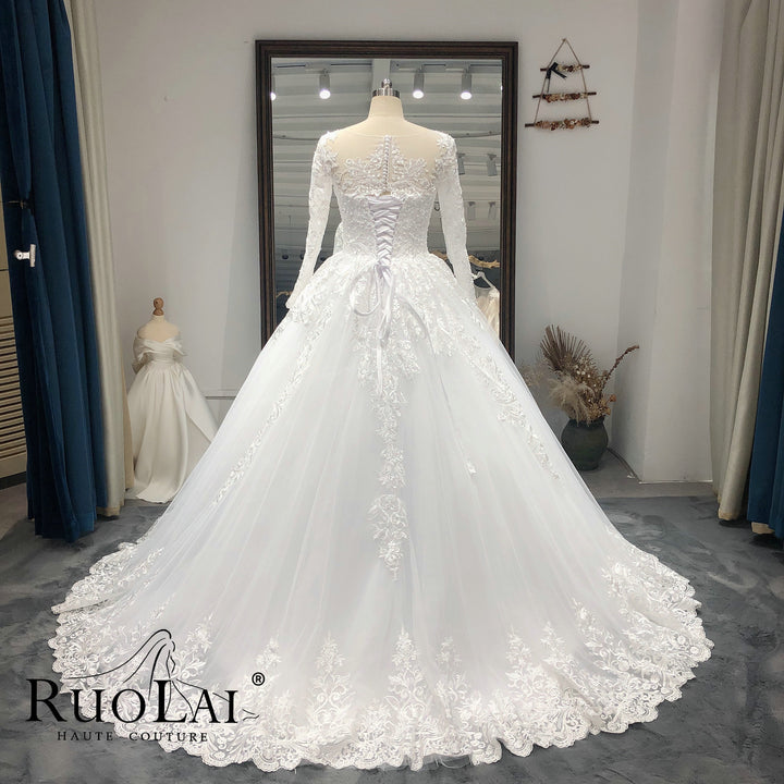 Elegant Scoop Neck with Sweep Train Princess Bride Dress Luxury Lace Appliques Zipper and Lace up Back Wedding Gown Customized Vestido De Noiva