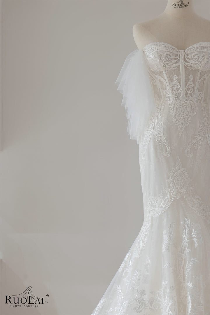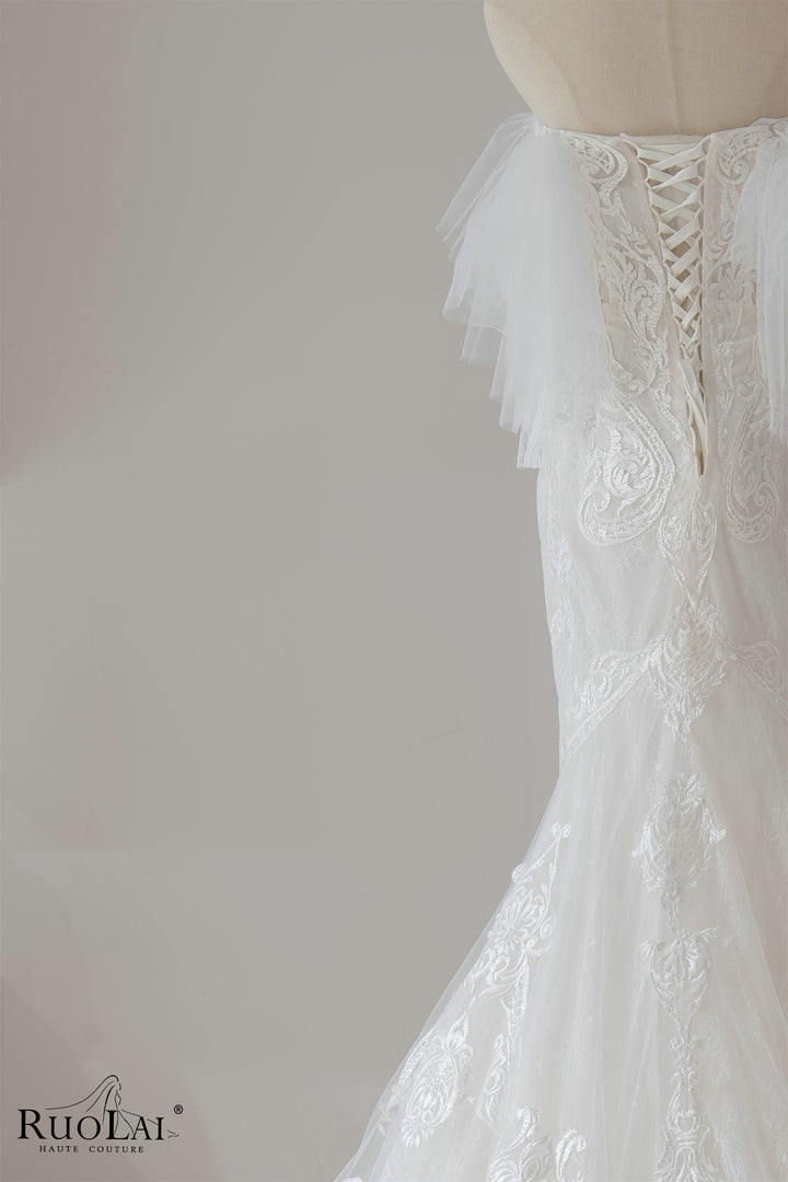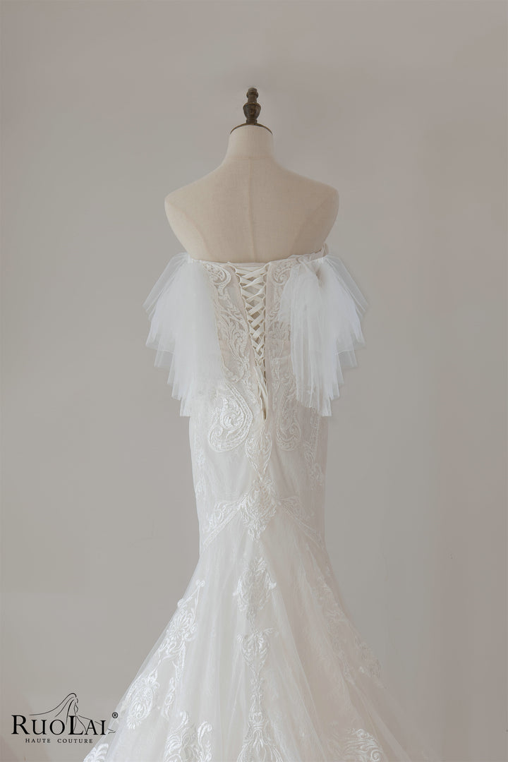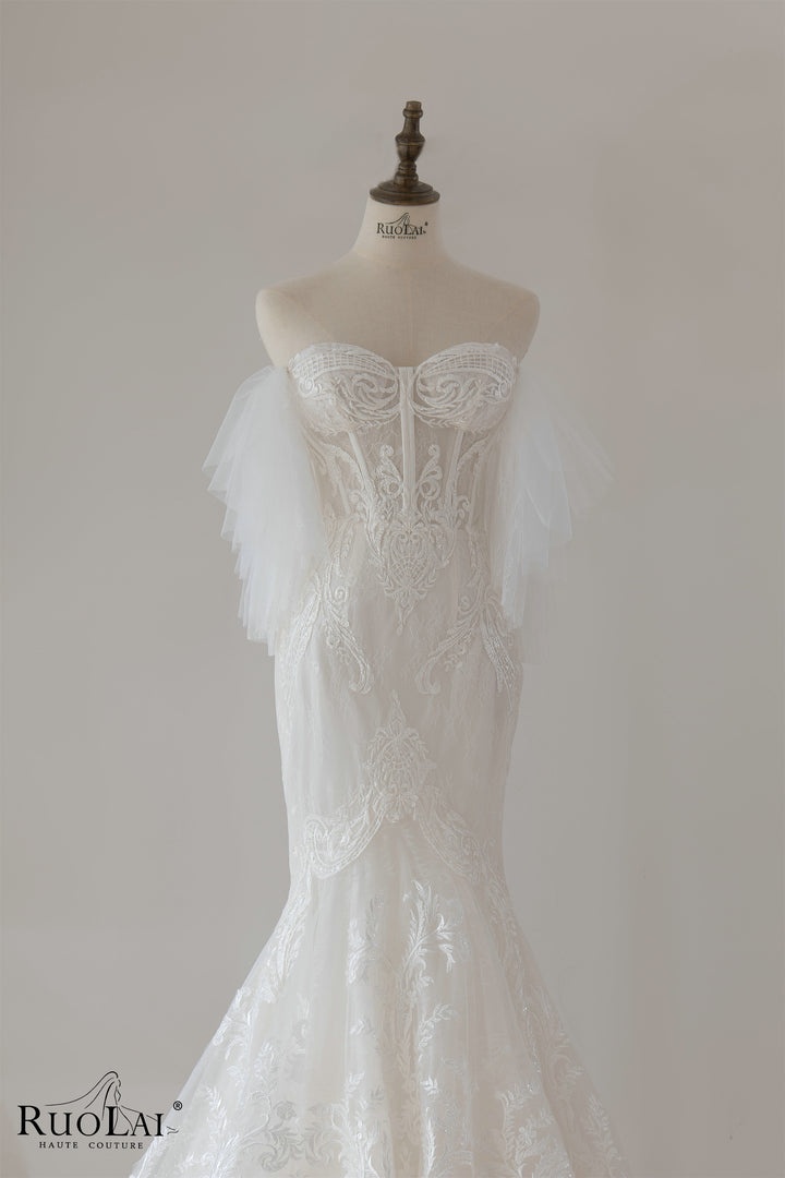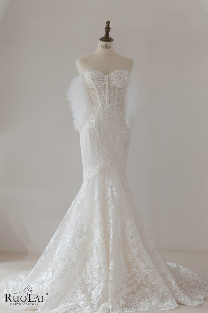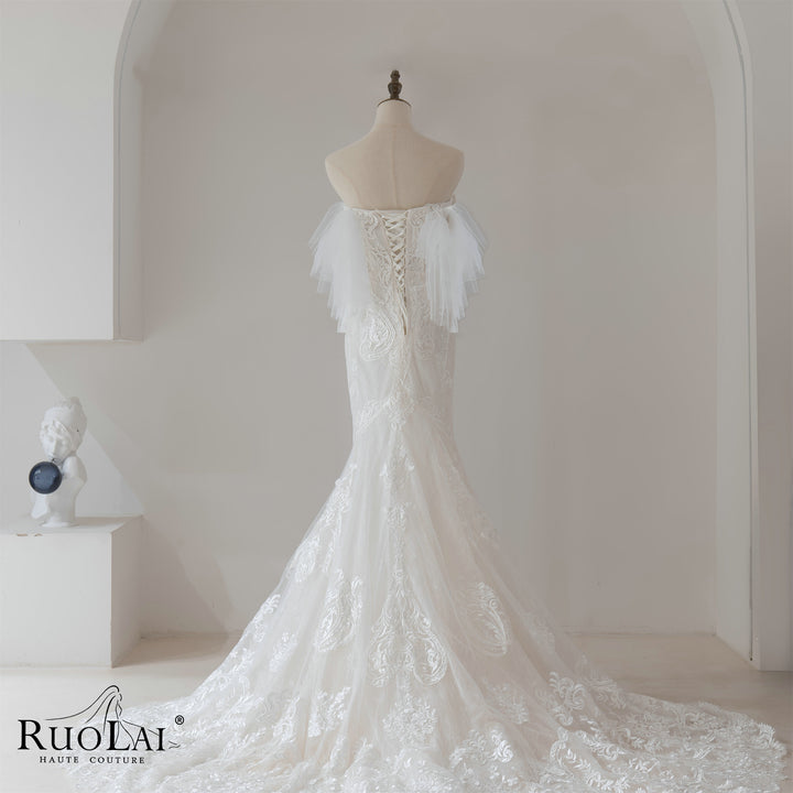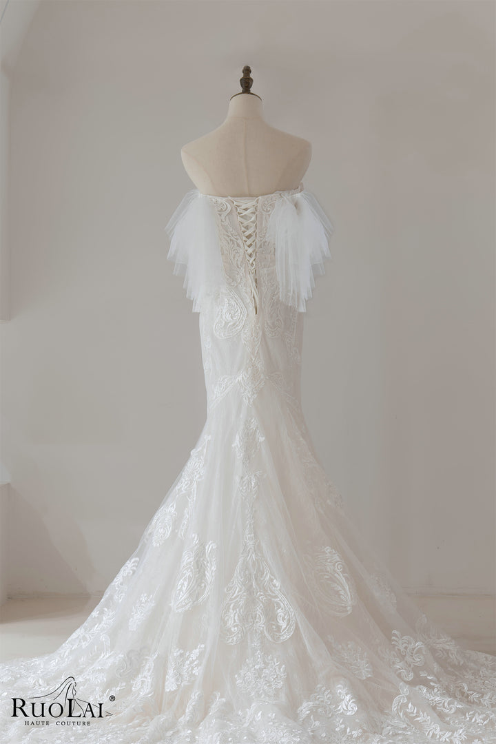 Elegant Slim Luxury Tulle Mermaid Wedding Dresses For Women Off The Shoulder Strapless with Feather Bridal Gown.