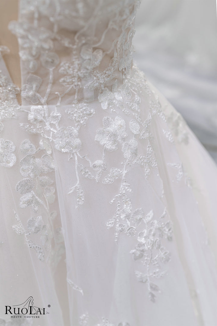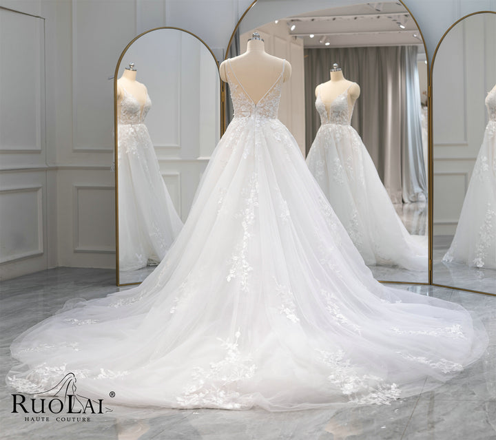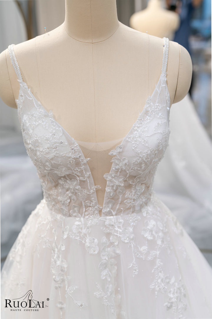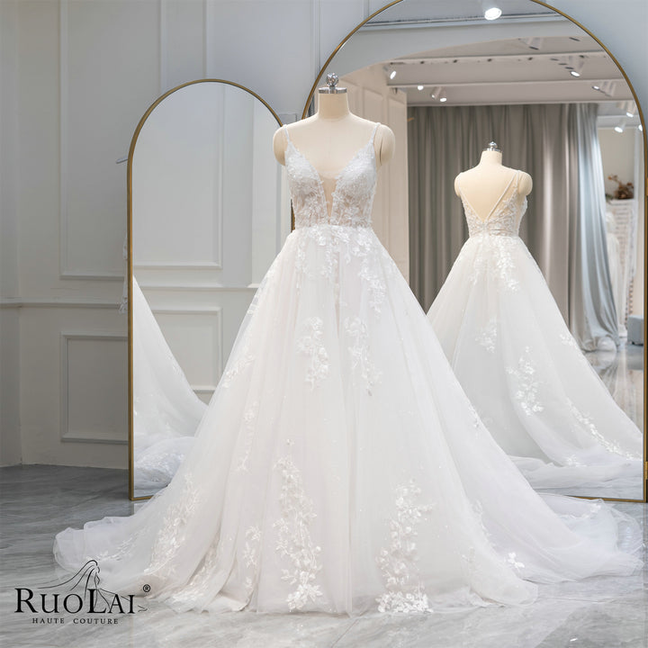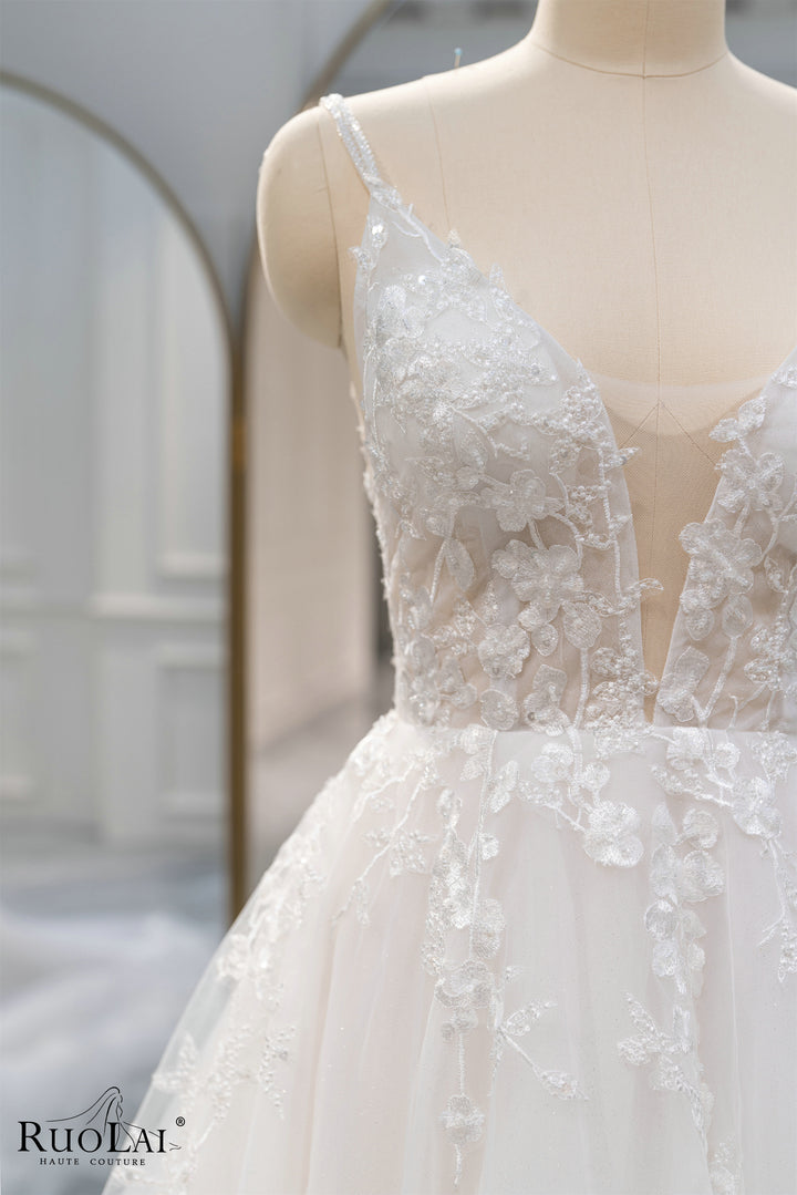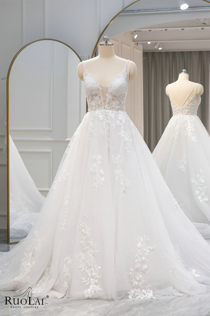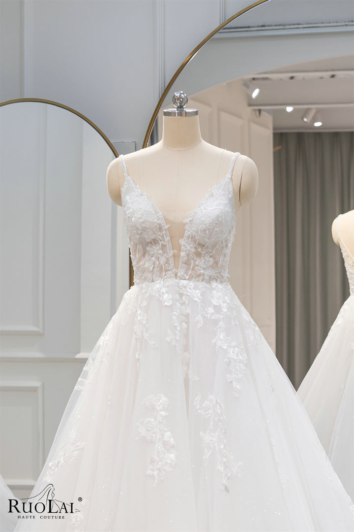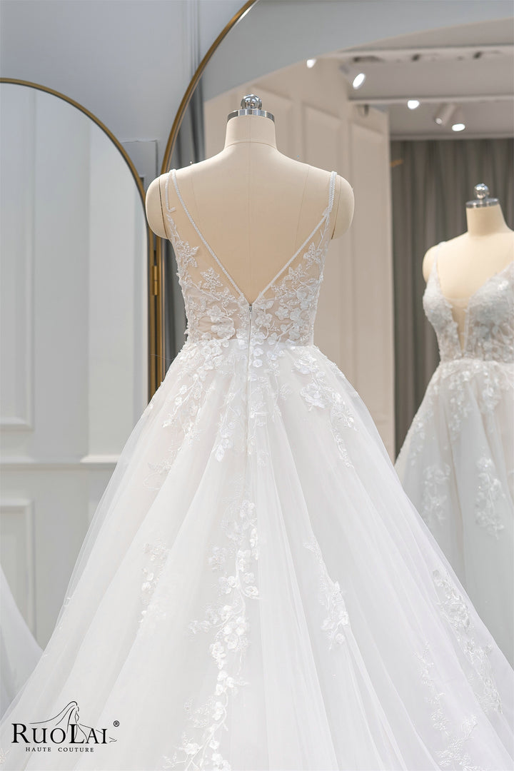 QW01712 Elegant Spaghetti Straps Deep V Neck Appliques Lace Wedding Gown