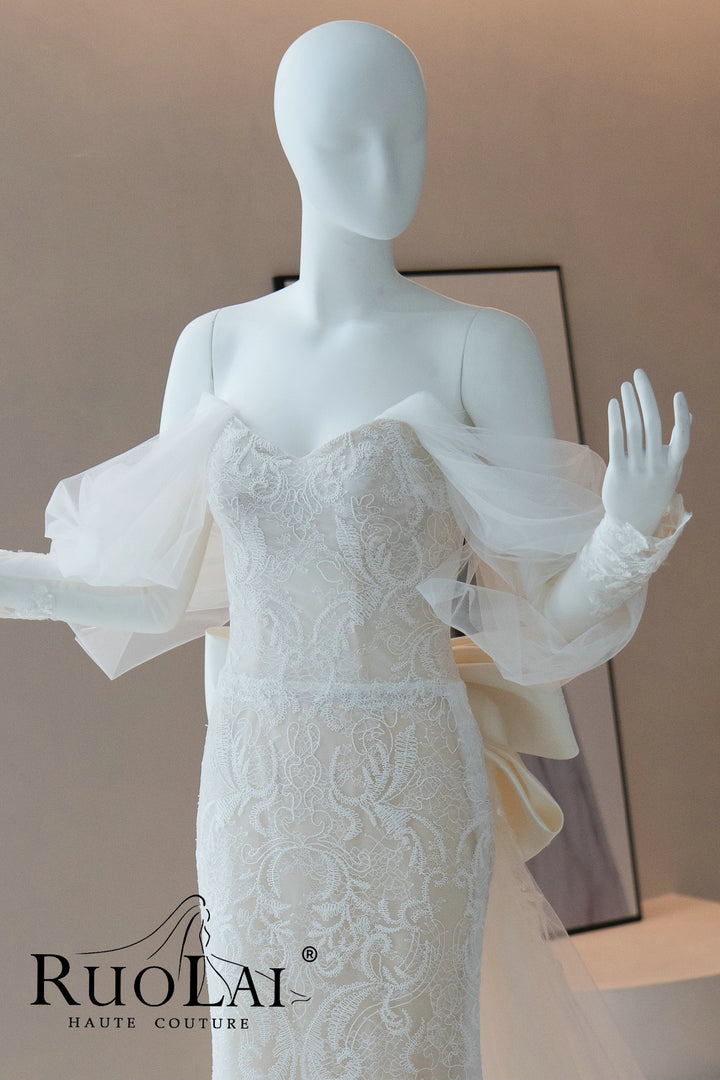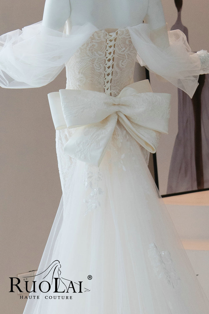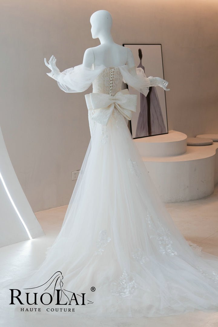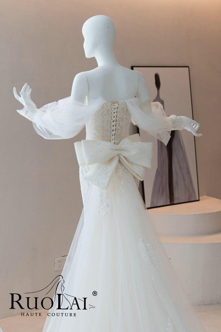 Elegant off shoulder sweetheart neck long sleeve mermaid wedding dress high quality lace back with large bow 2 in 1 tail bridal gown.