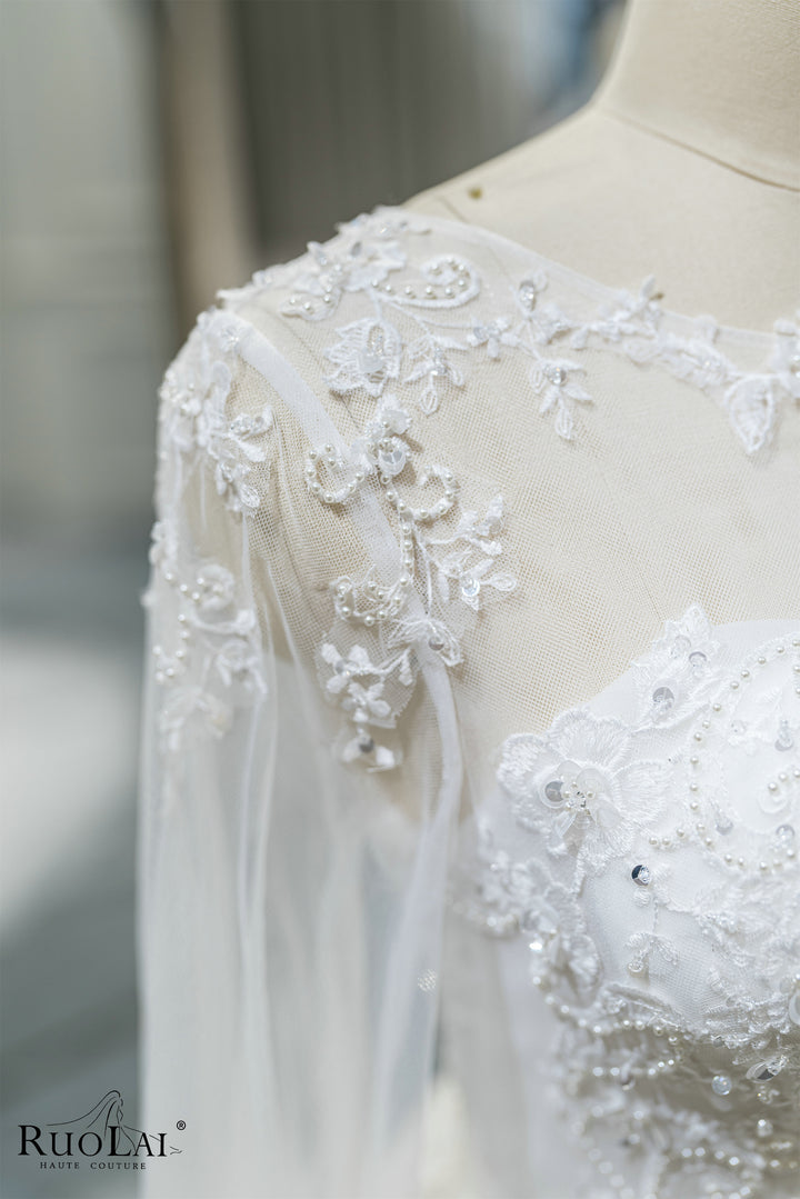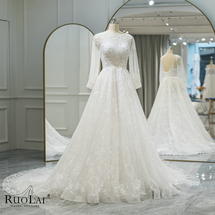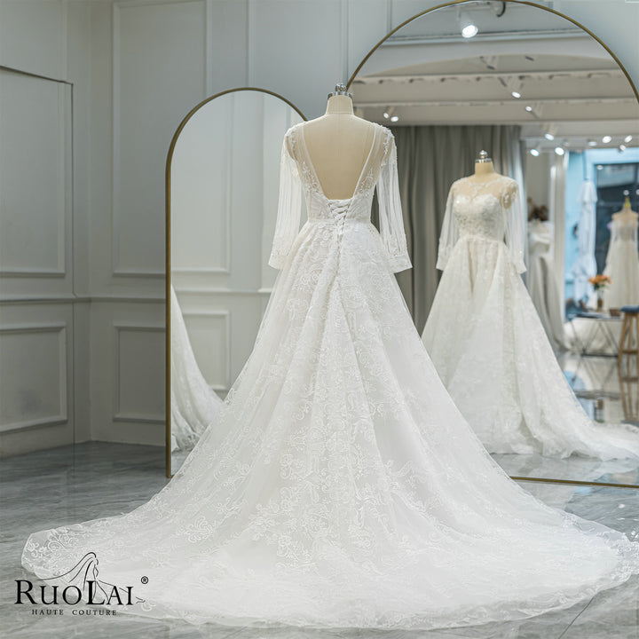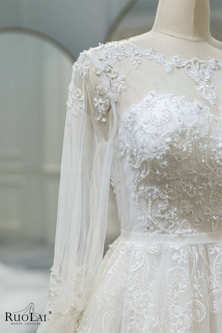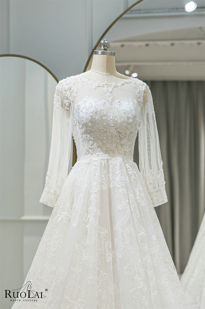 QW01670 Elegant Vintage Lace O Neck Illusion Long Sleeve Wedding Dress