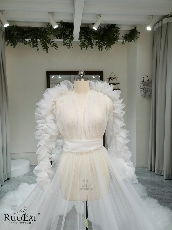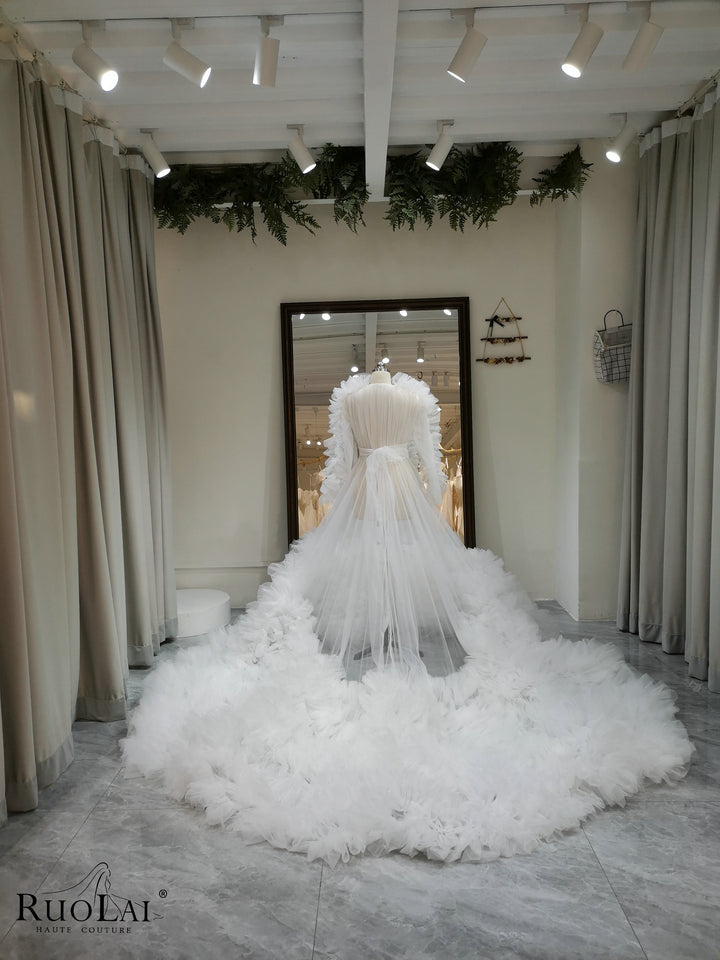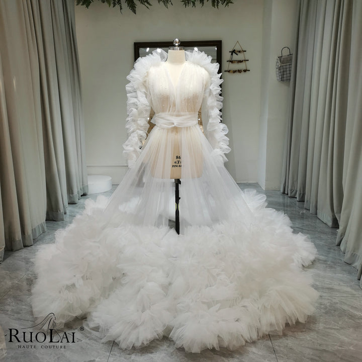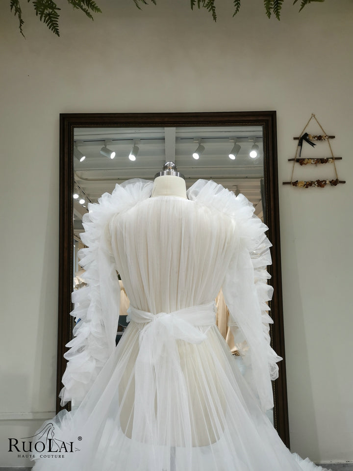 White V Neck Bridal Robe Wedding Dresses Women Customized High Quality Tulle Ruffles Wedding Fluffy Party Sleepwear