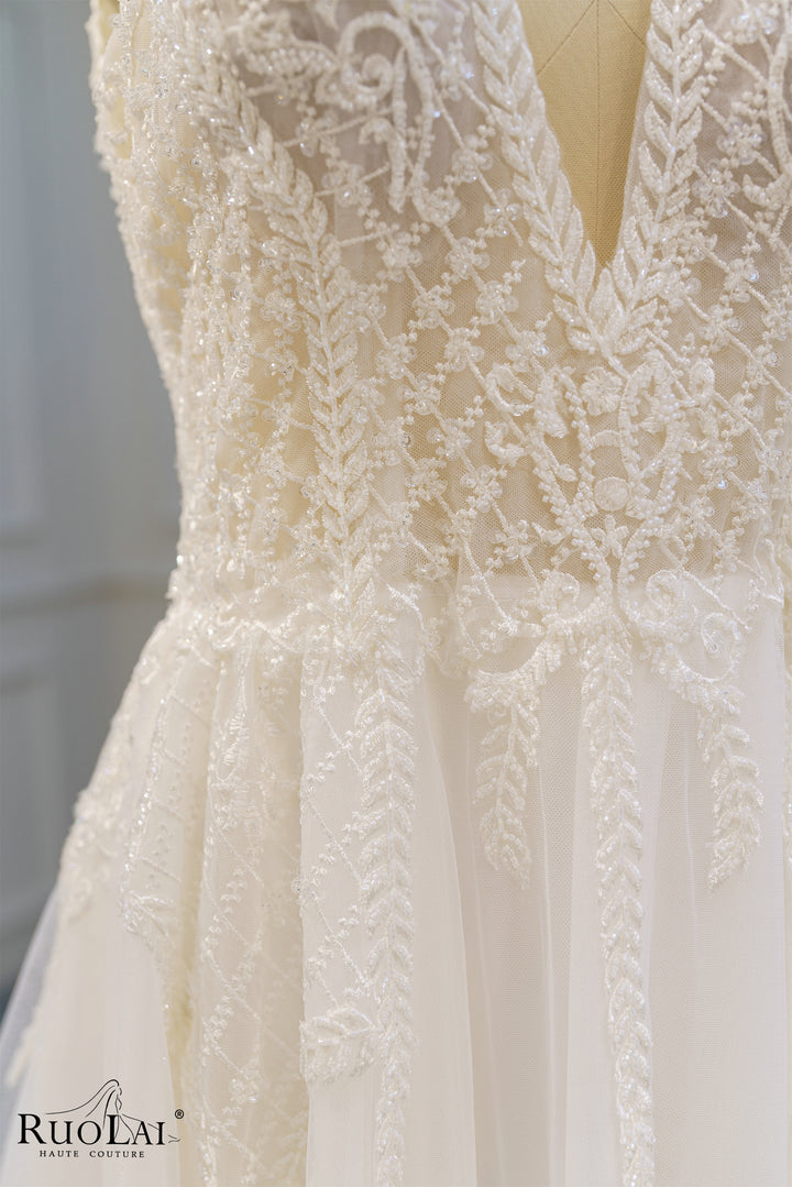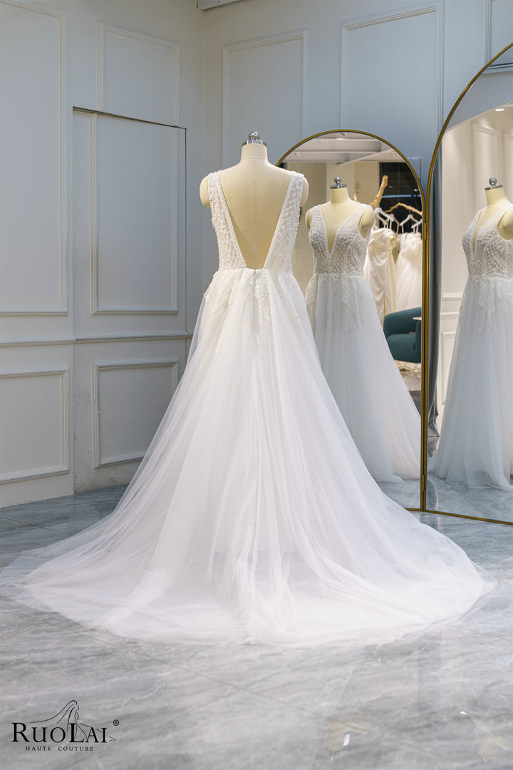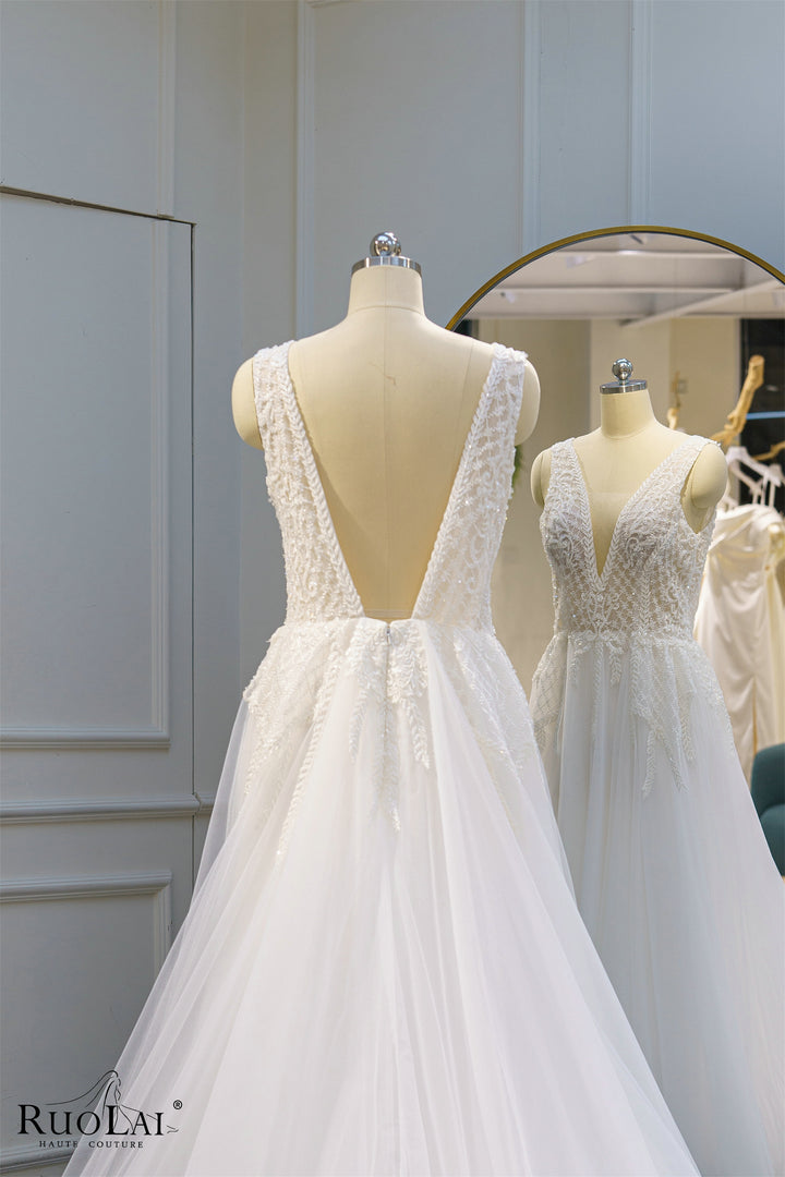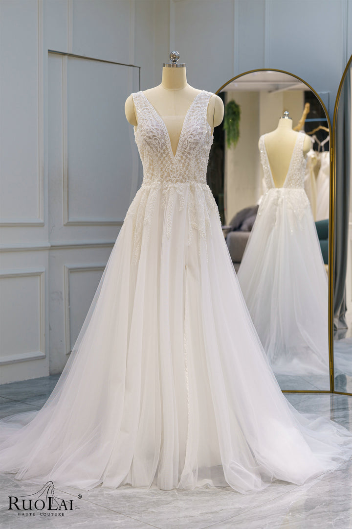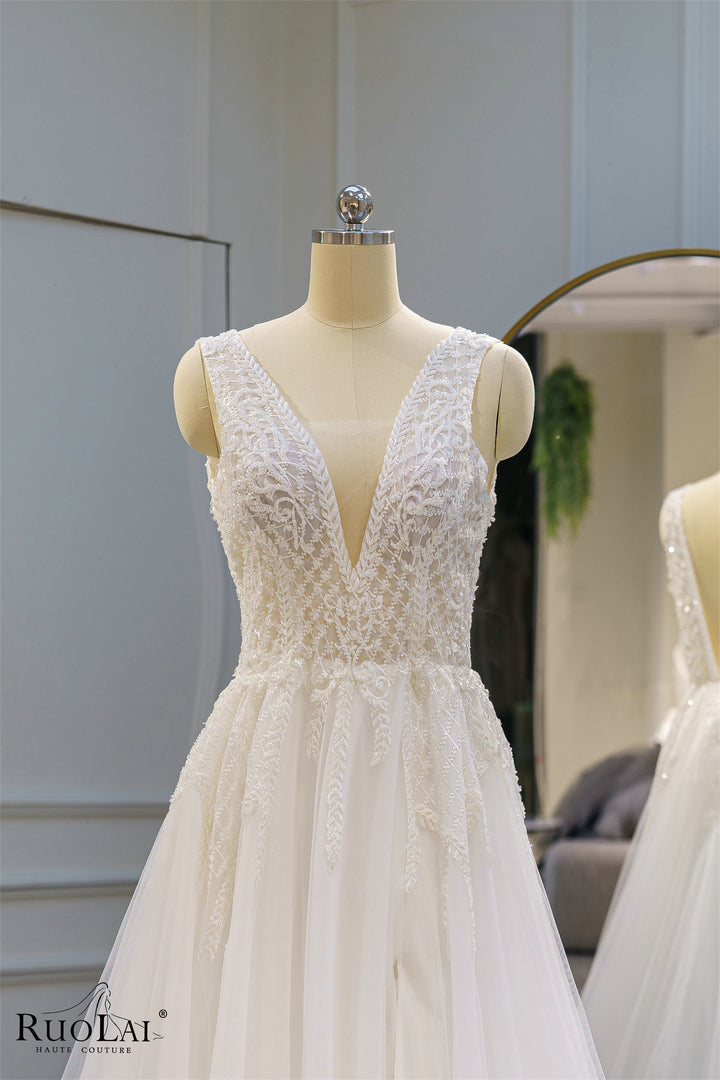 QW01609 Exquisite Deep V-Neck Lace Sleeveless Tulle Wedding Gown