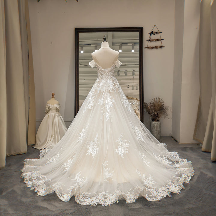 This elegant and charming wedding dress has an A-line silhouette, off-the-shoulder design and delicate lace appliqués, adding a touch of romance and sophistication.