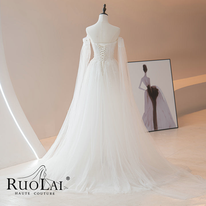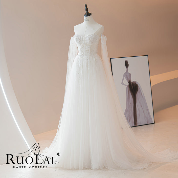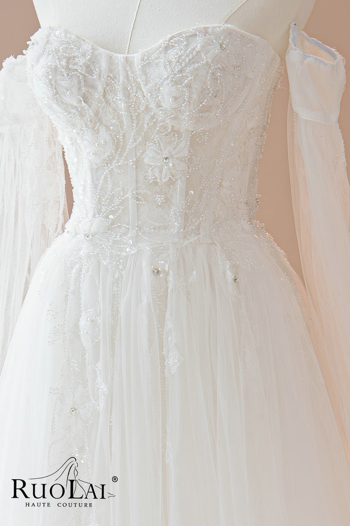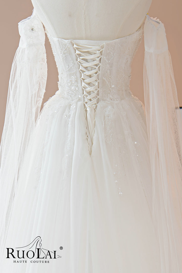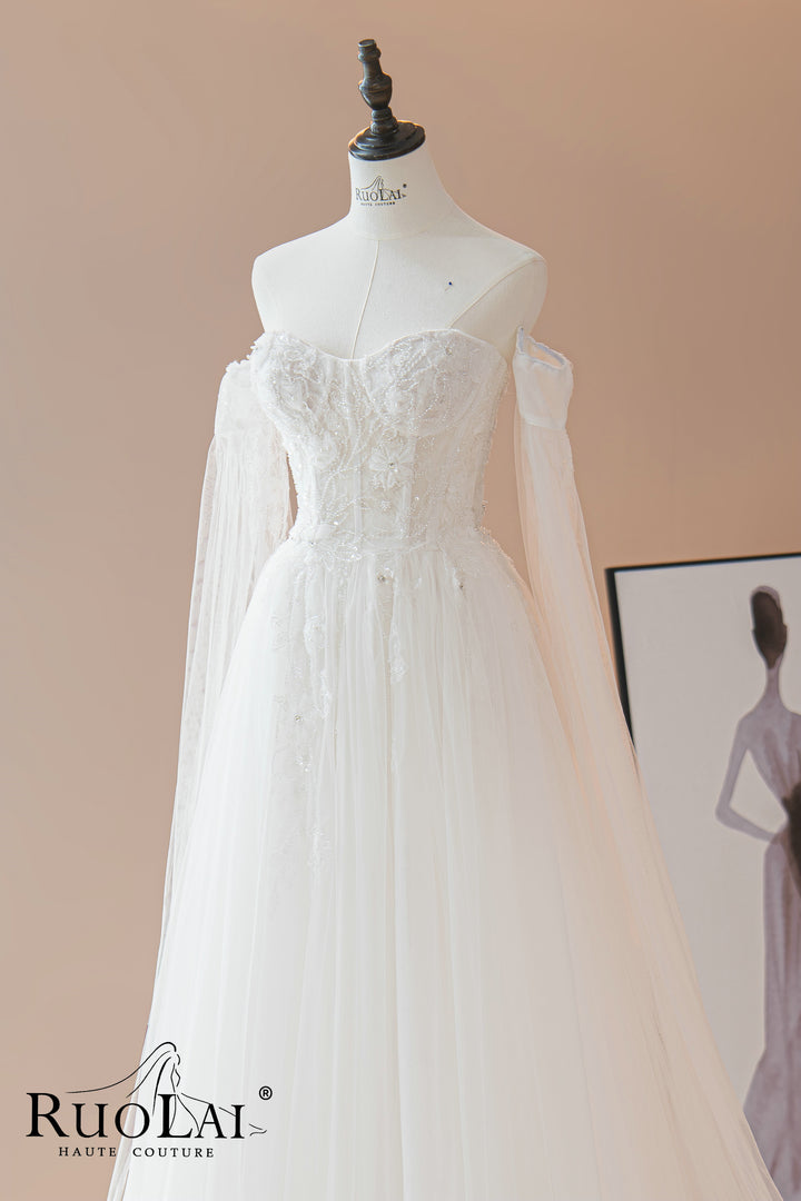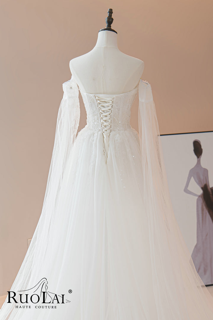 Glamorous Off The Shoulder Sweetheart Neckline Tulle A Line Wedding Dresses for Bride Lace Up Back with Long Puffy Tulle Sleeve Elegant Bridal Gowns