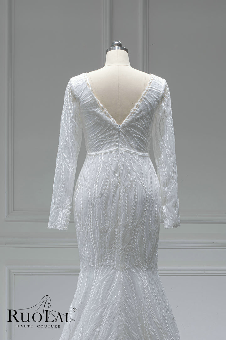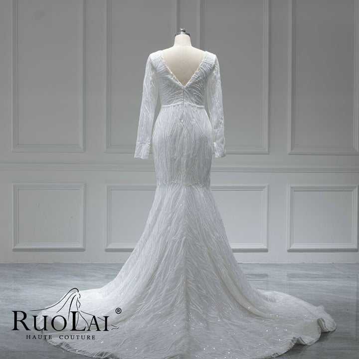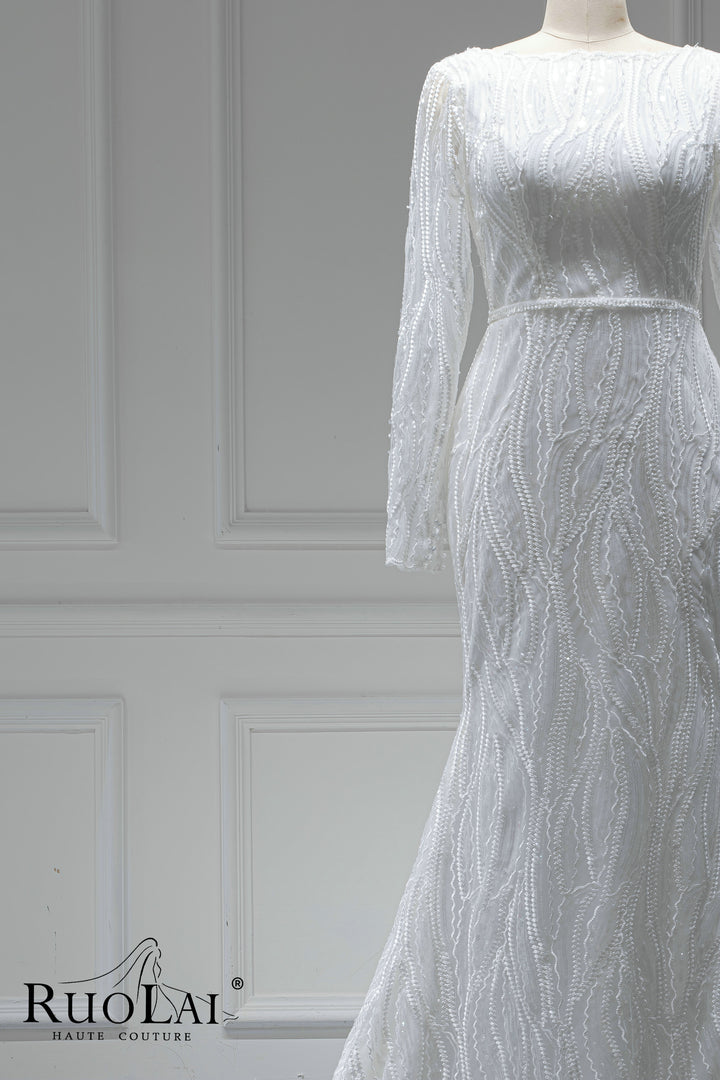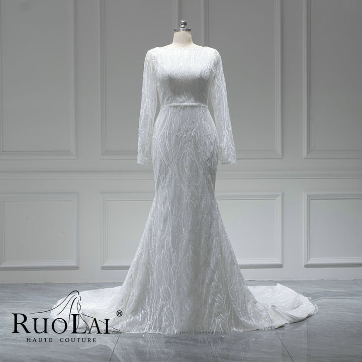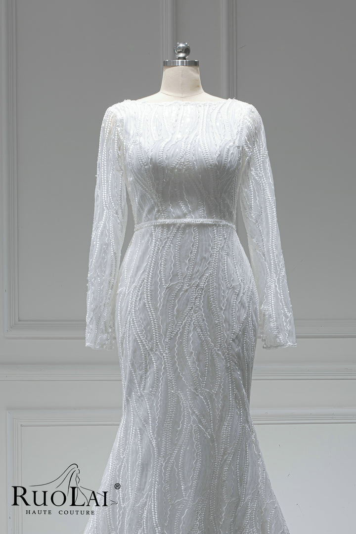 Modest High-Neckline Sequins Wedding Dresses Mermaid Lace Glitter Long Sleeve with Sash Bridal Gowns Vestido De Novia