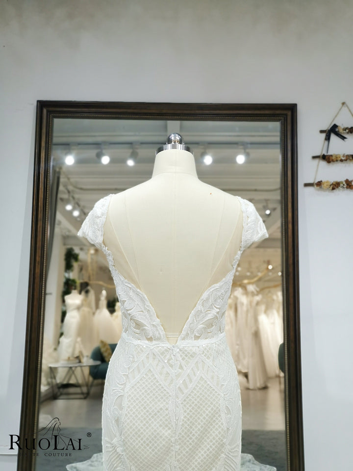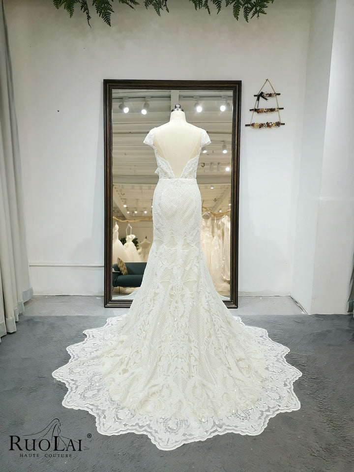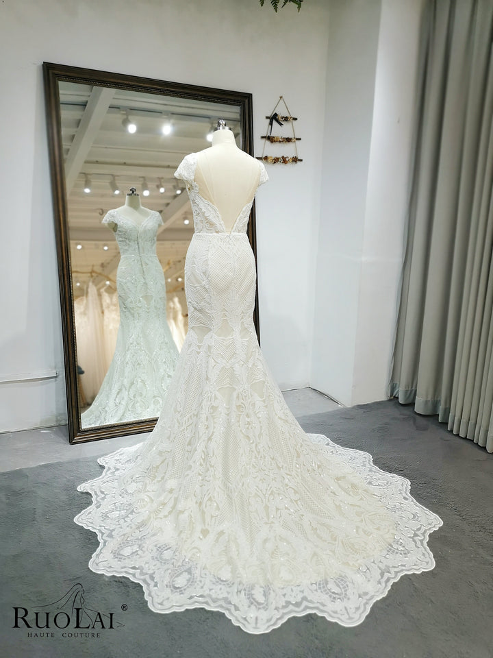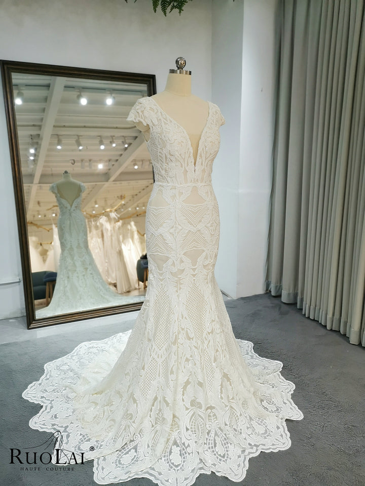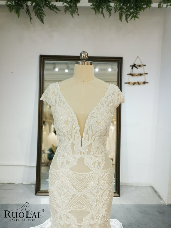 Gorgeous Deep V Neck Special Sequin Lace Mermaid Wedding Dresses