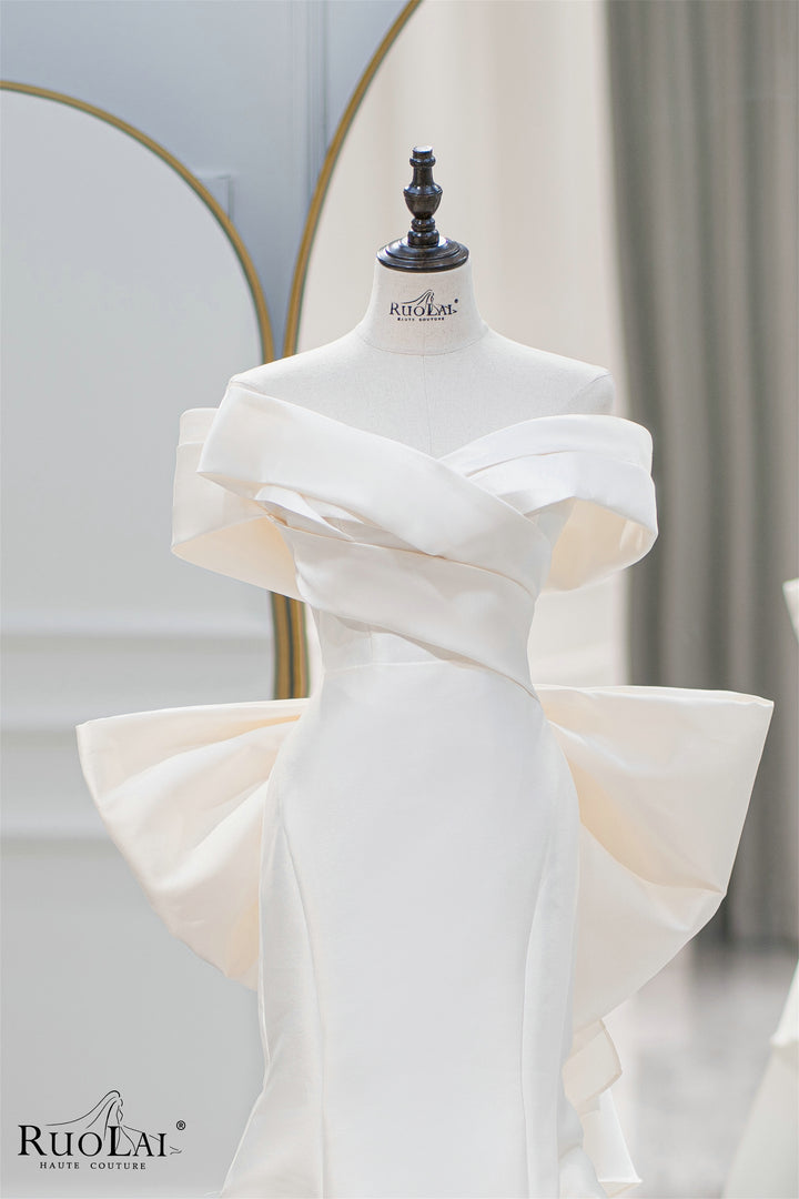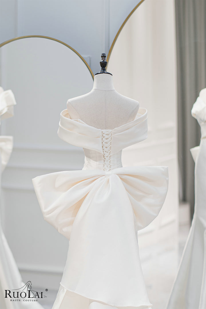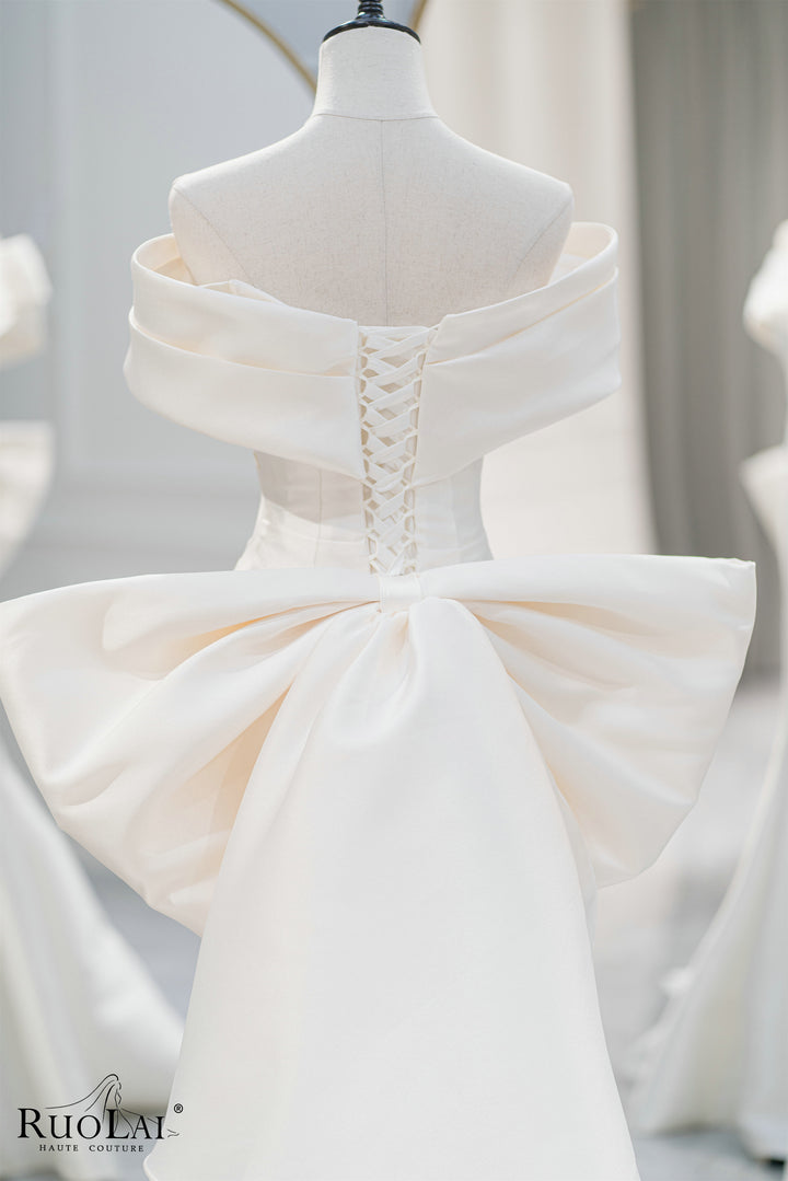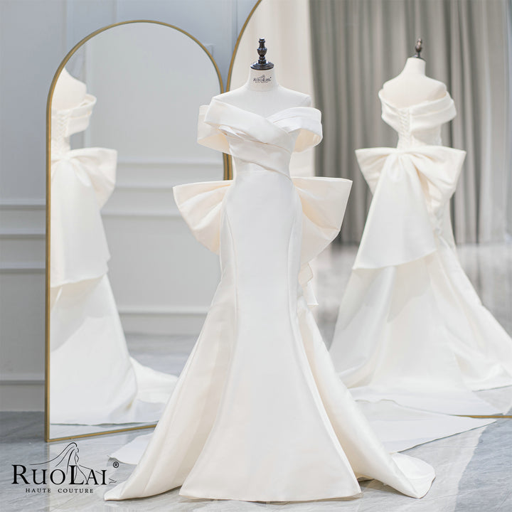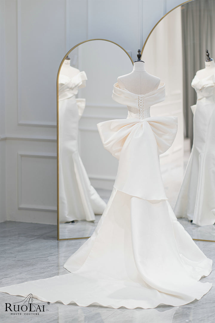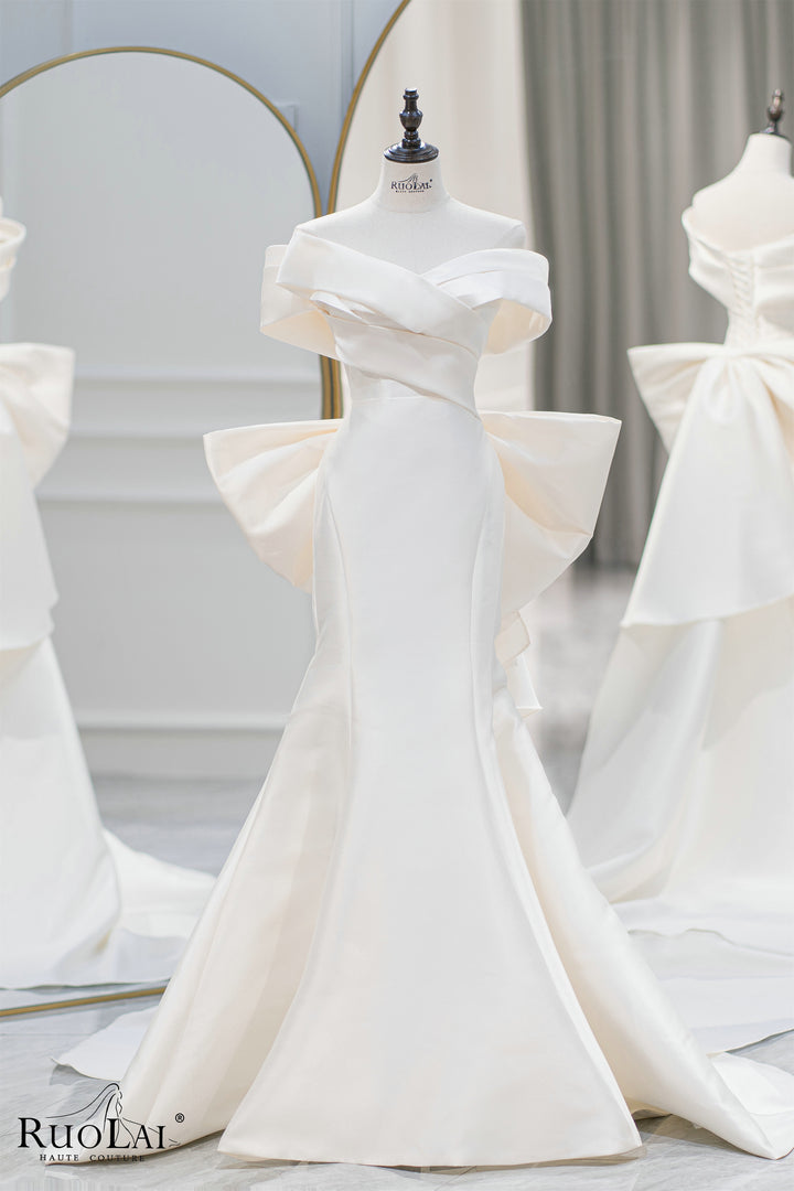 Gorgeous Off The Shoulder Short Sleeve Sweetheart Neck Bow Zipper Up Back Satin Mermaid Wedding Dress Vestido De Noiva Sereia