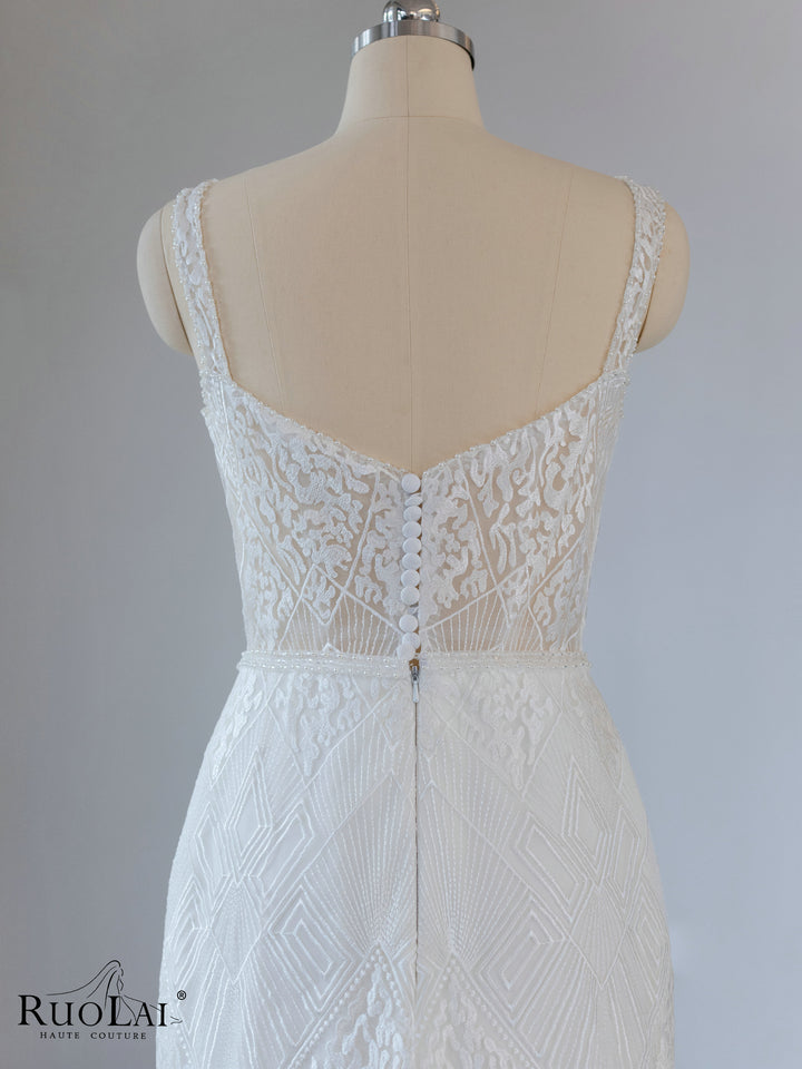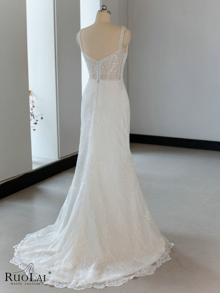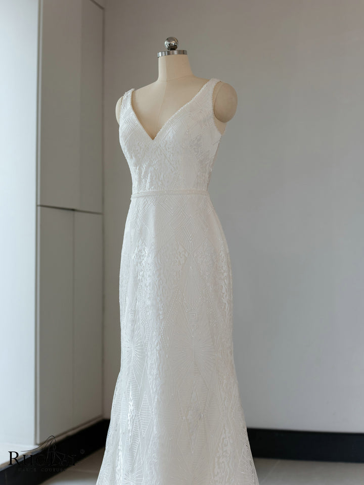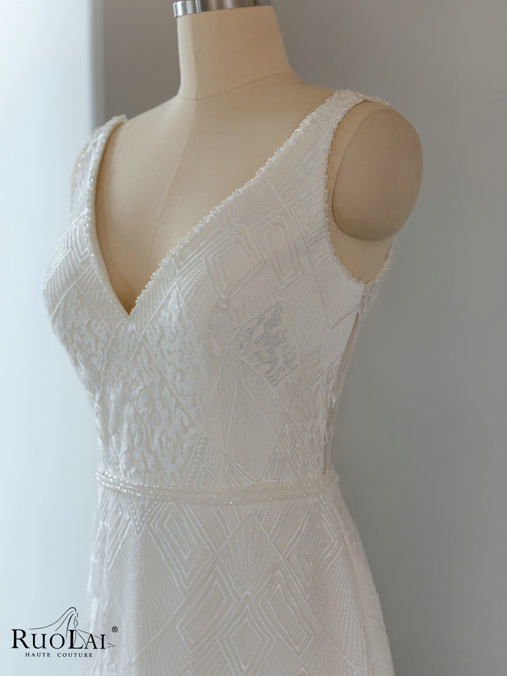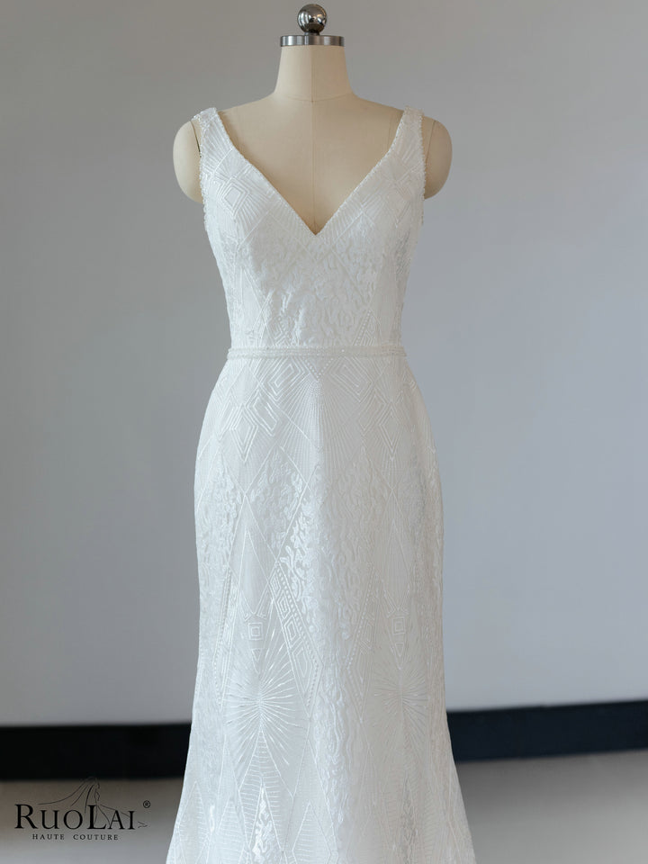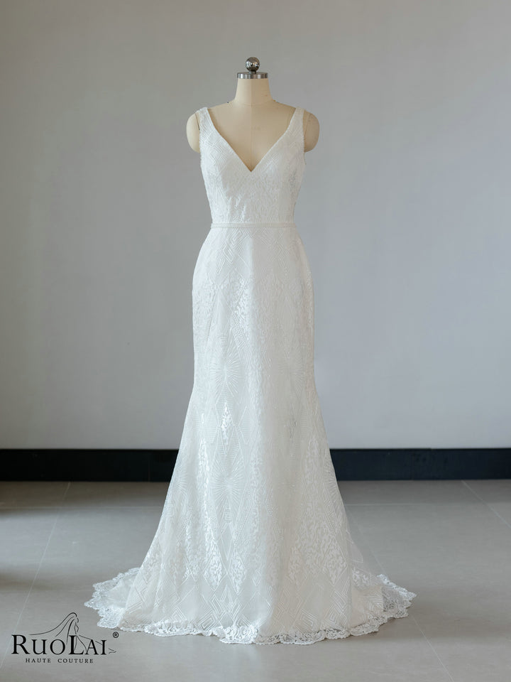 QW02097 Gorgeous Sleeveless V - Collar Lace Mermaid Wedding Dress Gown With Beads